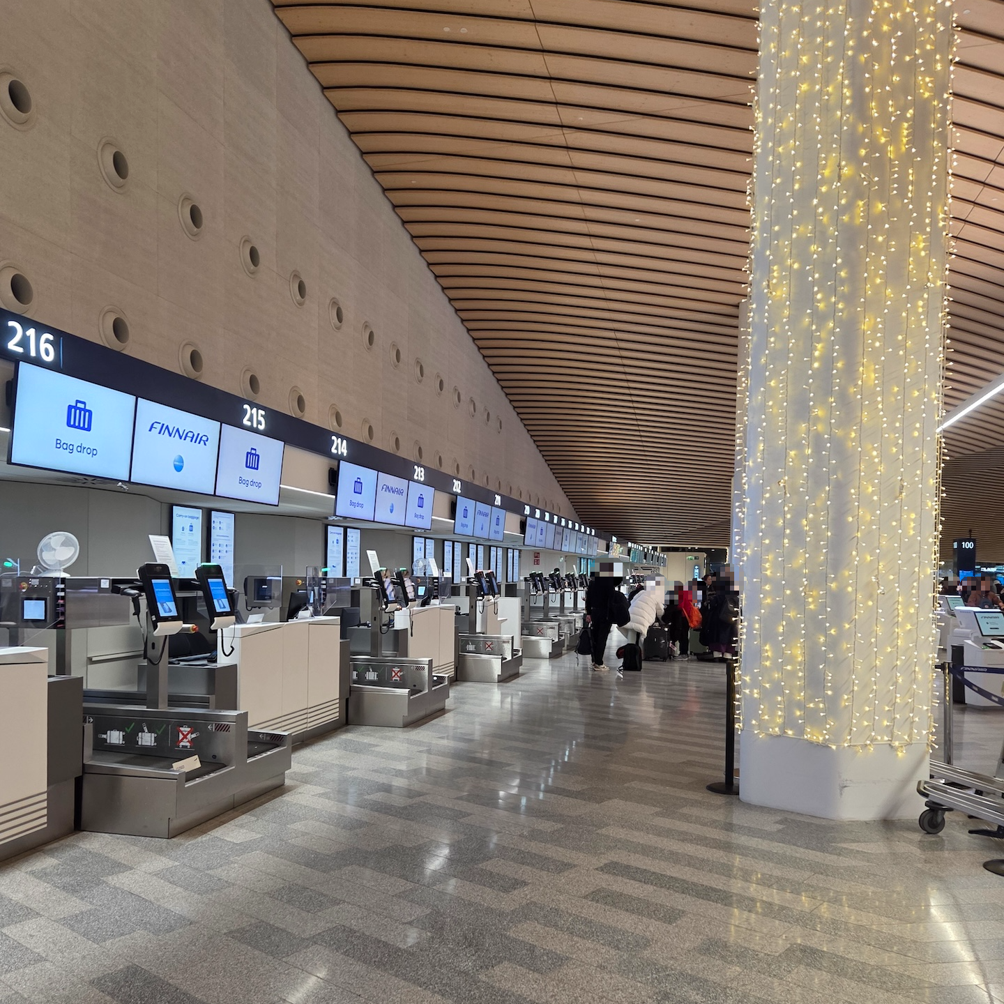 헬싱키 반타 공항의 체크인 카운터는 보안 검색대를 바라본 방향 기준으로 오른쪽에 100번대와 200번대, 왼쪽에 300번대와 400번대가 위치해 있습니다. 핀에어의 체크인은 200번대 카운터에서 이루어집니다. 헬싱키 공항에서 핀에어의 체크인은 기본적으로 셀프 체크인과 백드롭으로 이루어져 있습니다. 헬싱키 반타 공항을 허브로 쓰는 핀에어 답게 수많은 체크인 키오스크가 위치해 있고요, 직원들도 많아서 어렵지 않게 체크인을 할 수 있습니다. 체크인 후에는 201 ~ 210번의 백 드롭 카운터로 가서 짐을 부치면 되고요, 만약 공항 직원에게 체크인을 직접 받아야 하는 상황이라면 211 ~ 217번 카운터로 가시면 도움을 받을 수 있습니다.