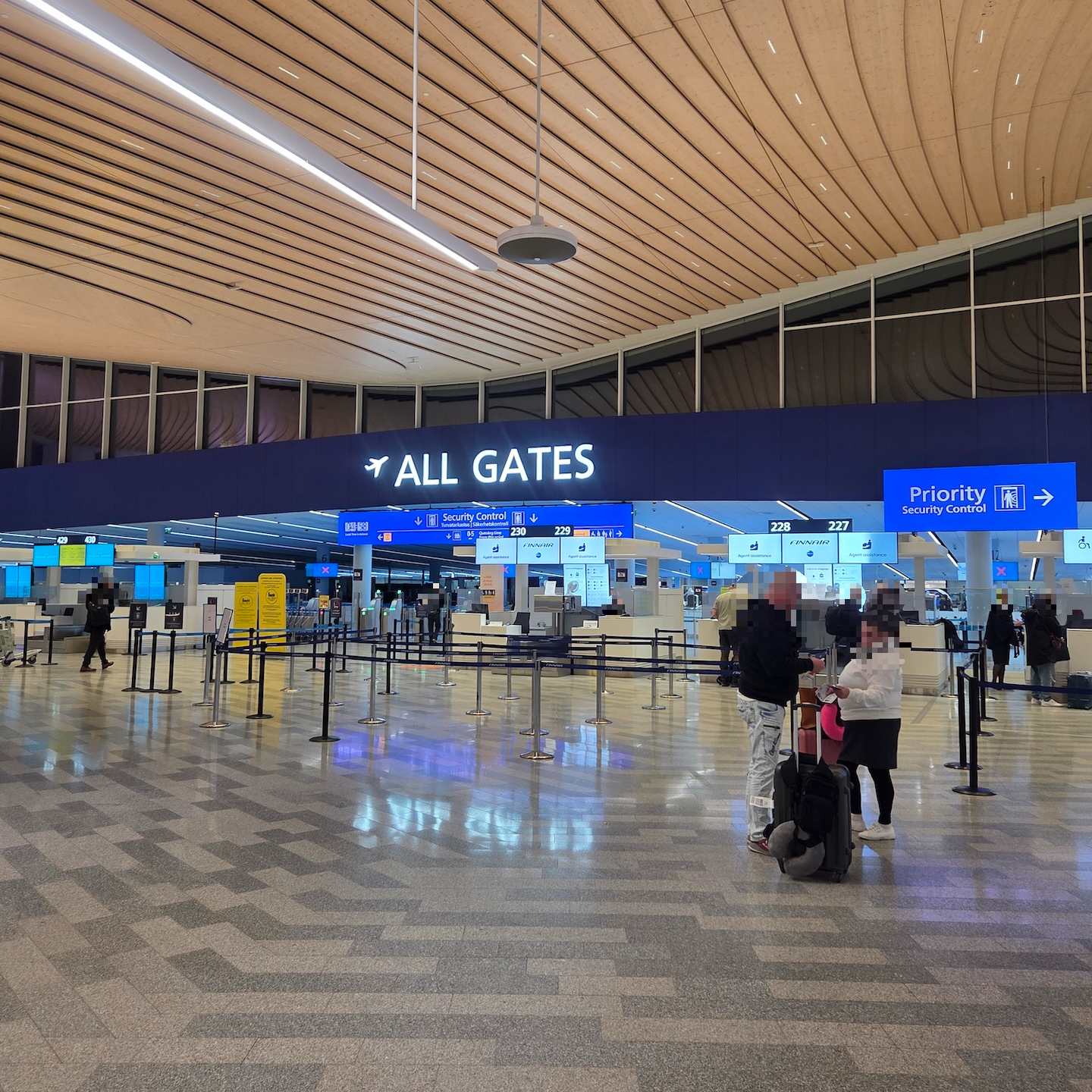 비즈니스 탑승객이나 원월드 루비, 사파이어, 에메랄드 등급 회원, 핀에어 플러스 실버 등급 이상 회원의 경우 우선 수속(Priority) 서비스를 이용할 수 있습니다. 우선 수속 체크인 카운터는 ‘ALL GATES’라고 써 있는 보안검색대 기준 우측에 위치하고 있습니다. 또한 원월드 에메랄드 등급 회원에게만 일반적으로 우선 보안검색 서비스를 제공하는 것과는 달리 핀에어는 원월드 사파이어 등급 회원에게도 우선 보안검색 서비스를 제공하는지, 저도 원월드 사파이어 등급으로 우선 보안검색을 받을 수 있었습니다. 일반 보안검색대도 사람이 많은 편은 아니었지만, 우선 보안검색대는 사람이 거의 없어서 편하게 보안검사를 받을 수 있었습니다.