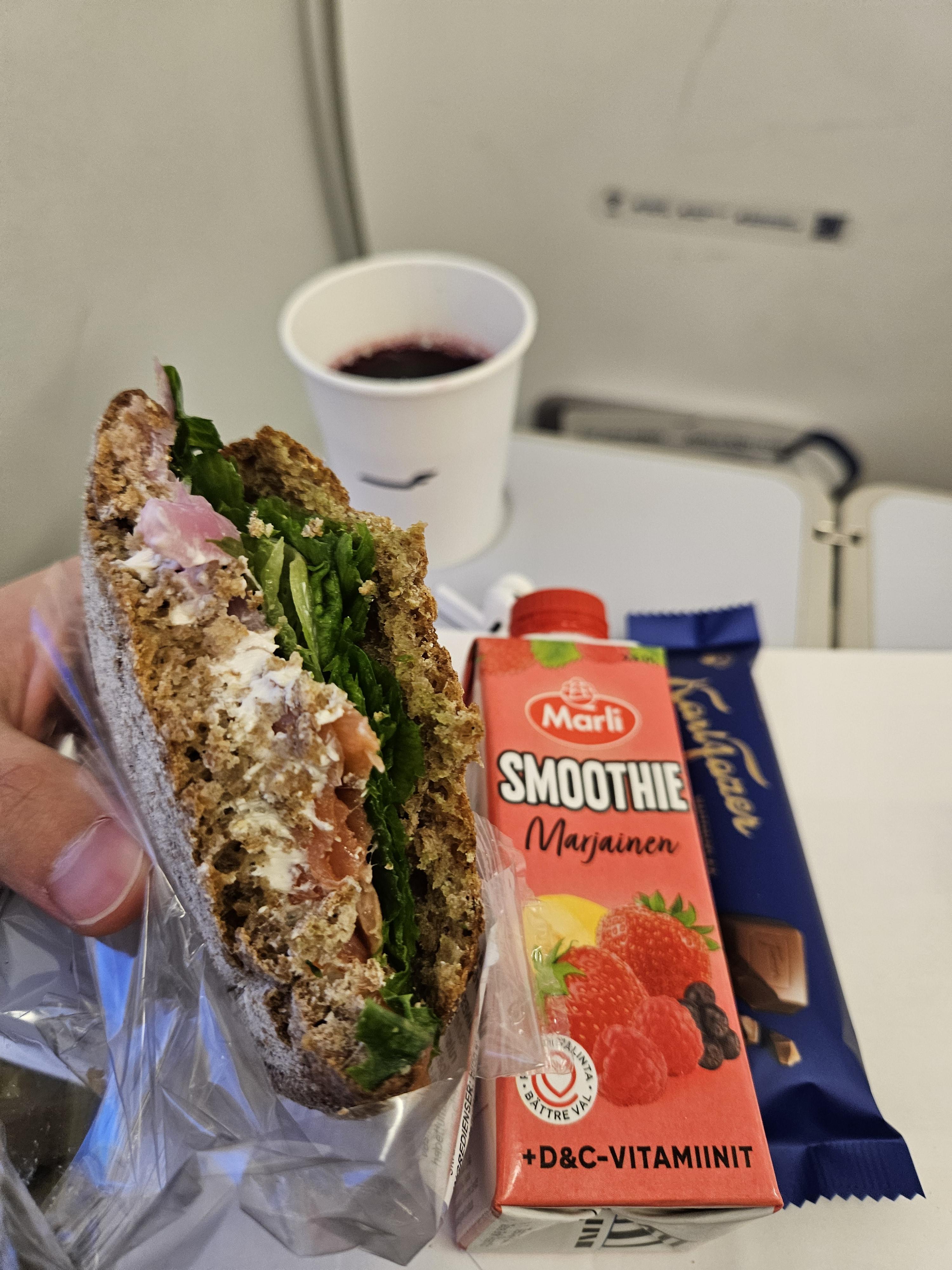 핀에어 사전 기내식 노르딕 콤보(좌), 파니니(우) 이발로에서 헬싱키까지는 약 1시간 30분 정도 걸리는 짧은 비행이기에 비행 중에 한 번의 음료 서비스가 제공됩니다. 역시 물과 블루베리 주스는 무료로 제공되고, 나머지 음료나 스낵은 구입해야 하는 형태입니다. 저의 경우 시간이 점심으로 먹을 음식들을 사전 기내식으로 주문했습니다. 초콜릿, 스무디, 연어샌드위치를 주는 노르딕 콤보와 파니니를 주문했습니다. 이 둘의 가격은 각각 12.9유로와 9.9유로로 북유럽 물가와 비행기 안이라는 공간적 특수성을 감안할 때 꽤 괜찮은 가격으로 보입니다. 이 외에도 피자나 다른 샌드위치들도 사전 주문해야만 먹을 수 있는데 가격이 대부분 9~15유로 정도로 식사 시간이 애매할 때 먹기 좋아 보였습니다. 맛은 평범한 맛으로 엄청 감동스럽지도 않지만 나쁘지도 않은 수준이었습니다. 만약 사전 기내식을 신청하지 않았다면 기내에서도 오트밀, 카레 누들, 파스타 볼로네제 등의 핫밀을 주문할 수 있고, 간단한 스낵류와 주류도 주문할 수 있습니다. 하지만 기내에서 주문할 수 있는 음식의 종류는 많지 않기에 되도록이면 사전기내식을 주문하는 걸 추천드립니다.