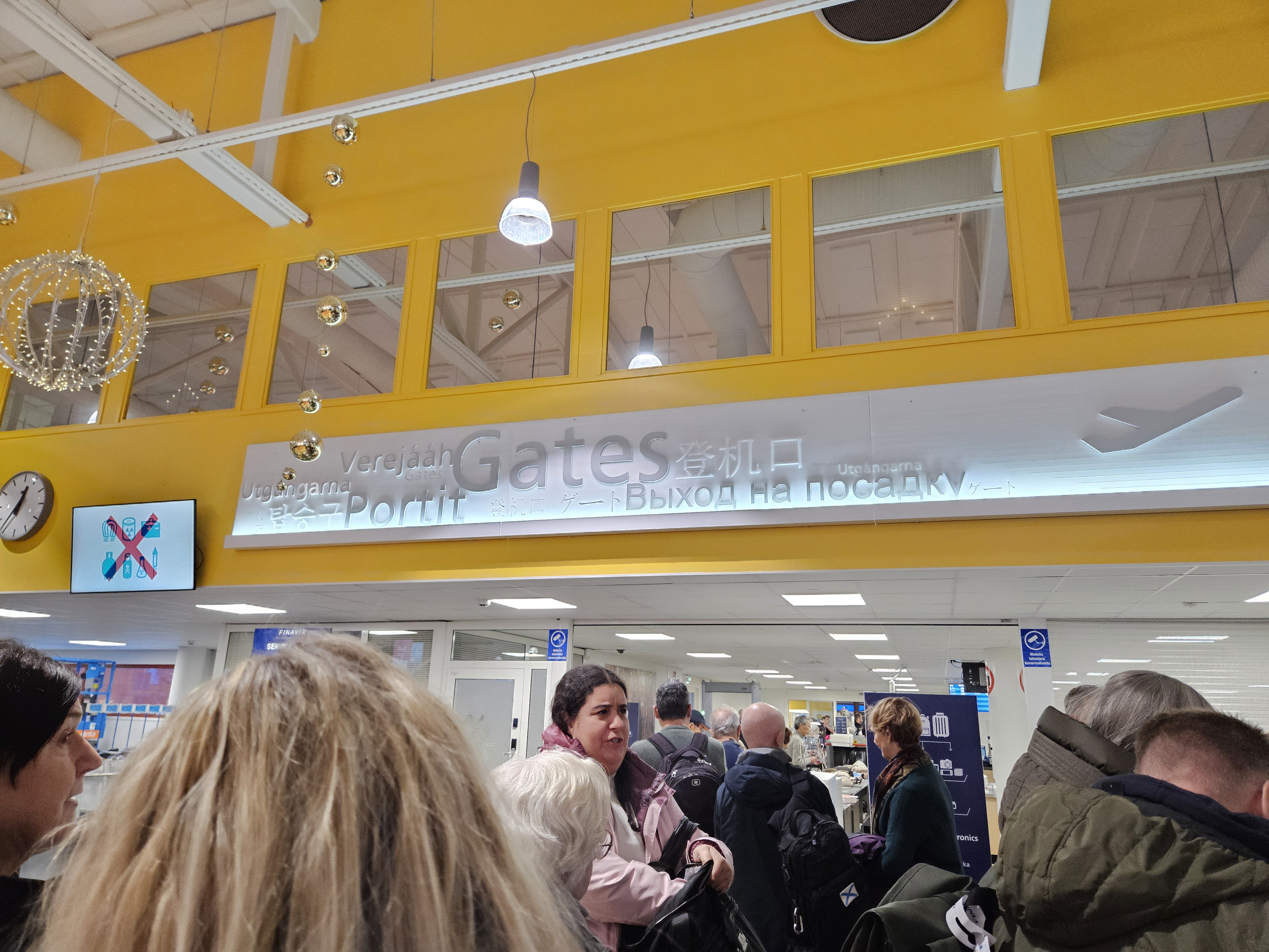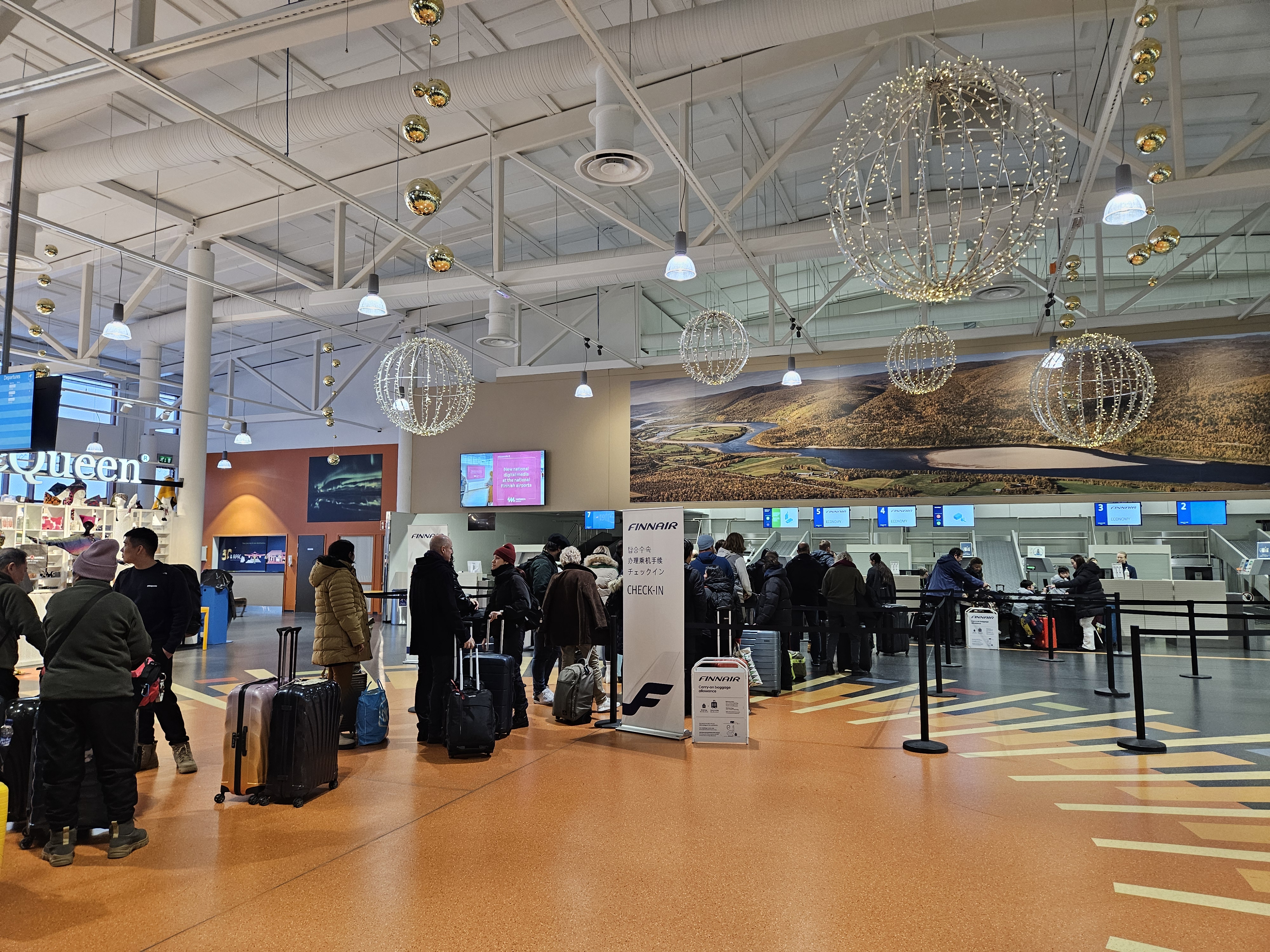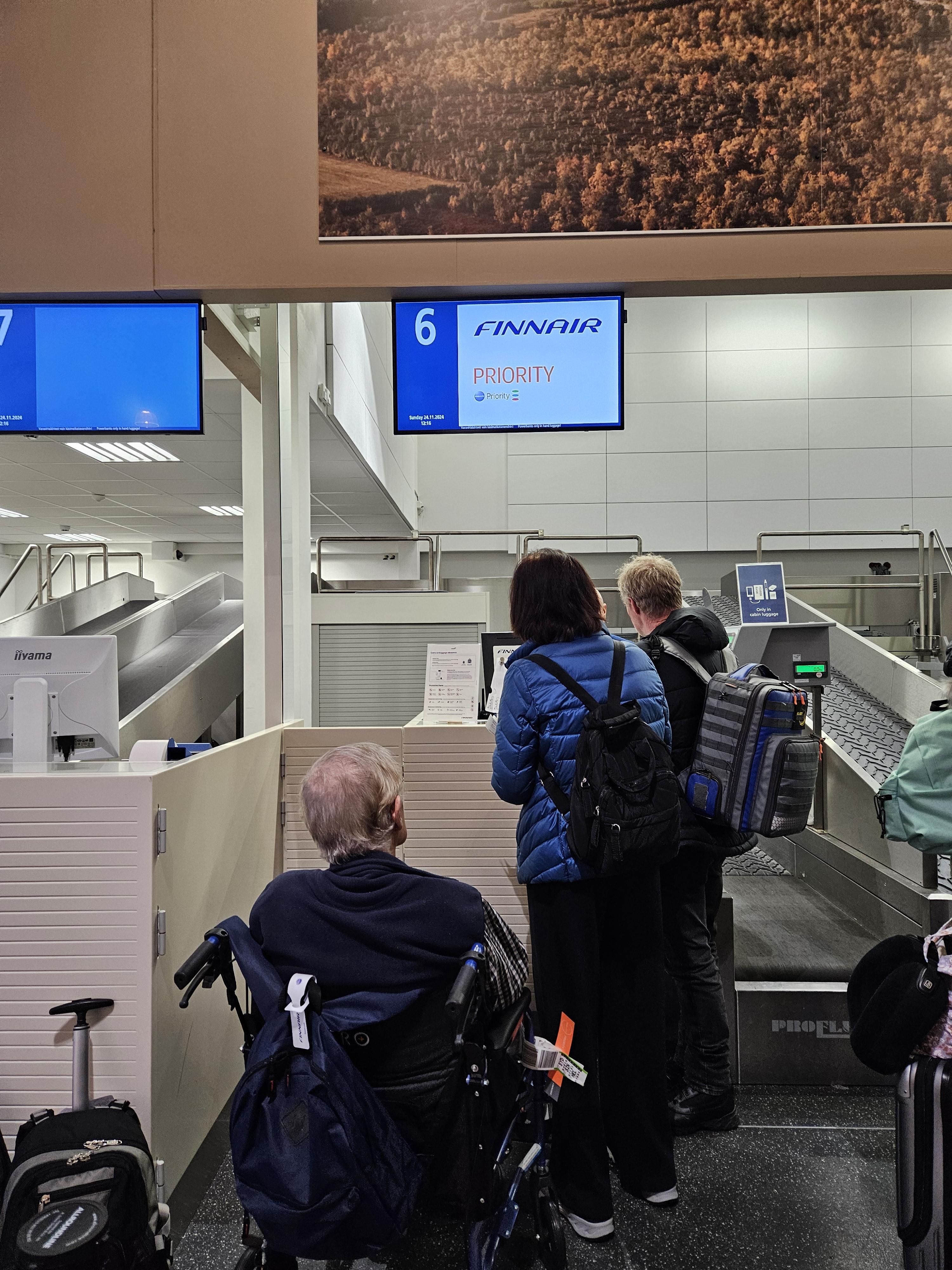 이발로 공항 핀에어 체크인 카운터 이발로에서 출발해 헬싱키로 가는 항공편을 타기 위해 대략 1시간 40분 전에 이발로 공항에 도착했습니다. 이발로 공항은 노선이 총 8개, 하루에 약 6편 정도의 비행기가 뜨는 작은 공항입니다. 그중 절반정도가 헬싱키로 향하는 항공편이고, 헬싱키로 향하는 항공편 중 일부 항공편은 키틸라(KTT) 공항을 경유해 헬싱키로 향합니다. 이발로 공항에 도착했을 때는 체크인 카운터에는 줄이 꽤 길게 있었습니다. 저는 원월드 사파이어 등급이 있기에 우선 체크인 카운터를 이용했고, 거의 기다리지 않고 짐을 부칠 수 있었습니다. 핀에어는 라이트 요금에는 무료 위탁 수하물을 제공하지 않습니다. 다만, 파트너 어워드 항공권의 경우 라이트 요금이 아니기에 티켓당 23kg 수하물 1개가 무료로 포함됩니다. 원월드 사파이어 등급의 경우 23kg 수하물 1개가 추가로 제공됩니다. 체크인 카운터의 경우 총 4개가 열려있었는데 제가 탄 항공편이 약 210명이 타는 항공기였기에 체크인 마감 전까지 모두 체크인을 할 수 있을지 걱정이 될 정도로 줄이 길었습니다. 물론 줄을 서있는데 출발 45분 전이라고 카운터를 닫지는 않을 것 같지만, 이발로 공항에서 핀에어를 이용하시는 분들 중 A321항공기를 타시는 분들은 조금 일찍 공항에 도착하시는 것이 좋을 것 같습니다. 작은 공항이었기에 보안 검사대도 2개밖에 없었고 여기에도 줄이 꽤 길었습니다. 보안검사대를 통과하는 데는 대략 20분 정도가 걸렸습니다.