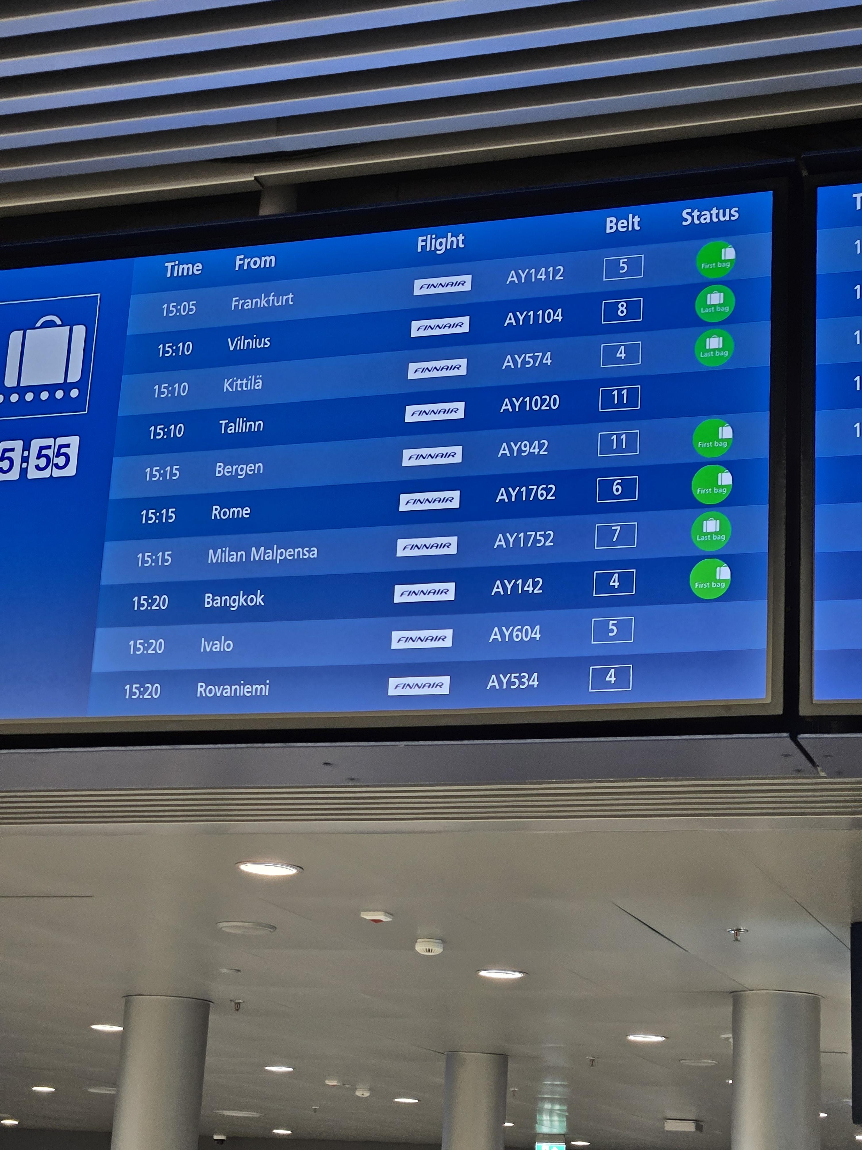 - 노선: IVL(핀란드 이발로 공항) → HEL(핀란드 헬싱키 공항), AY604, 13:45 → 15:20, Duration 1h 35m