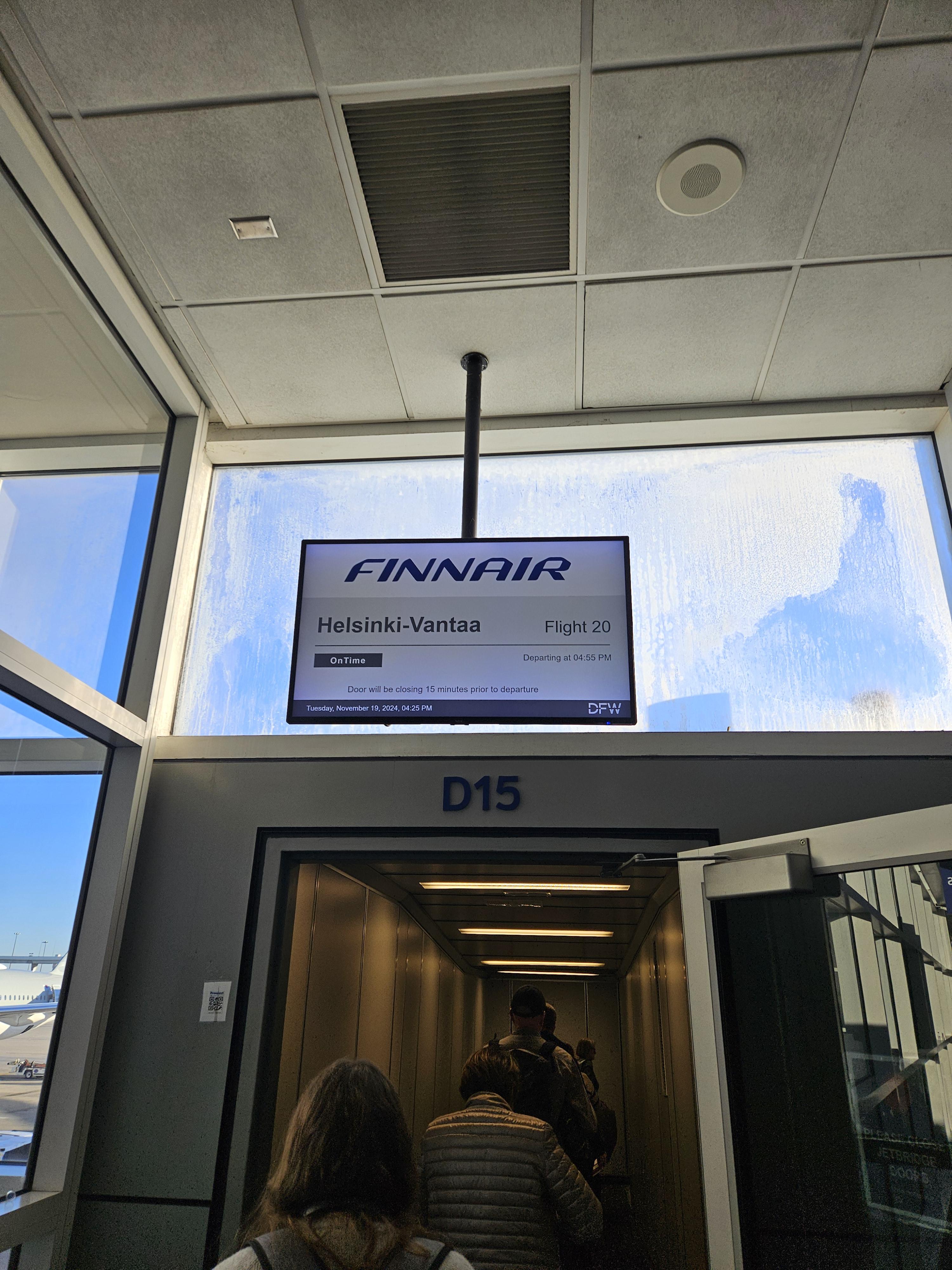 댈러스 포트워스 공항 D15게이트 16시 55분에 헬싱키로 향하는 핀에어 20편은 D15게이트를 이용했습니다. 게이트의 경우 공항의 사정에 따라 바뀌기도 하지만 대부분 같거나 그 언저리에 있는 게이트를 이용하게 됩니다. 보딩은 약 45분 전부터 시작된다고 했지만 실제로는 출발 약 35분 전에 시작했습니다. 일단 D15게이트는 네모난 모양의 터미널의 꼭짓점에 위치해 있는데 그 꼭짓점에 대략 4개 정도의 게이트가 위치해 있는데 비해 대기할 수 있는 공간이 많지는 않아 게이트 근처가 매우 붐볐습니다. 더불어 핀에어는 다른 항공사에서 발급받은 보딩패스나 모바일 보딩패스, 온라인 체크인 후 프린트한 보딩패스들은 모두 보딩 게이트의 포디엄에서 핀에어 보딩패스로 재발급받게 안내했습니다. 이 때문에 게이트 근처가 더 혼잡스러운 것도 있었고요. 보딩은 프리보딩, 그룹 1, 2, 3, 4, 5 순으로 하게 됩니다. 저의 경우 그룹 2로 보딩을 했고요, 보딩을 빨리 해서 얻는 가장 큰 장점은 아무래도 좌석 가까이에 있는 오버헤드 빈을 먼저 선점할 수 있다는 점인 것 같습니다.