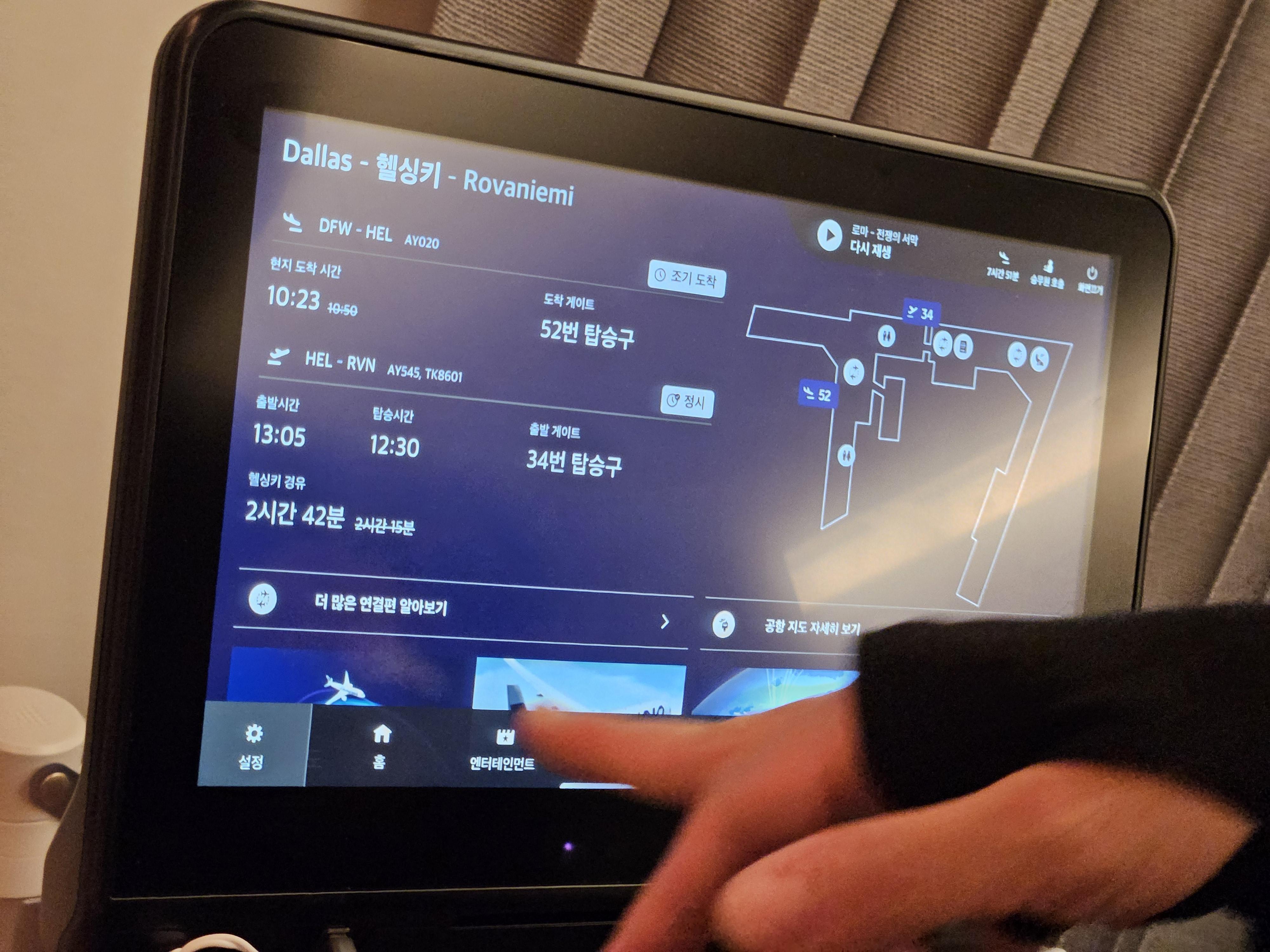 핀에어 A350-900 기내 엔터테인먼트 시스템 핀에어의 기내 엔터테인먼트 시스템은 인상적이었습니다. 먼저, 기내 엔터테인먼트 시스템에서 제공되는 영화나 TV쇼는 아주 많지도 부족하지도 않은 수준이었습니다. 핀에어가 한국에도 취항하고 있다 보니 한국 드라마나 영화가 제공된다는 점은 좋았고요. 인상적이었던 점은, 연결편의 정보와 환승에 필요한 모든 정보다 기내 엔터 시스템에서 제공된다는 점이었습니다. 아마도 핀에어가 환승장사를 많이 하는 항공사여서 이 부분에 초점을 맞추지 않았나 싶습니다. 핀에어는 기내 와이파이도 지원하는데요, 미국 출발 헬싱키행 기준으로 비행 내내 쓸 수 있는 와이파이 가격이 약 $19 정도였습니다. 원래는 약 $24 정도 하는데 핀에어의 상용고객프로그램인 FInnair Plus회원은 할인된 금액으로 이용할 수 있습니다. 비행 내내 동영상 시청을 제외한 이메일이나 웹 브라우징 정도는 부족함 없는 속도였습니다.