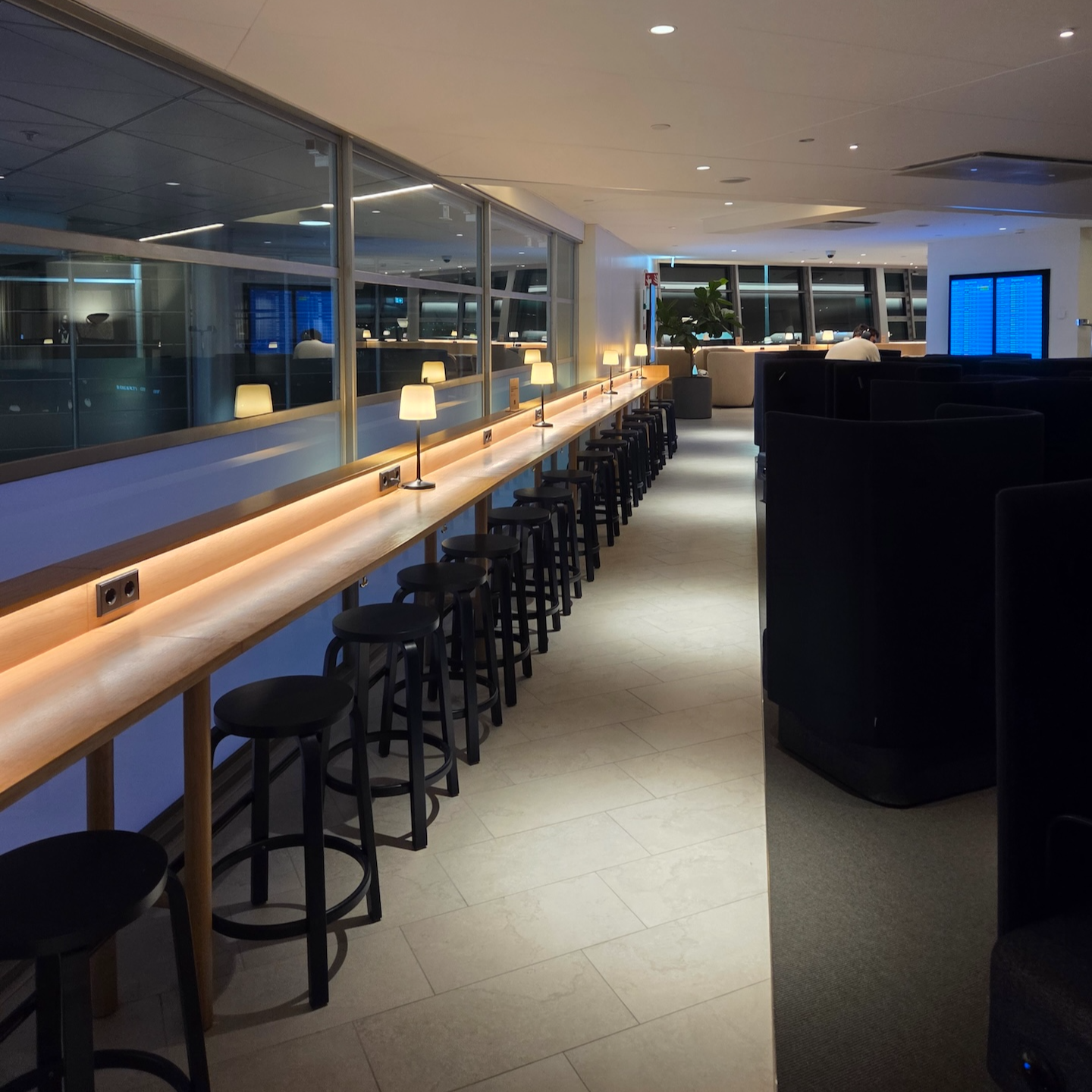 핀에어 비즈니스 라운지 솅겐 구역 휴식 공간 이 다이닝 공간을 지나 조금 더 안쪽으로 들어서면 더 편한 의자들이 있는 공간이 있고, 활주로와 에이프런, 택시웨이를 마주하는 창가에는 바 테이블과 스툴이 일자로 배치되어 있습니다.