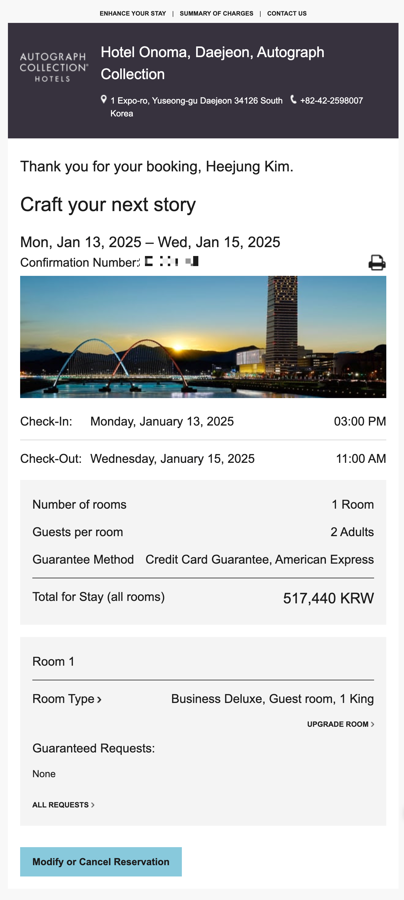 호텔오노마 오토그래프콜렉션 예약 확인 이메일 저는 가장 기본 객실인 비즈니스 디럭스 객실 평일 2박을 총 517,440원에 예약했습니다. 1박에 약 25만 8천 원 정도였고 메리어트 공식 홈페이지를 통해 예약했습니다. 메리어트 공식 홈페이지를 통해 예약하는 이유는 메리어트의 멤버십 프로그램인 메리어트 본보이 회원 혜택을 받기 위함입니다. 만약 메리어트 본보이 회원 혜택을 받을 필요가 없으시다면 다른 호텔 예약 플랫폼들을 이용해 예약할 경우 방 가격이 조금 더 저렴할 수 있습니다.