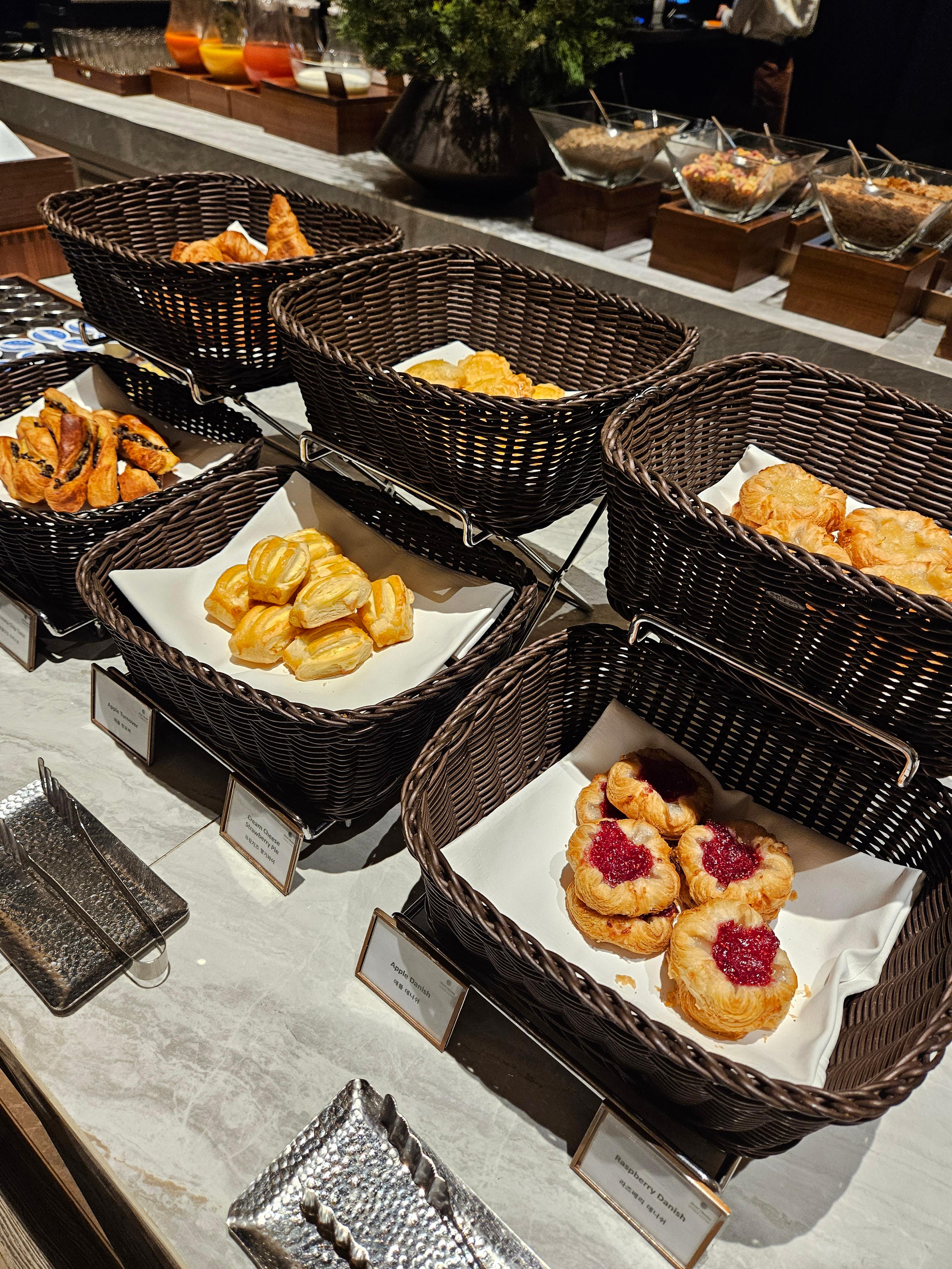호텔오노마 오토그래프콜렉션 조식 주스와 담아온 음식들 주스로는 사과주스, 자몽주스, 오렌지 주스, 당근 주스가 있었고 디저트로는 머핀, 브라우니, 햄들과 치즈, 과일류로는 자몽과 파인애플, 바나나 등이 있었습니다. 커피는 전자동 에스프레소 머신에서 뽑아 먹는 형태였고 간단한 시리얼 류와 플레인 요거트, 과일 요거트가 있었습니다.