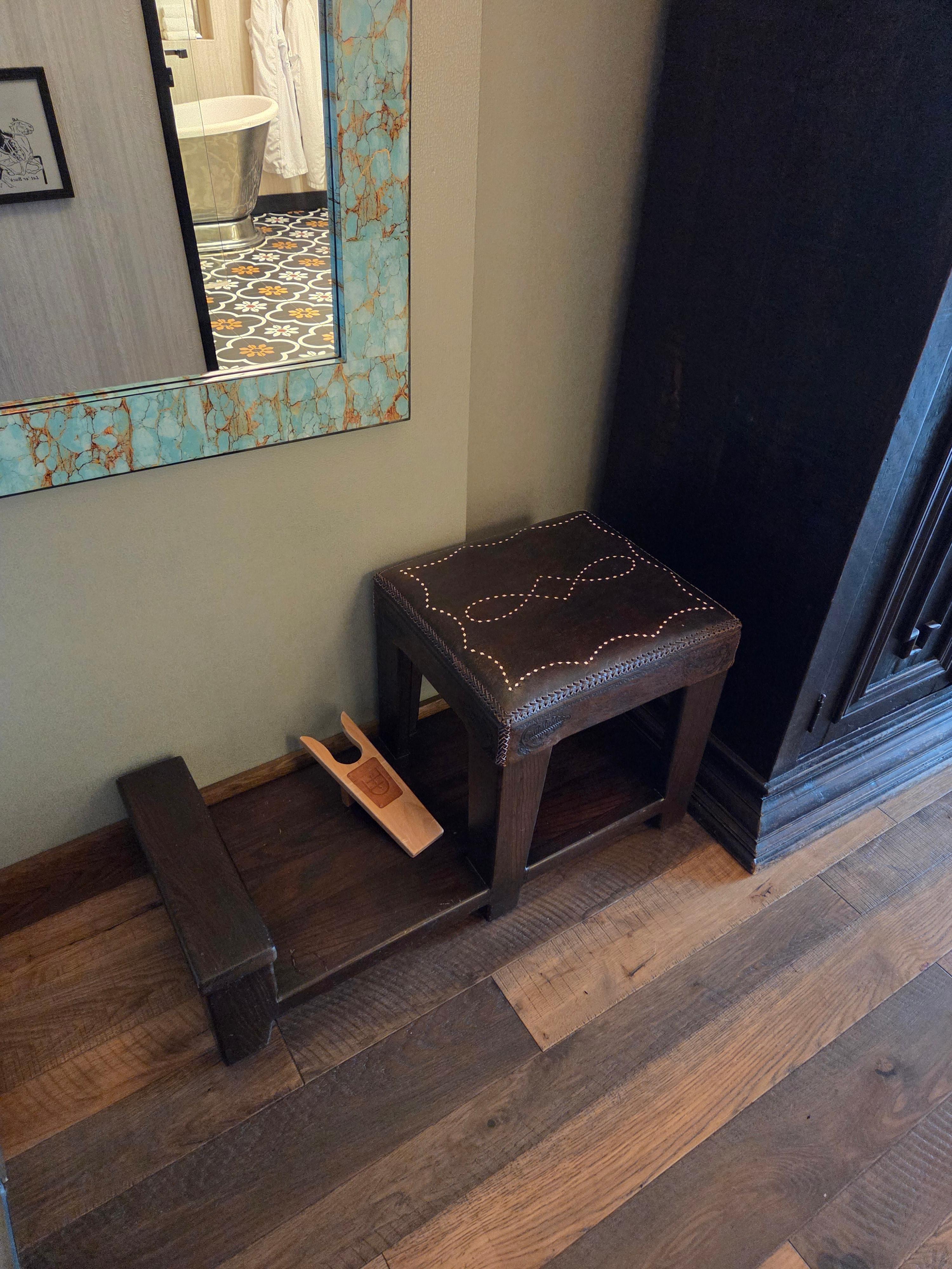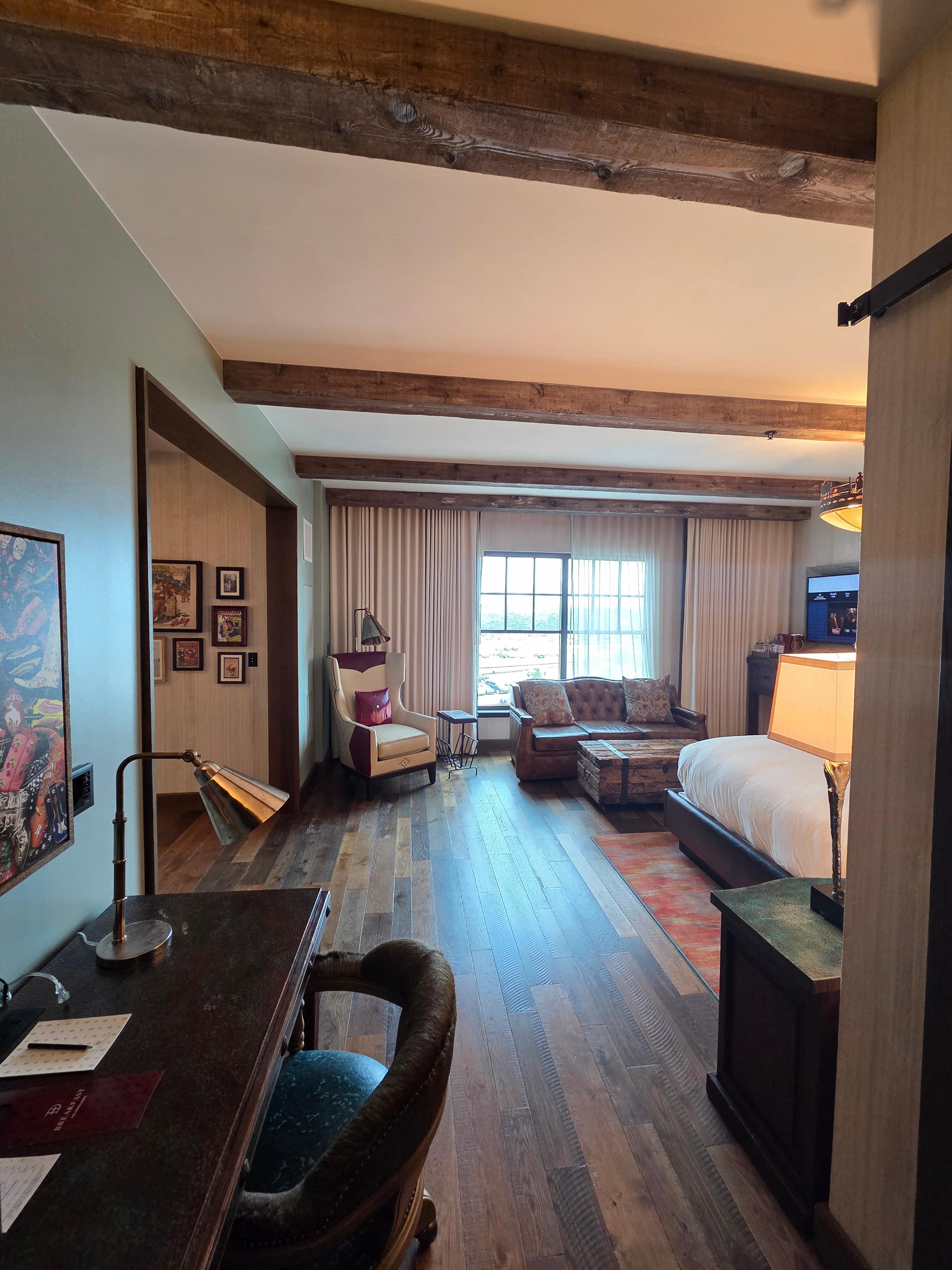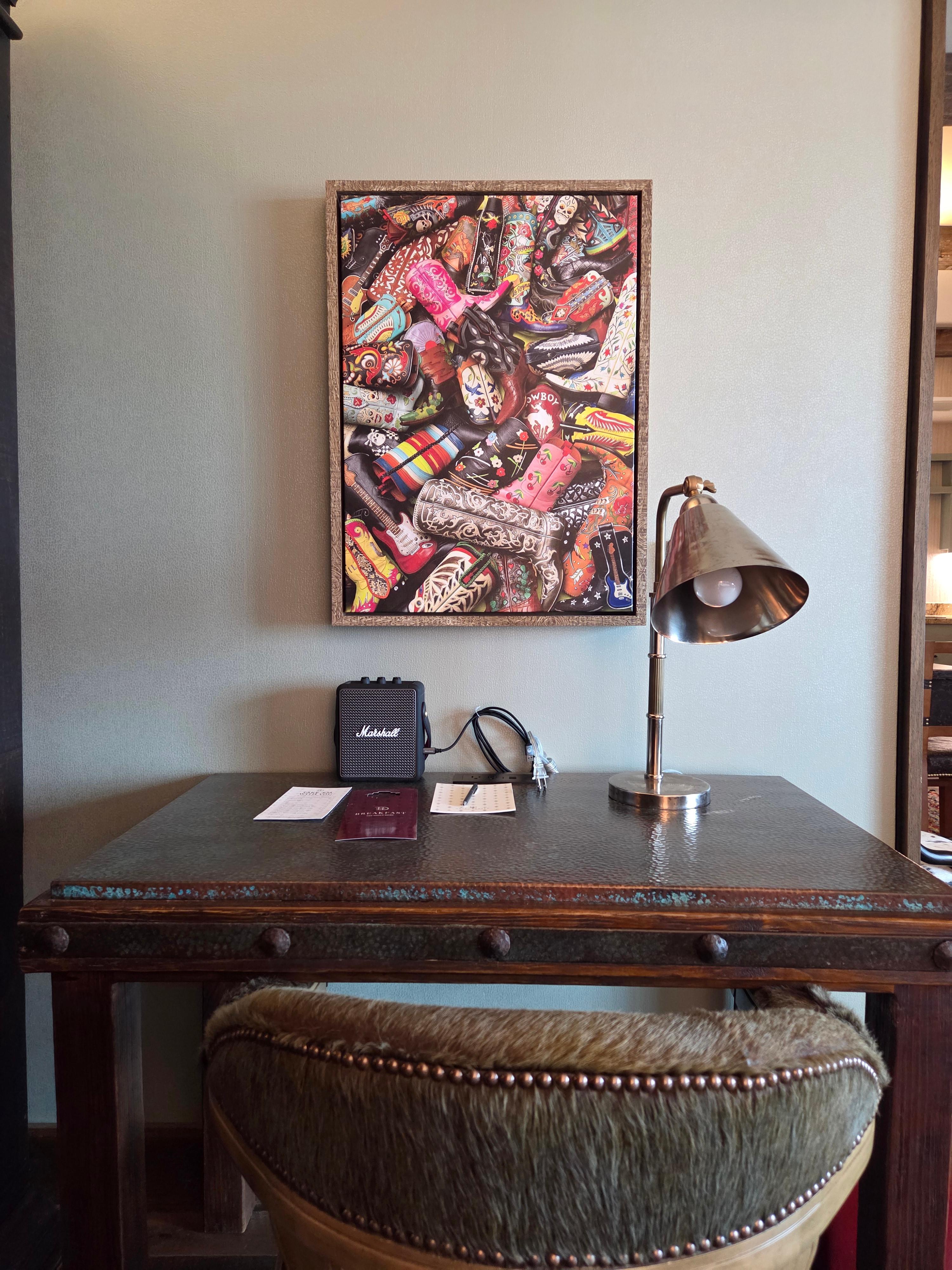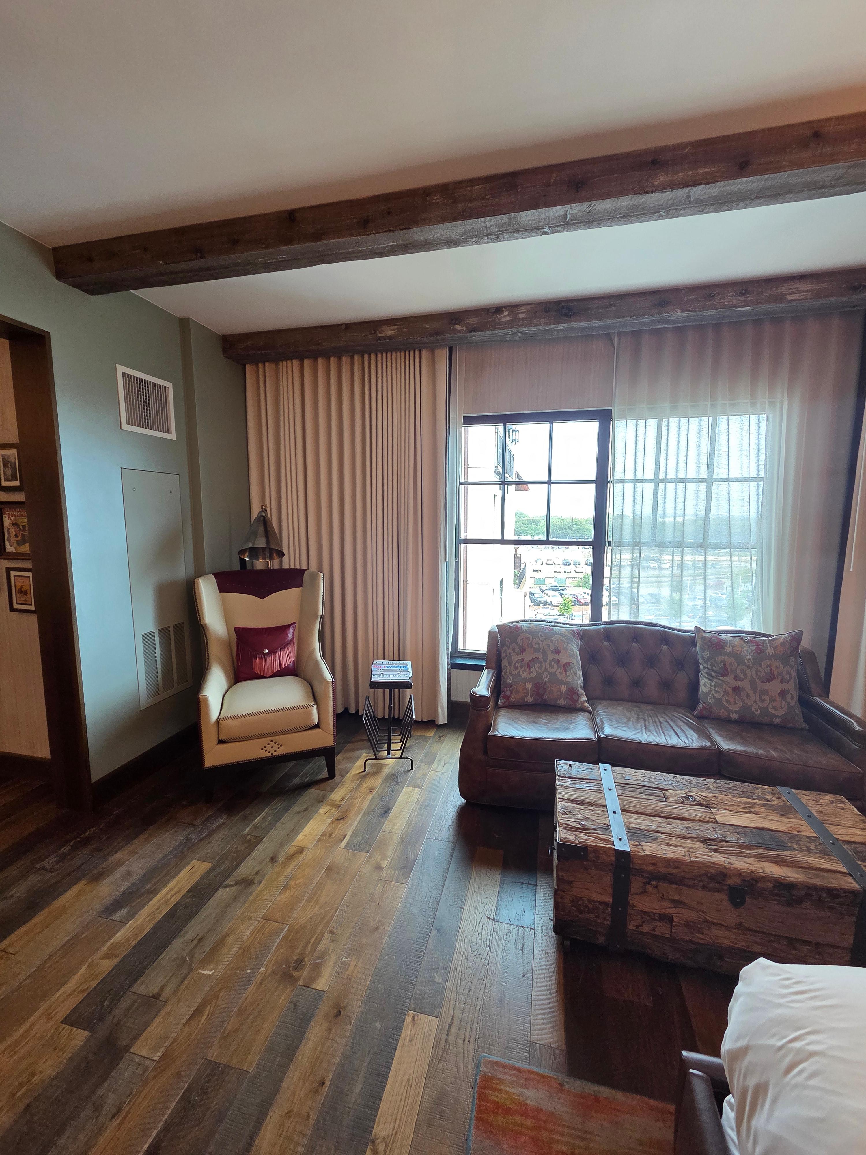 방의 전반적인 인테리어는 체크인 카운터와 로비와 마찬가지로 서부시대의 텍사스의 감성이 잔뜩 묻어있는 인테리어였습니다. 플로어는 우드로, 벽지는 우드 패턴과 질감의 벽지로 마무리를 했고, 배치되어 있는 가구들도 앤틱해 보이는 가죽 소파와 철제 테이블, 우드 콘솔 등 현대적이라기보다는 조금은 타입슬립을 한 느낌이 나는데, 촌스럽지 않았고 이 호텔의 컨셉과 잘 어울렸습니다. 또한 방 안의 아트워크나 책들도 과거 스톡야드의 전성기 시절을 연상시키는 작품들과 도서들이라 어느 곳 하나 어울리지 않는 부분 없이 조화가 잘 이루어진 느낌이었습니다. 개인적으로는 전 세계 어느 곳에서나 비슷한 분위기와 인테리어를 지향하는 호텔 브랜드들도 나쁘지 않지만, 이런 지역색을 강하게 풍기는 분위기의 호텔들도 매우 좋아하는 편입니다. 이런 100년 전의 스톡야드 느낌이 나는 호텔은 아마도 미국 전체에서도 이곳, 호텔 드로버 오토그래프 컬렉션밖에 없을 테니까요.