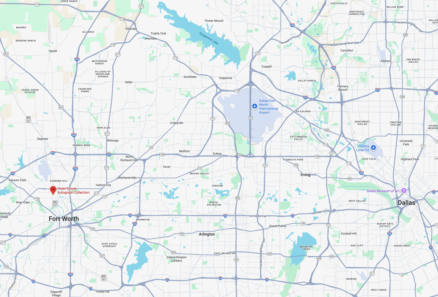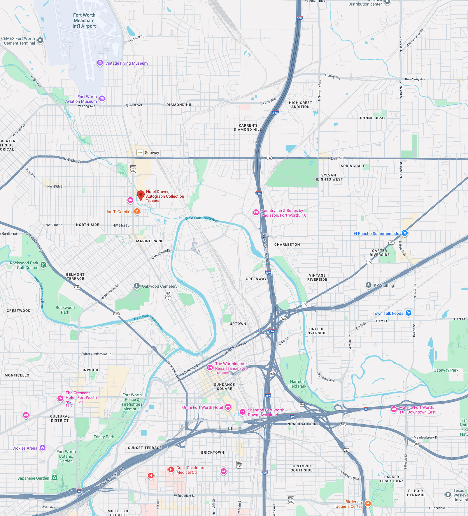 호텔 드로버 오토그래프 컬렉션 위치, image courtesy of Google Maps 호텔 드로버 오토그래프 컬렉션은 텍사스주 포트워스시의 포트워드 스톡야드 역사지구 내부에 위치하고 있습니다. 포트워스는 텍사스주의 댈러스-포트워스-알링턴 광역권에 위치한 도시로, 댈러스-포트워스-알링턴 광역권은 인구가 약 800만 명으로 미국에서 네 번째로 큰 광역권입니다. 포트워스는 과거 텍사스 북부 정착민들을 원주민들로부터 보호하기 위해 세워진 요새로부터 유래된 도시입니다. 포트워스 내에 위치한 스톡야드는 1800년대 후반 철도 교통의 요지라는 특성을 활용해 미국에서 가장 큰 가축 거래소로 성장했으며 1900년대 초반까지는 대형 육가공 회사의 도축장과 공장까지 세워지며 가축 거래뿐만 아니라 도축, 육가공, 철도 운송까지 한 곳에 모인 산업단지로 성장해 세계 축산업의 수도라고 불리기도 했습니다. 이후 세계 2차 대전 후 미국 축산업 구조 개편에 따라 스톡야드는 점점 쇠퇴했지만 1970년대 후반 스톡야드는 National Historic District로 지정되었고, 복원과 보존 작업이 진행되어 현재까지도 과거 1800년대 후반 ~ 1900년대 초반의 느낌을 물씬 풍기는 서부 문화유산 관광지로 많은 관광객들이 방문하고 있습니다.
