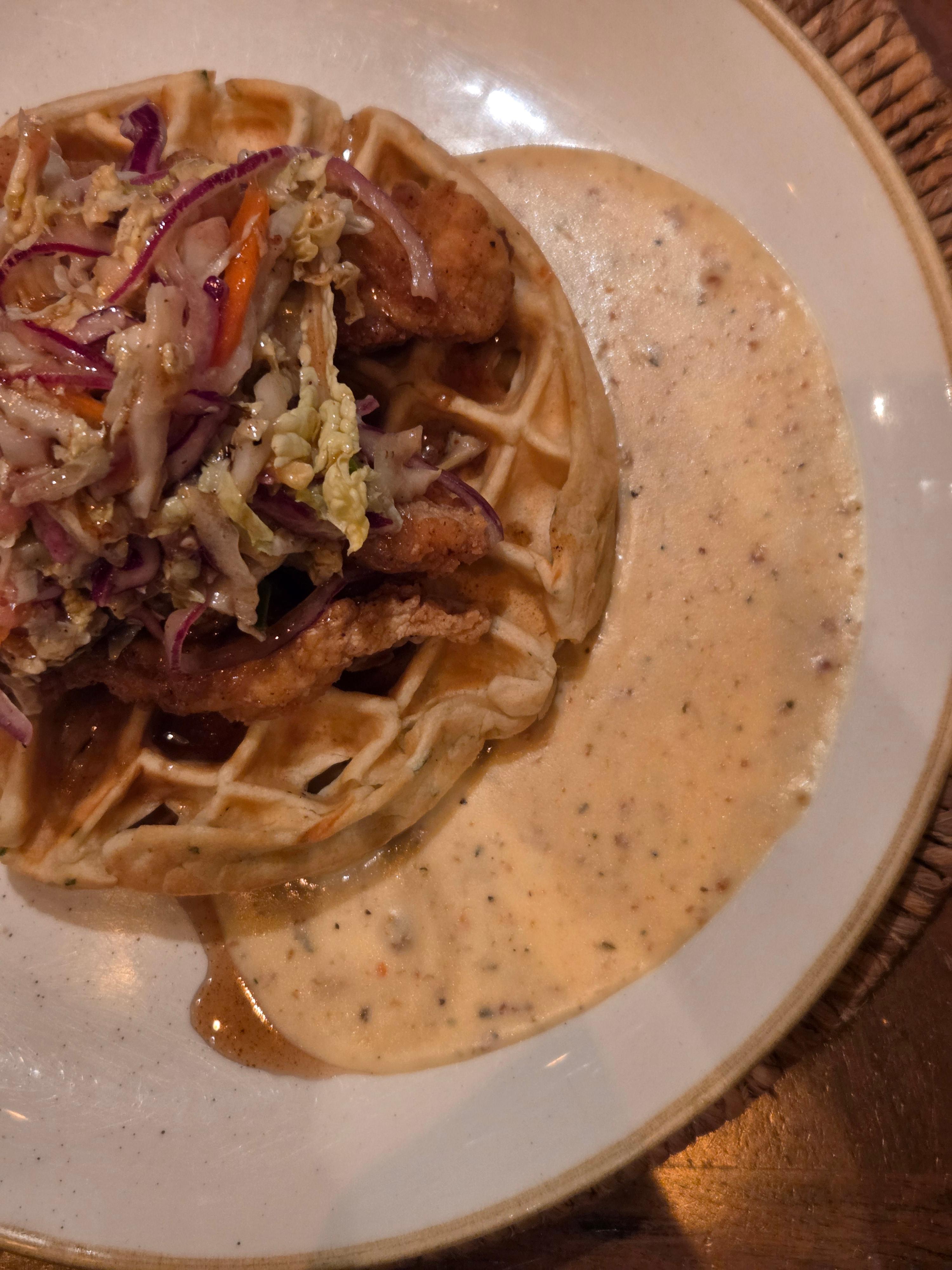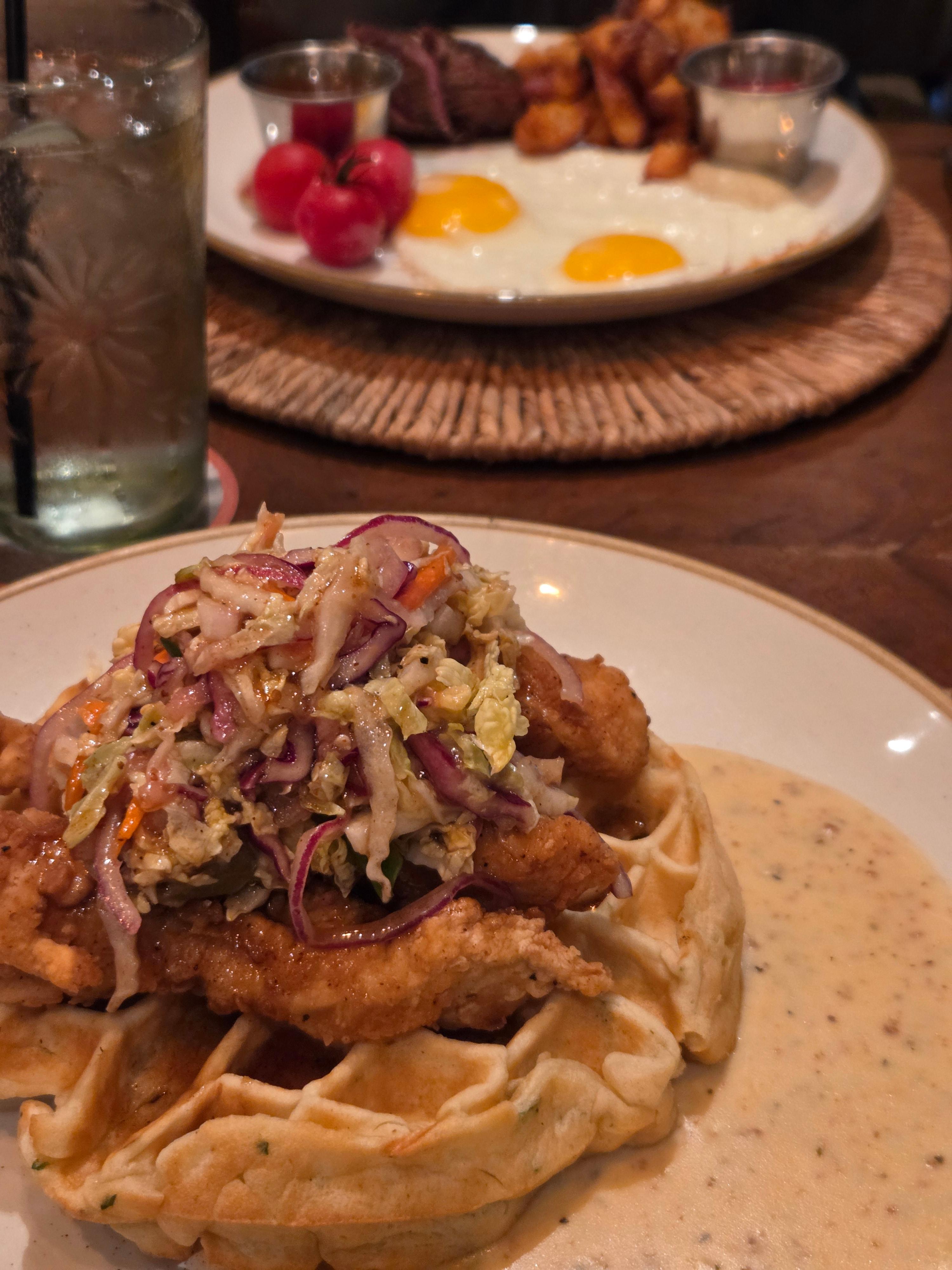 호텔 드로버 오토그래프 컬렉션 97 WEST Kitchen & Bar의 Buttermilk Fried Chicken & Waffles와 Wagyu Steak & Eggs 저는 치킨과 와플이 함께 나오는 Buttermilk Fried Chicken & Waffles와 Wagyu Steak & Eggs를 주문했습니다. 조식 메뉴 선택에서 아쉬움과 별개로 음식들의 수준은 꽤 좋았습니다. 먼저 치킨 앤 와플은 코울슬로에서 양배추 대신 텍사스를 포함한 남부 지방에서 자주 먹는 오크라(Okra), 풋콩(Snap beans)과 콩(Field peas)이 들어간 슬로와 위스키 향이 나는 스파이스드 메이플 시럽, 화이트 그래비 소스가 치킨과 와플이 함께 나왔는데요, 미국 남부지방에서 유명한 요리에 텍사스의 느낌을 물씬 풍기는 조합도 좋았지만, 음식의 퀄리티가 수준급이었습니다. 특히 오크라와 콩으로 만든 슬로가 아삭거리면서도 자칫 느끼할 수 있는 메이플 시럽 + 치킨 + 그래비 소스 + 와플 조합에 새콤함을 더해주어 플레이트 하나를 질리지 않고 끝낼 수 있었습니다. 와규 스테이크 앤 에그의 경우 잉글리시 브렉퍼스트에서 햄이나 베이컨 대신 미국산 와규 삼각살 스테이크가 포함된 메뉴였습니다. 가장 인상적이었던 건 감자 웨지였는데 아주 잘 튀겨져 겉은 바삭하고 속은 촉촉했고 간과 후추의 양도 적당했습니다. 삼각살 스테이크의 경우 조식 메뉴임에도 직화 그릴에 구어 그릴의 풍미가 잘 살아있었지만, 부위의 한계 때문인지 미디엄 레어로 구웠음에도 조직감은 약간 있는 편이었습니다.