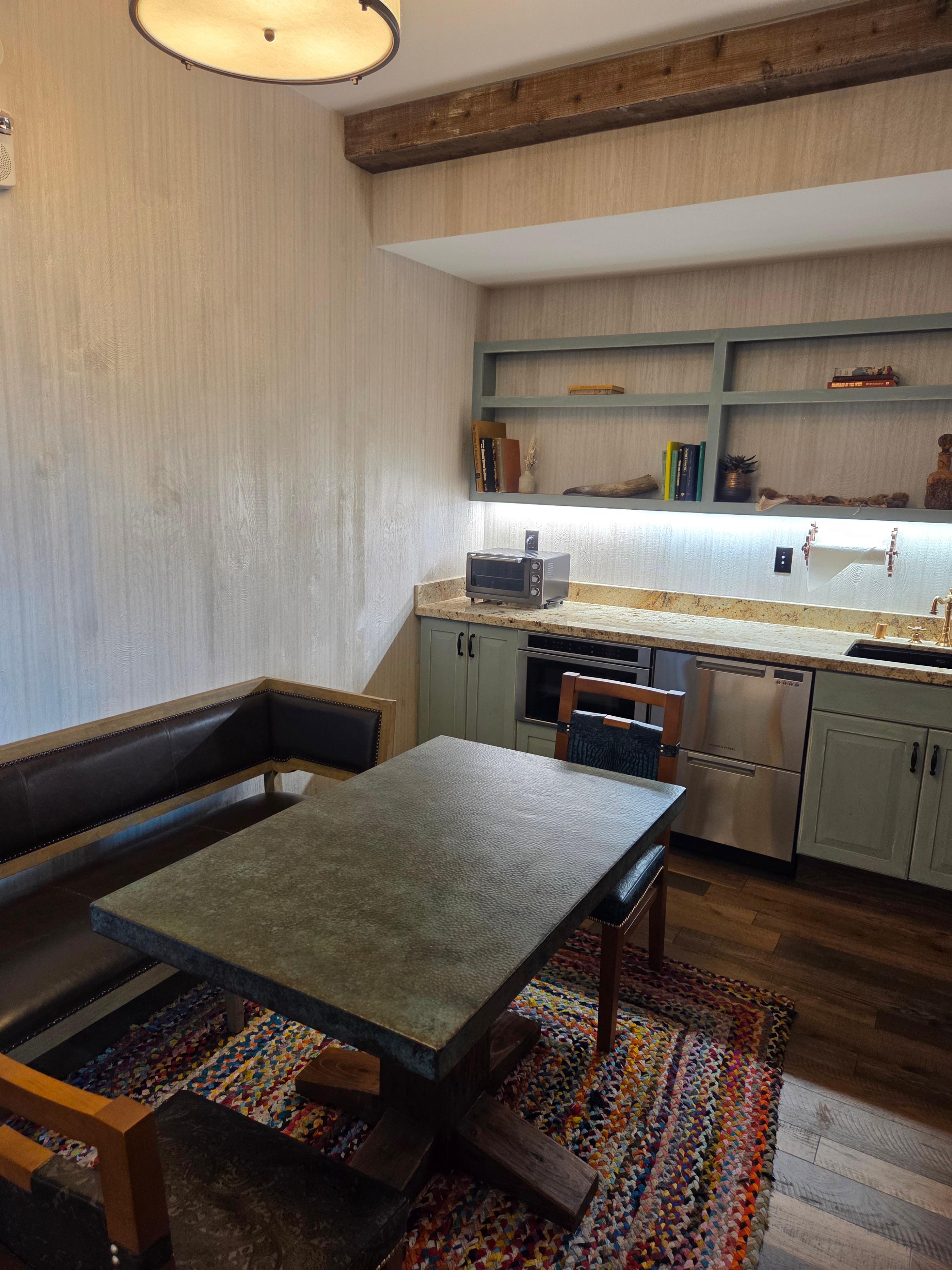 호텔 드로버 오토그래프 컬렉션 Kitchen, Soaking Tub, Executive Suite, 1 King 주방 주방은 풀 사이즈 주방으로 인덕션, 싱크대, 오븐, 토스터, 식기세척기, 냉장고가 위치하고 있어서 간단한 조리는 충분히 가능한 정도였고, 기본적인 식기류들과 냄비 등 조리도구도 배치되어 있어 조리를 위해 따로 도구들을 챙길 필요는 없어 보였습니다. 키친 중앙에는 다이닝 테이블과 최대 5명까지 않을 수 있는 의자가 놓여 있어 둘러앉아 음식을 먹으며 이야기를 나누기 좋았고요, 한편에는 옷걸이를 겸하는 의자가 하나 더 있어 그 의자와 엑센트 체어까지 가져온다면 최대 6~7명 정도는 한 번에 앉을 수 있어 보였습니다. 주방 한쪽으로는 문이 위치하고 있었는데 아마도 커넥팅 룸으로 사용했을 때 옆 방과 연결되는 통로로 보였는데 2 가족이 함께 호텔에 투숙할 때 이 다이닝 공간을 공용 공간으로 사용한다면 꽤 편리하겠다는 생각이 들었습니다.