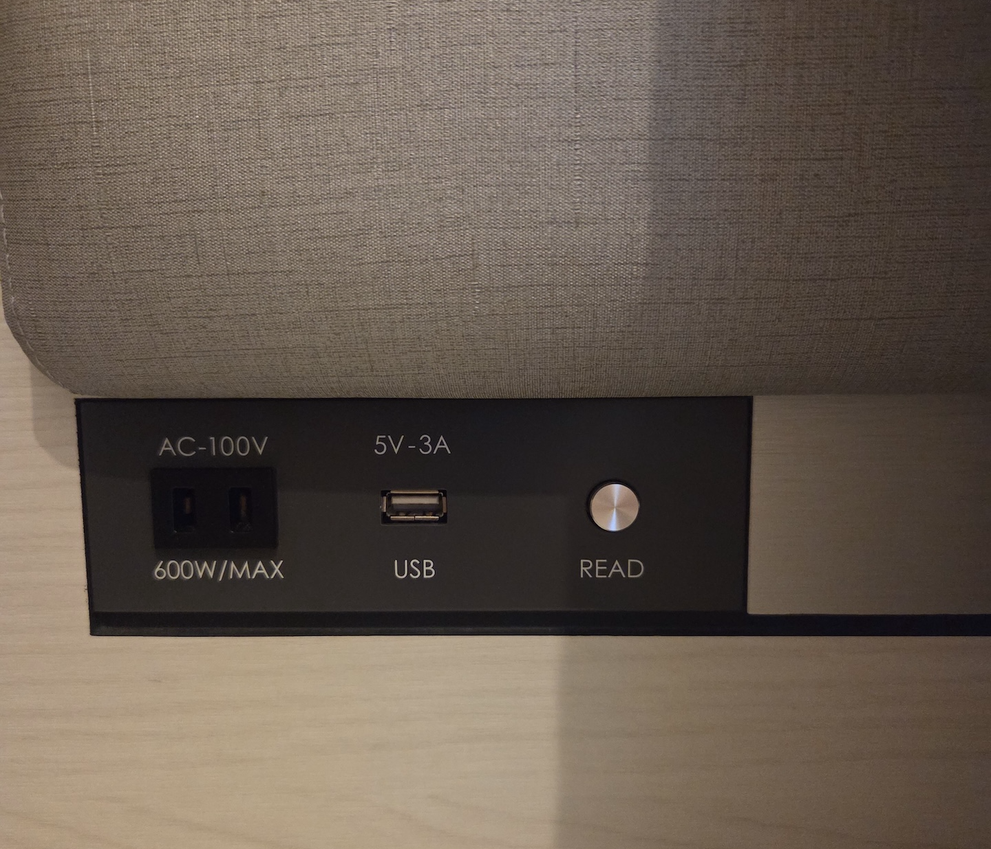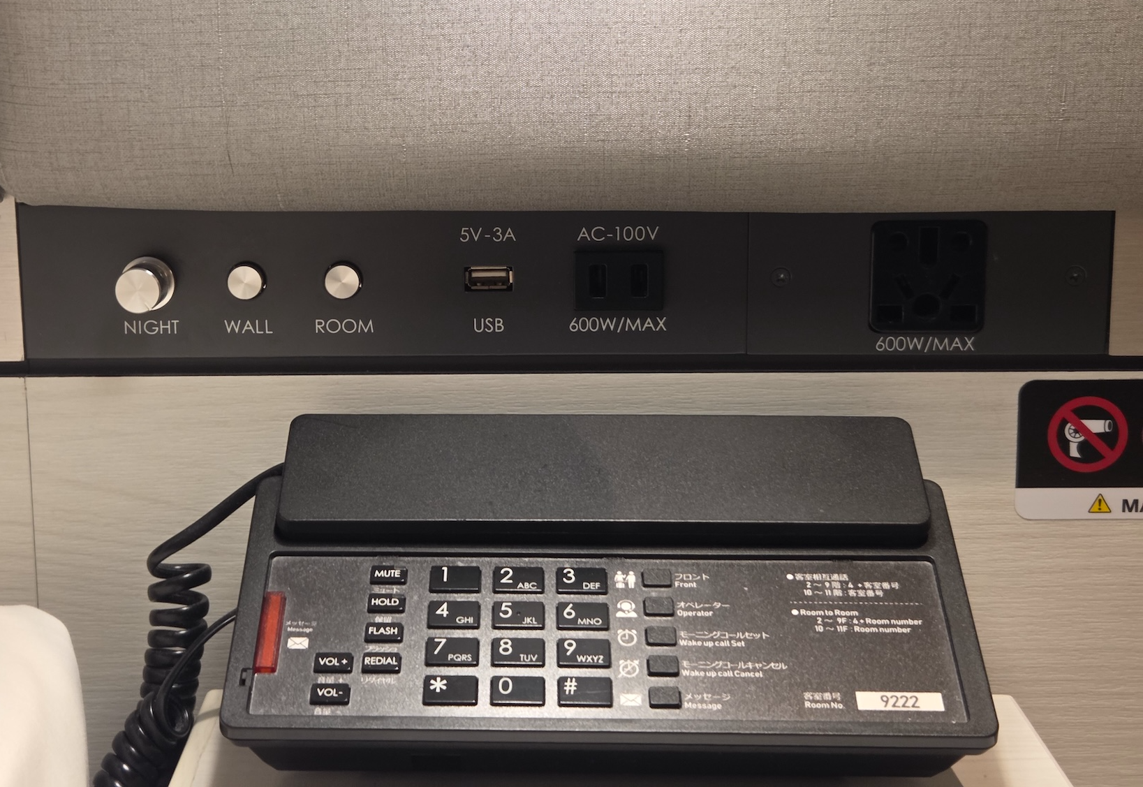 호텔 빌라 폰테누 그랜드 하네다 공항 Moderate 퀸 룸 침대 충전포트 방 크기가 크지 않은 만큼 침대 사이드 테이블은 한쪽(오른쪽)에만 위치해 있습니다. 오른쪽 사이드 테이블에는 충전키트와 더불어 전화기, 110v 전원 포트, USB-A 충전 포트와 함께 조명 컨트롤이 설치되어 있습니다. 다만, 사이드 테이블이 설치되어 있지 않은 왼쪽에도 110v 전원 포트와 USB-A 충전 포트, 독서등 스위치는 설치되어 있고 침실 공간과 욕실 공간을 구분해 주는 파티션에 개인 물품을 보관할 수 있을 선반이 마련되어 있어 크게 불편하지는 않았습니다.