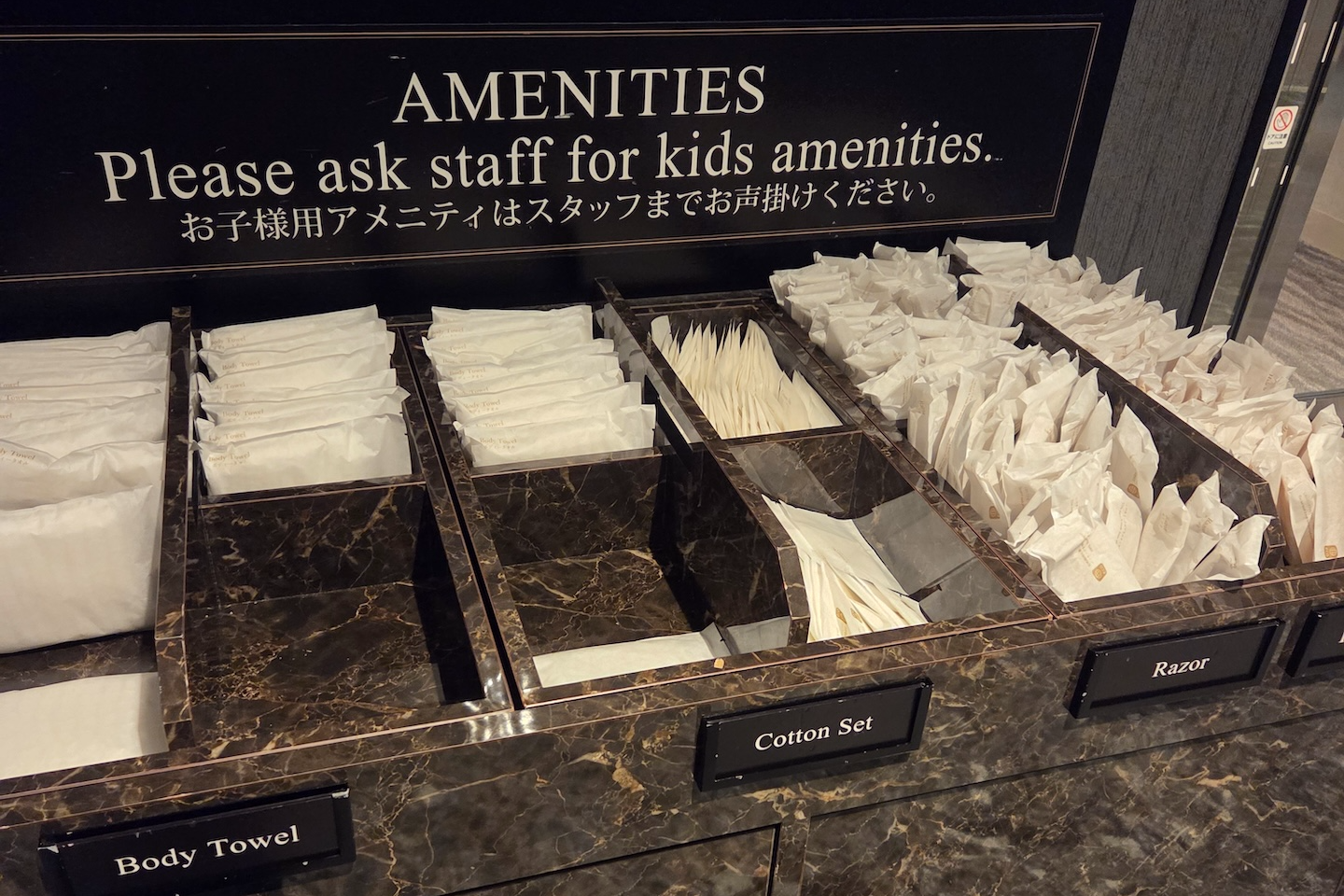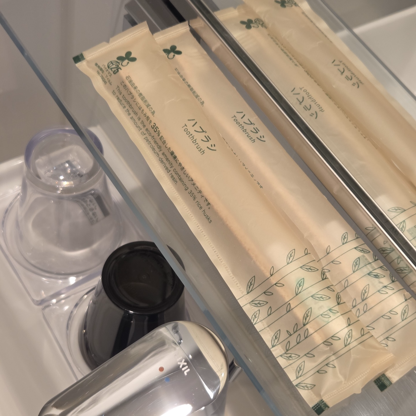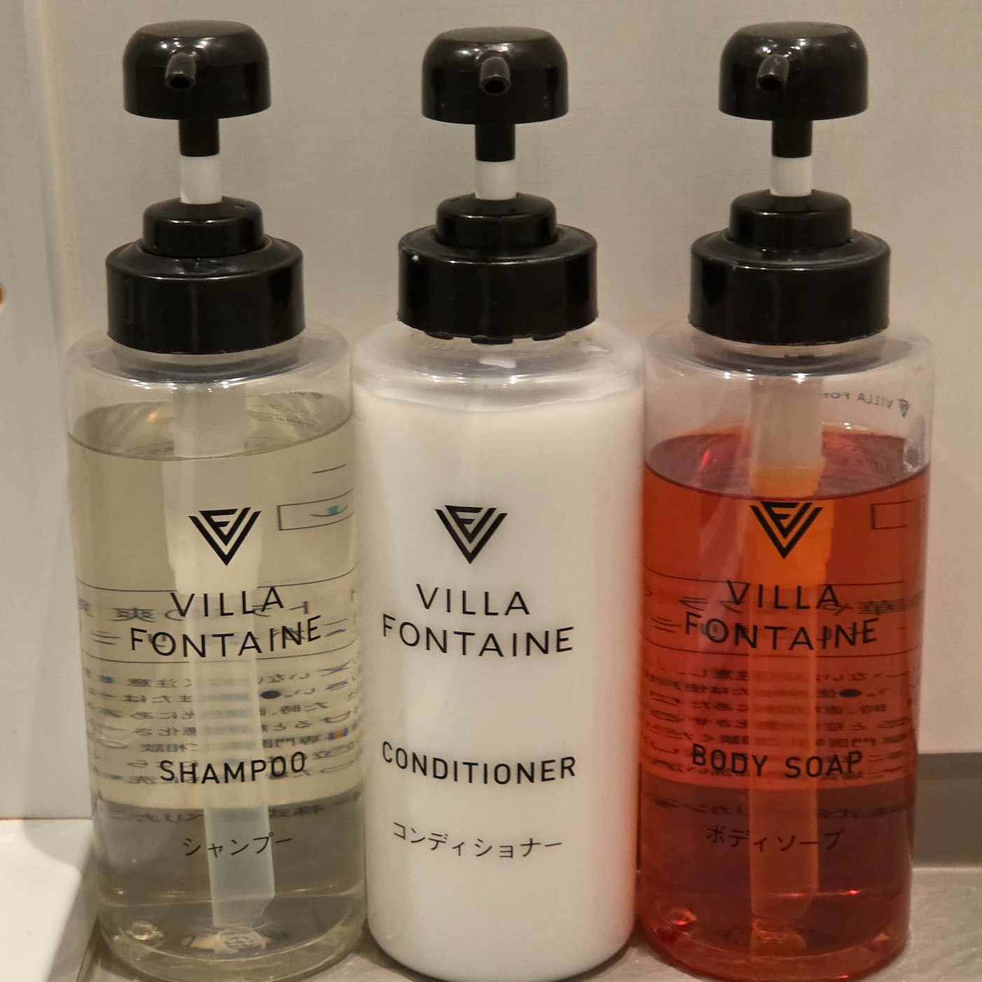 호텔 빌라 폰테누 그랜드 하네다 공항 Moderate 퀸 룸 욕실 어매니티 욕실 어매니티로는 호텔 빌라 폰테누 자체 제품이 대용량으로 준비되어 있었습니다. 세면대에는 핸드 워시가, 샤워실에는 샴푸, 컨디셔너, 바디워시가 준비되어 있었는데 샤워실의 대용량 어매니티는 벽에 고정된 게 아닌 대용량 컨테이너가 바닥에 그냥 놓여 있다는 점이 재밌었습니다. 아직 일본은 일회용 어매니티에 대한 규제가 한국만큼 강하지 않아서 칫솔 치약 세트도 2개가 준비되어 있었습니다. 다만, 바디 티올, 화장솜, 면도기 등은 방 안에 기본적으로 배치가 되어 있지 않았고, D 엘리베이터 기준 엘리베이터 로비에 무료로 가져갈 수 있도록 비치되어 있었습니다.
