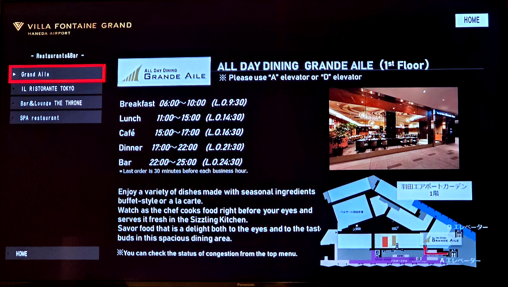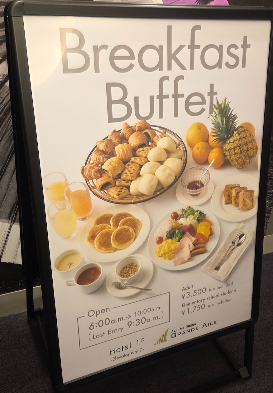 호텔 빌라 폰테누 그랜드 하네다 공항 조식 저는 다음날 아침 일찍 호텔을 떠날 예정이라 조식을 이용하지는 않았습니다. 호텔 빌라 폰테누 그랜드 하네다 공항의 조식은 1층에 위치한 식당인 All Day Dining Grand Aile에서 제공이 됩니다. 조식은 오전 6시부터 오전 10시까지 제공되며 마지막 입장은 오전 9시 30분입니다. 가격은 성인 3,500엔, 소인은 1,750엔이며 뷔페 형식으로 제공됩니다.
