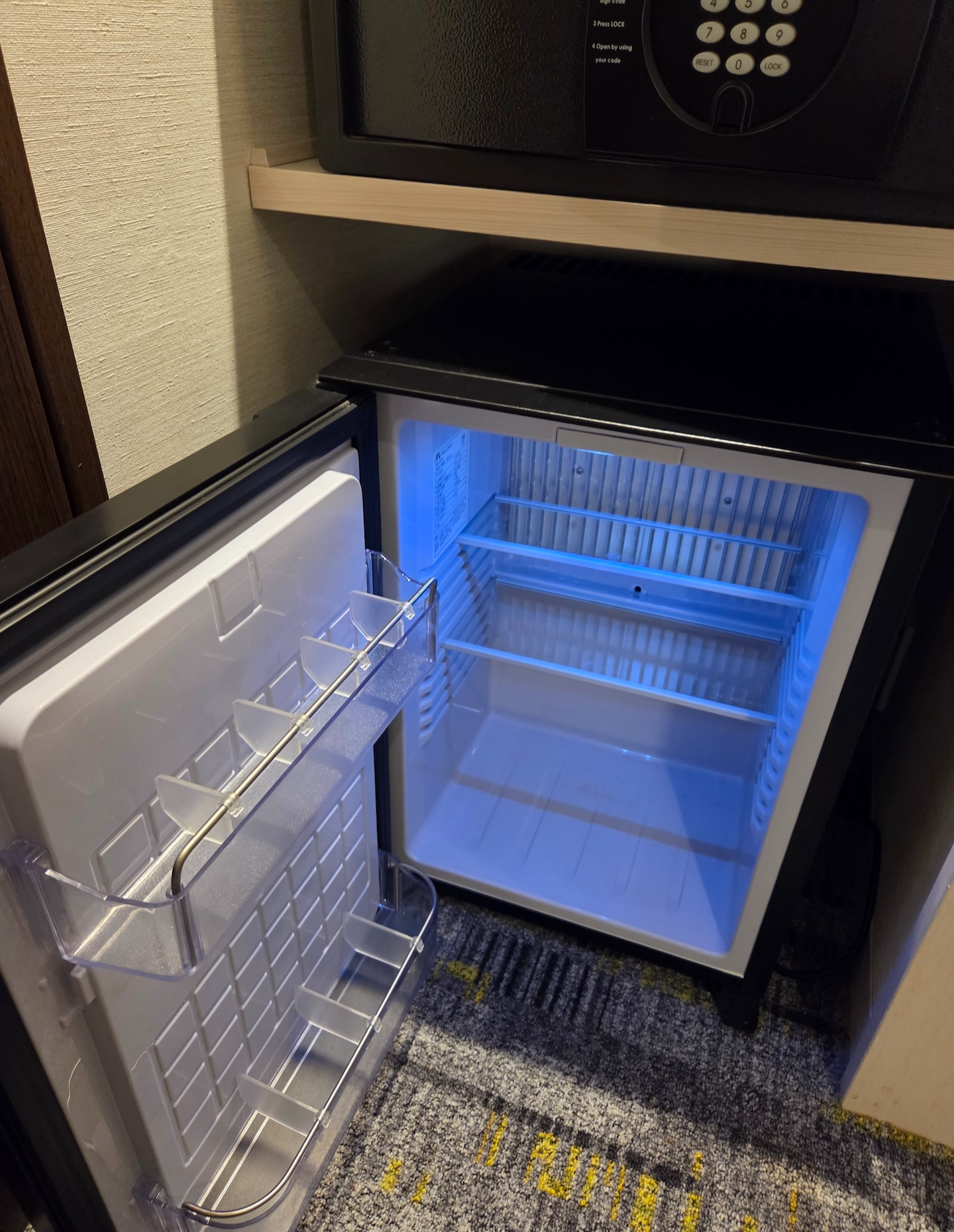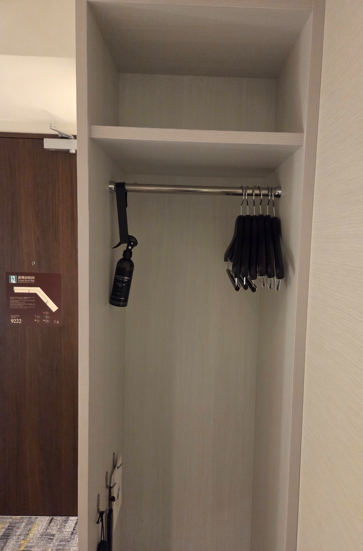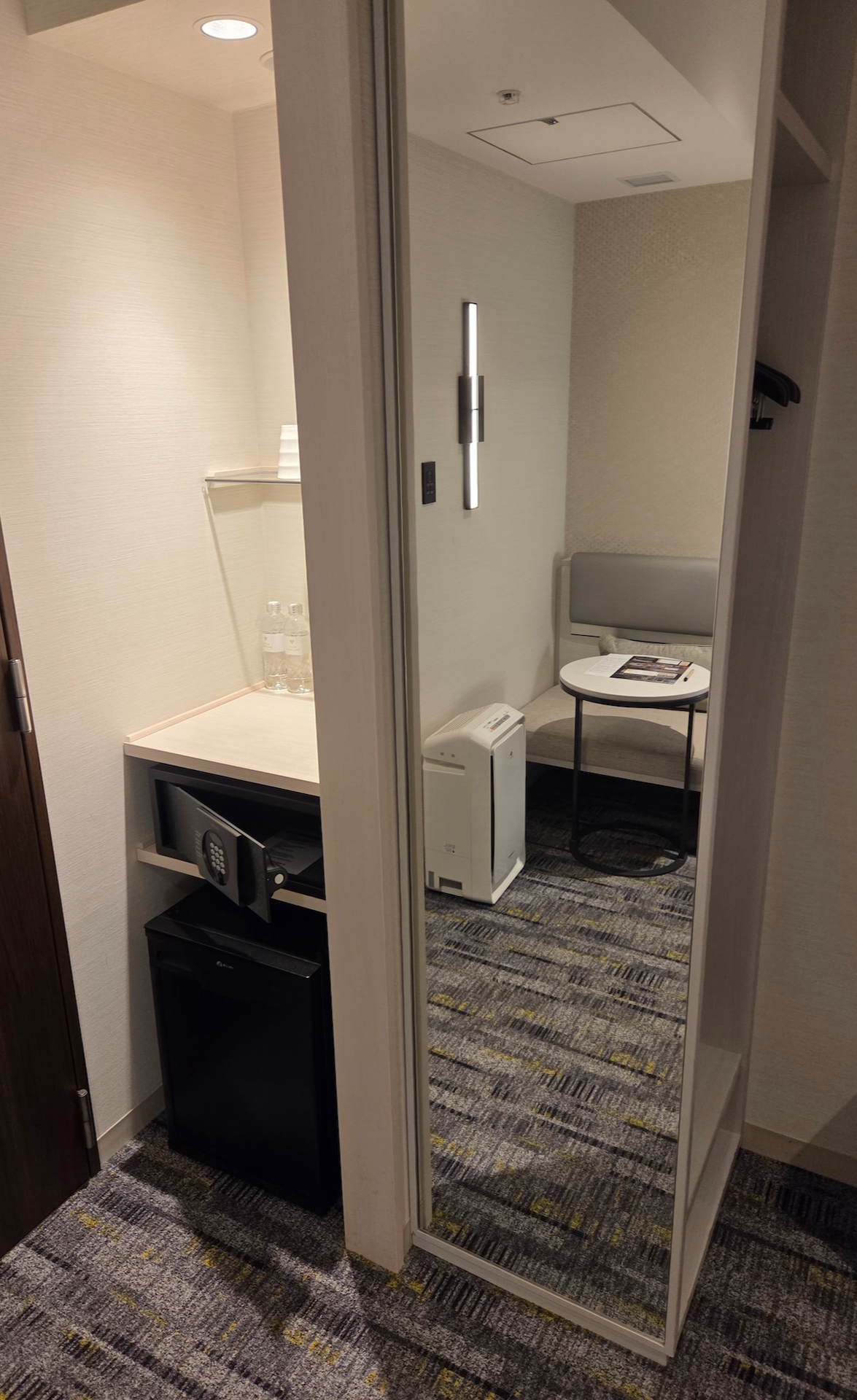 호텔 빌라 폰테누 그랜드 하네다 공항 Moderate 퀸 룸 냉장고와 옷장 출입구 옆으로는 커피 스테이션과 냉장고, 금고가 놓여있는 공간이 있고 그 옆으로는 오픈된 형태의 옷장이 있습니다. 옷장에는 옷걸이 6개가 있었고 옷장 옆으로는 전신 거울이 설치되어 있었습니다.