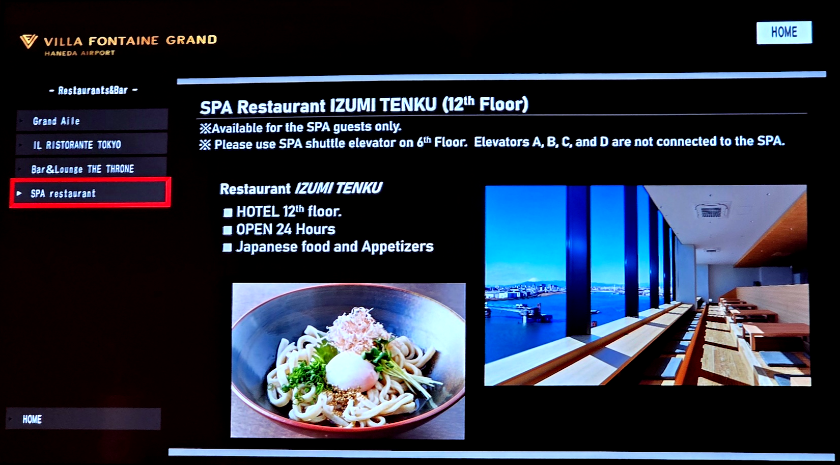 호텔 빌라 폰테누 그랜드 하네다 공항 스파 레스토랑 이즈미 텐쿠 호텔 빌라 폰테누 그랜드 하네다 공항의 식당으로는 위에서 언급한 올 데이 다이닝 그랜드 에일, 일 리스토란테 도쿄, 바 & 라운지 더 슬론, 스파 레스토랑 이즈미 텐쿠가 있습니다. 올 데이 다이닝 그랜드 에일은 조식뿐 아니라 점심 뷔페, 저녁 뷔페도 이용이 가능합니다. 일 리스토란테 도쿄는 일본의 제철 식재료를 사용한 이탈리안 식당으로 아침, 점심, 저녁 이용이 가능하고, 바 & 라운지 더 슬론은 타마 강과 맞은편 도시의 야경을 감상하며 우아한 분위기에서 칵테일과 음료를 즐길 수 있는 바입니다. 참고로 일 리스토란테 도쿄와 바 & 라운지 더 슬론은 호텔 빌라 폰테누 그랜드 하네다 공항 부분이 아닌 호텔 빌라 폰테누 프리미어 하네다 공항에 위치해 있습니다. 마지막으로 스파 레스토랑 이즈미 텐쿠는 온천 시설 내부에 위치한 식당으로 24시간 운영이 가능하며 간단한 일식과 음료를 제공합니다.
