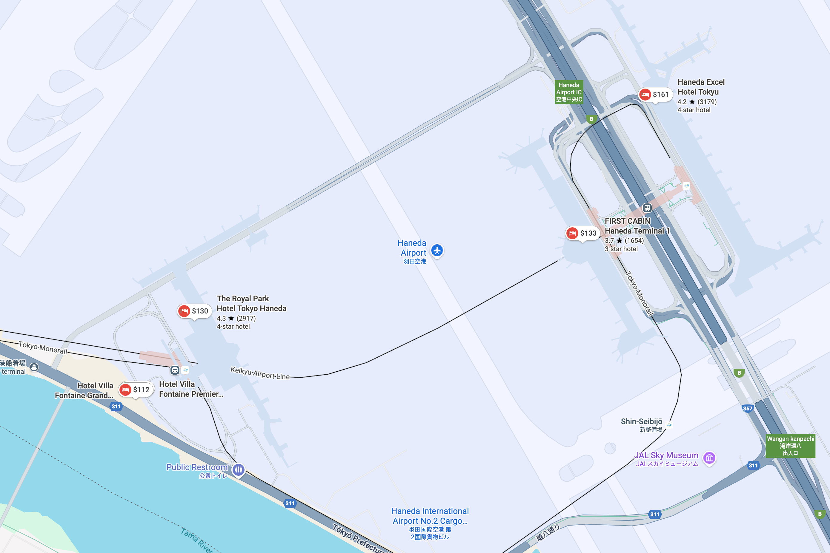 도쿄 하네다 국제 공항 내부의 다른 호텔들 (c) google.com/maps 참고로 터미널 1이나 2를 이용하신다면 각 터미널에 위치한 '퍼스트 캐빈'이나 '엑셀 호텔 도큐'가 더 편리할 수 있습니다. 또한 터미널 3 인근에는 고급 브랜드인 '빌라 폰테누 프리미어'와 '더 로얄 파크 호텔 도쿄 하네다'도 있습니다. 다만, 빌라 폰테누 프리미어는 가격이 2배 정도 높고, 더 로얄 파크 호텔 도쿄 하네다는 오픈한 지 10년이 넘어 룸 컨디션이 다소 노후화되었다는 점을 고려하셔서 머무실 곳을 정하시는 걸 추천드립니다.