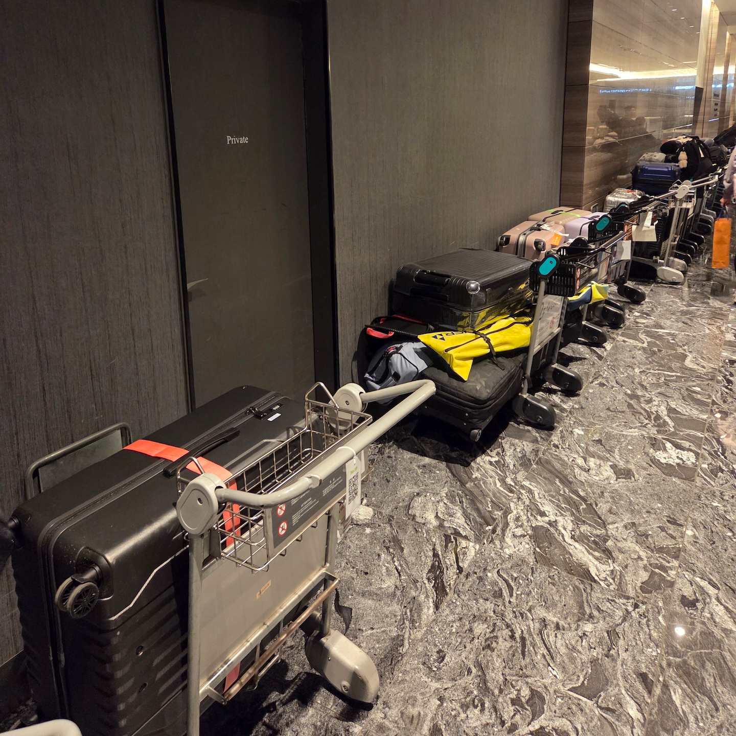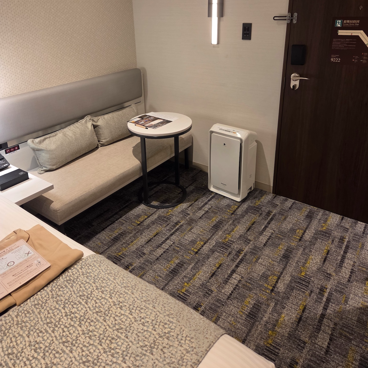 호텔 빌라 폰테누 그랜드 하네다 공항 내부 복도 호텔 빌라 폰테누 그랜드 하네다 공항에 머무르면서 불편했던 점이 몇 개가 있습니다. 일단 호텔 복도가 꽤 긴 편이라 일부 방의 경우 엘리베이터에서부터 꽤 오래 걸어가야 한다는 단점이 있습니다. 제가 묵었던 방은 9222호였는데요, 제 방도 엘리베이터에서 2분 정도 걸어가야 했습니다. 특히 제가 묵은 층에서 9201, 9202호는 더 멀리 떨어져 있어서 엘리베이터에서 더 많이 걸어가야 하는데요, 복도 바닥이 카펫으로 되어 있어서 캐리어를 끌고 가기에 쉽지 않습니다. 따라서 엘리베이터에서 먼 방으로 배정받으신 경우 이점 참고하셔서 캐리어 카트를 이용하시는 걸 고려하시기 바랍니다.
