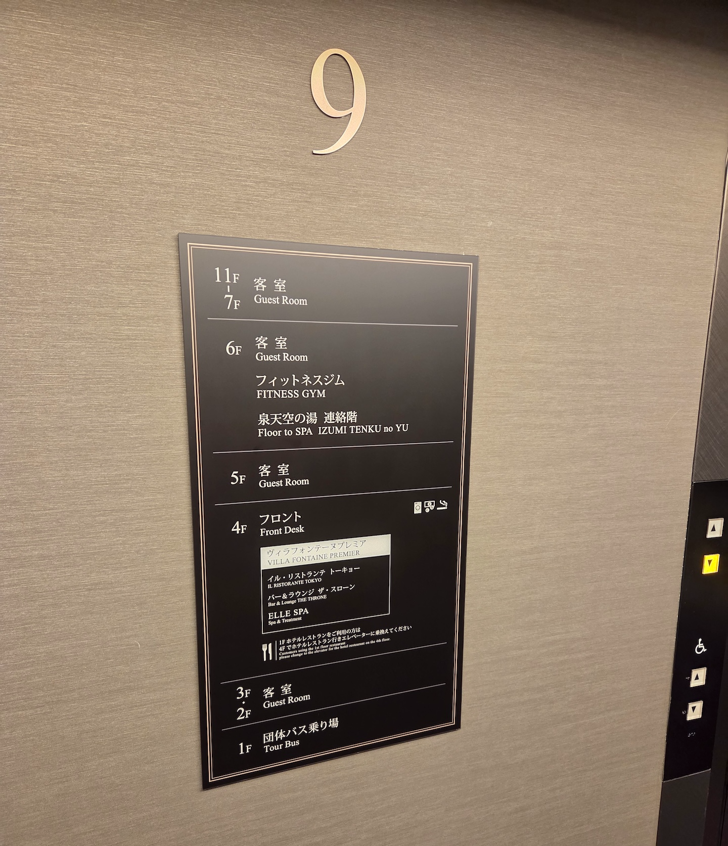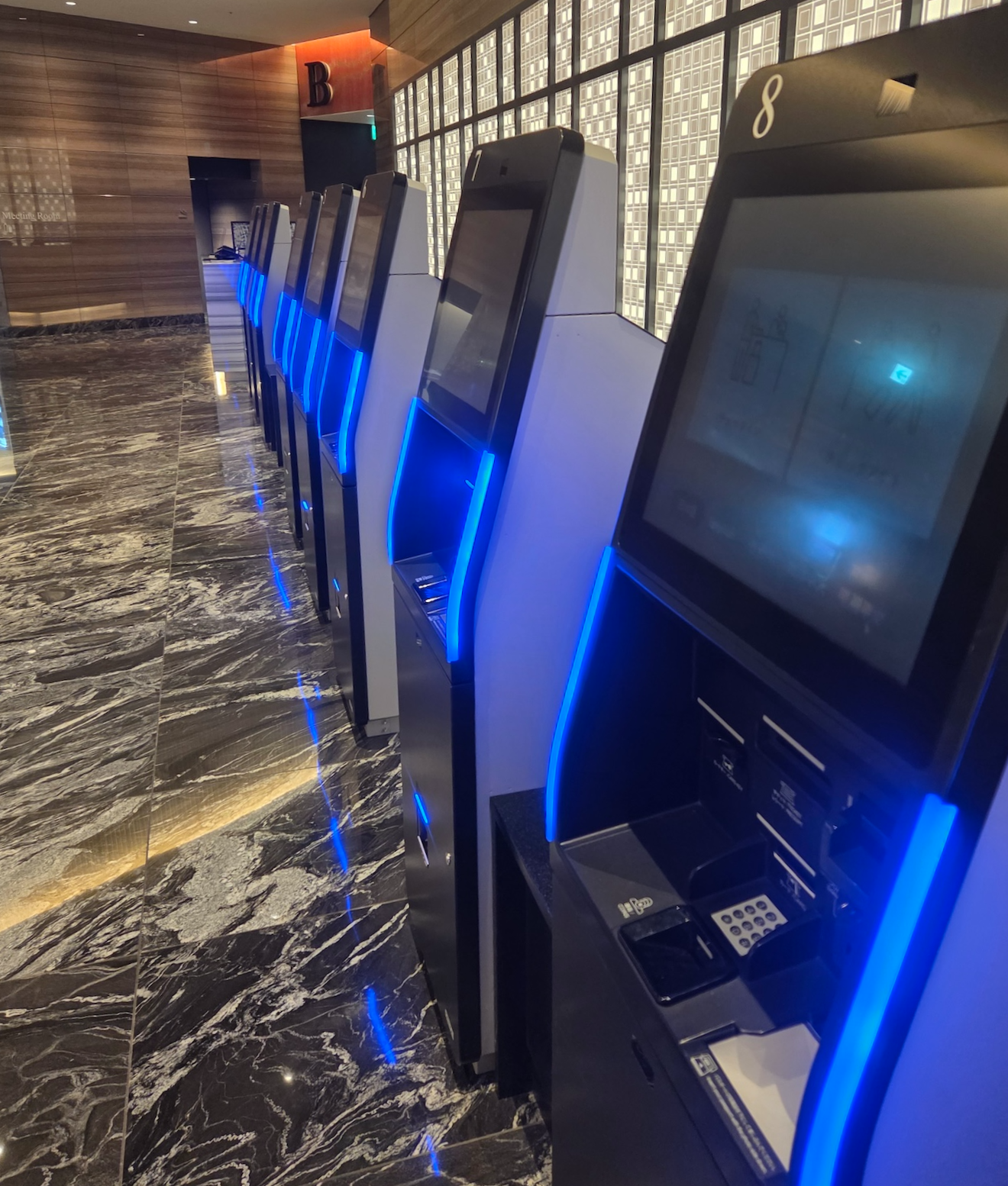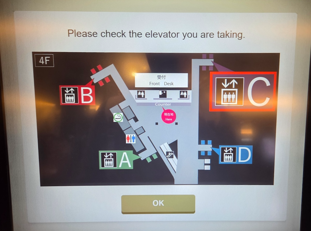 호텔 빌라 폰테누 그랜드 하네다 공항 네 개의 엘리베이터 체크인은 보통 키오스크를 통해 이루어집니다. 약 10대의 키오스크가 마련되어 있고 상주하는 직원분들도 계셔서 긴 기다림 없이 수월하게 진행할 수 있었습니다. 모든 숙박객의 여권을 스캔하면 카드 키와 함께 룸 정보가 적힌 종이가 나옵니다. 이 종이에는 객실 번호, 인원, 체크아웃 시간과 더불어 가장 중요한 엘리베이터 번호가 쓰여 있습니다. 1,500실이 넘는 대형 호텔이라 엘리베이터가 여러 구역으로 나뉘어 있어, 지정된 번호의 엘리베이터를 타지 않으면 배정받은 방으로 가기가 매우 어렵기 때문입니다. 엘리베이터 로비 진입과 엘리베이터 작동 모두 카드 키가 필요합니다.