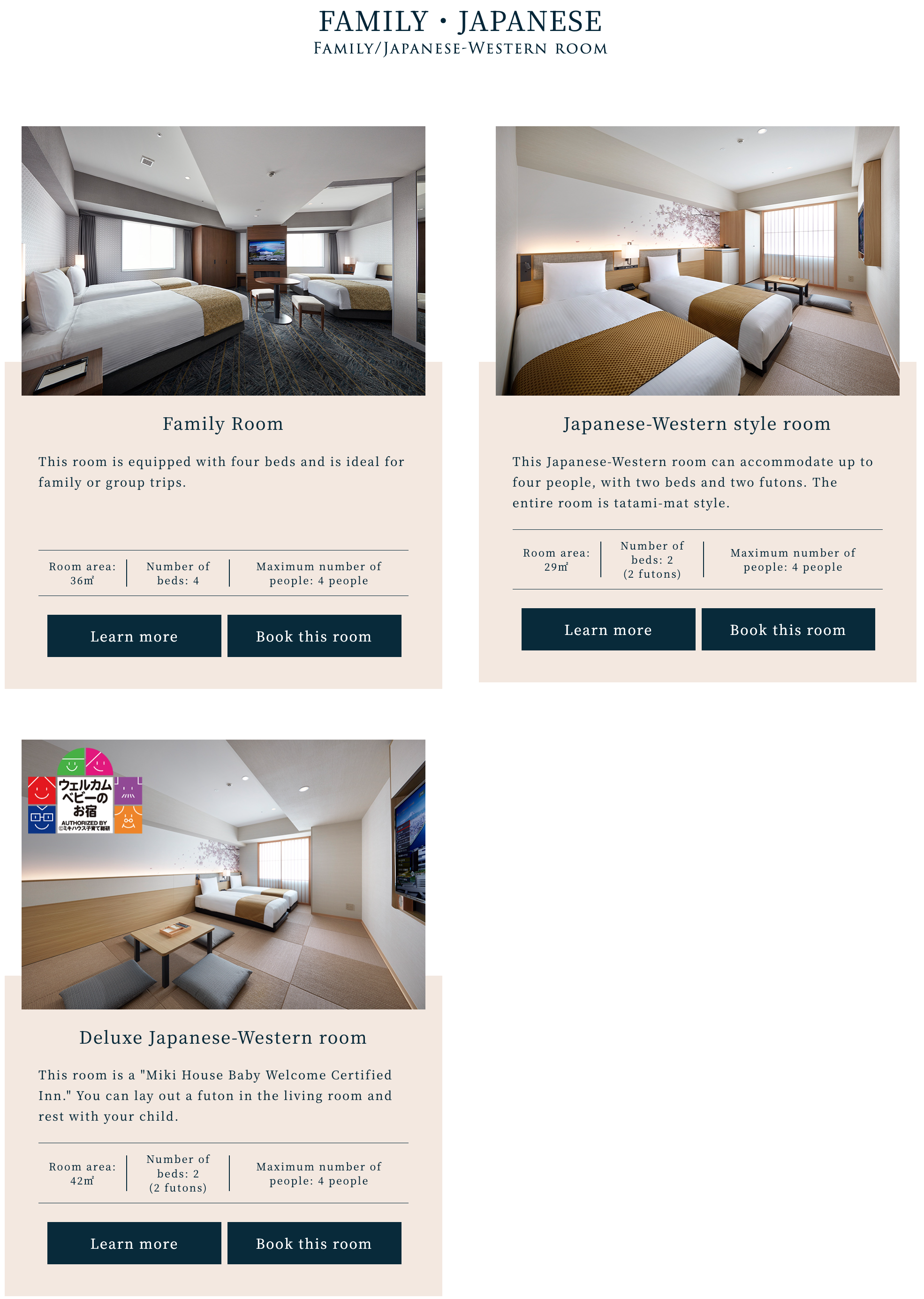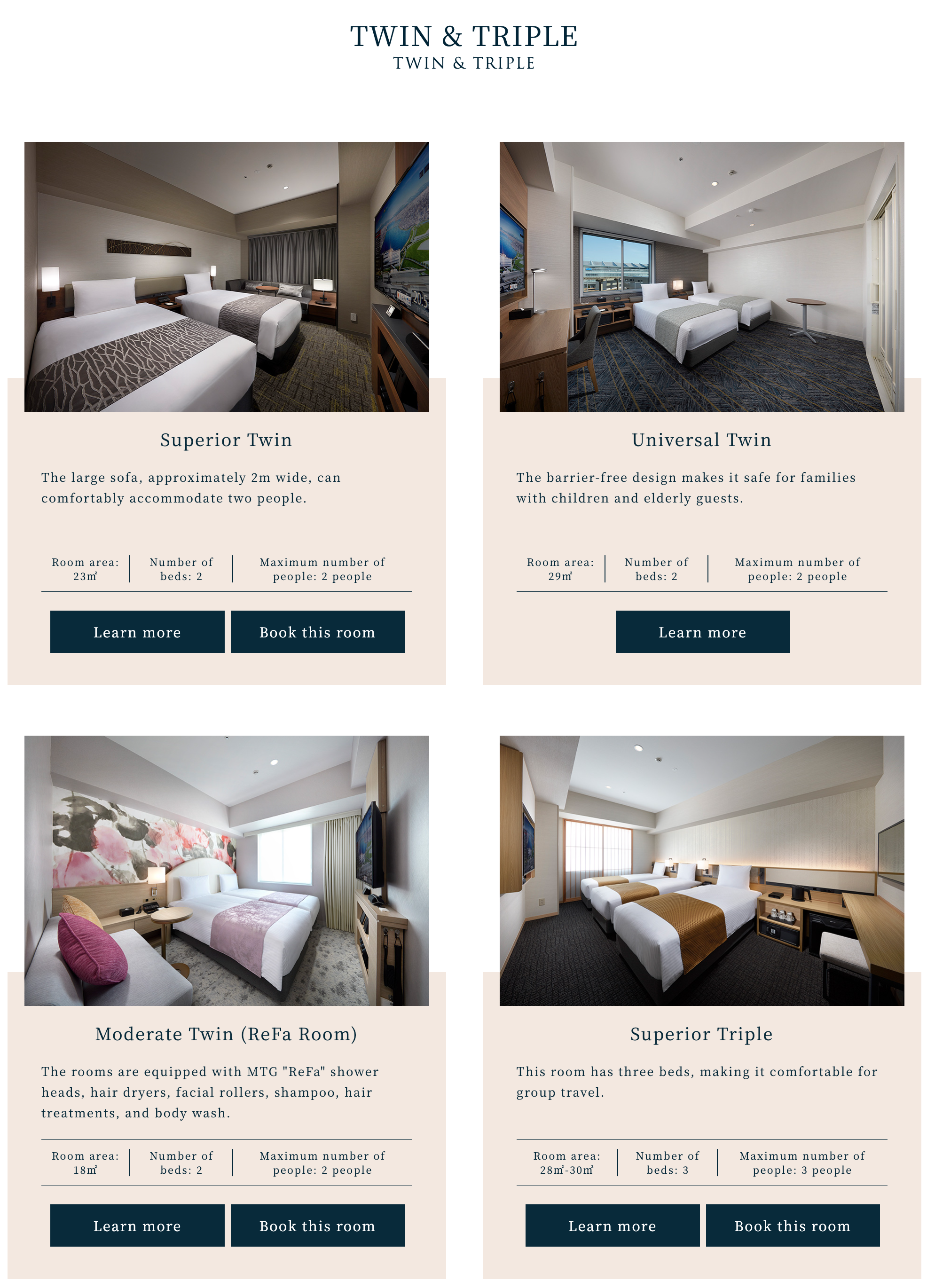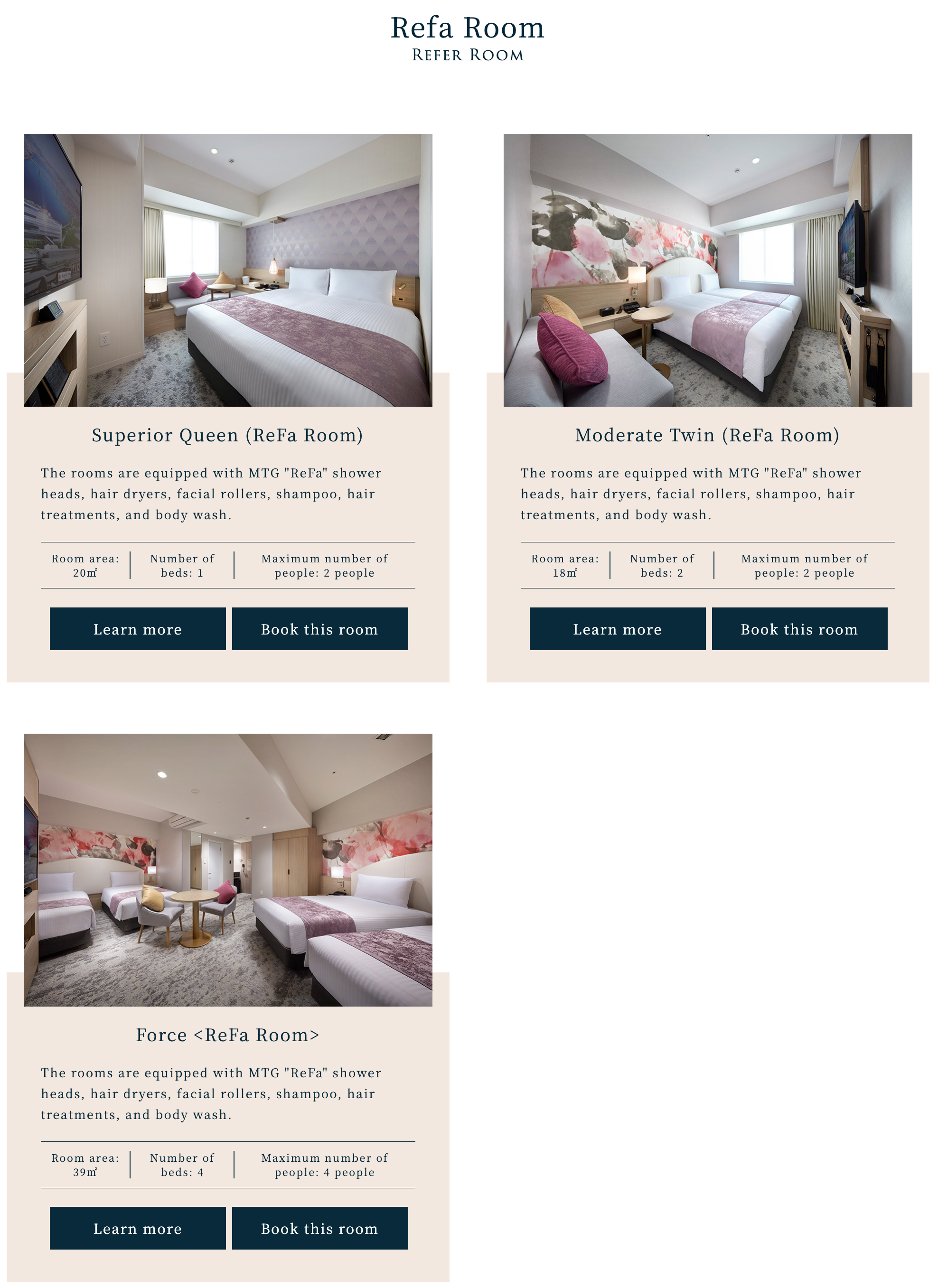호텔 빌라 폰테누 그랜드 하네다 공항 패밀리 룸과 일본 뷰티 브랜드 Refa와 협업한 Refa 룸(c) hvf.jp 3명이 투숙할 수 있는 방으로는 Superior 트리플 룸과 Superior 트윈 룸이 있습니다. Superior 트윈룸의 경우 위에서 언급한 같은 방에 소파베드를 하나 더 설치하는 형태로 3인이 투숙할 수 있으며 소파베드 설치에는 추가 요금을 지불해야 하며 가격은 비수기 최저가 기준 약 2만 엔 후반 대입니다. Superior 트리플룸의 경우 방 넓이는 28~30 제곱미터로 싱글 사이즈 침대 3개가 들어갑니다. 3명이 투숙하기에는 확실히 Superior Twin 룸에 비해 넉넉한 사이즈이지만 가격은 비수기 최저가 기준 약 9,000엔 정도 비싼 3만 엔 중후반대에 형성되어 있습니다. 마지막으로 4명이 투숙할 수 있는 방으로는 패밀리 룸과 Japanese-Western 스타일 디럭스 룸이 있습니다. 패밀리 룸의 경우 36~39 제곱미터 넓이에 싱글 사이즈 침대가 4개 들어가 있고 Japanese-Western 스타일 디럭스 룸은 42 제곱미터 넓이의 방에 싱글 사이즈 침대 2개에 이불 & 요 세트가 2개 제공되는 형태입니다. 두 타입사이의 가격차이는 크지 않으며 가격은 비수기 최저가 기준 약 4만 엔 중반에서 시작합니다.