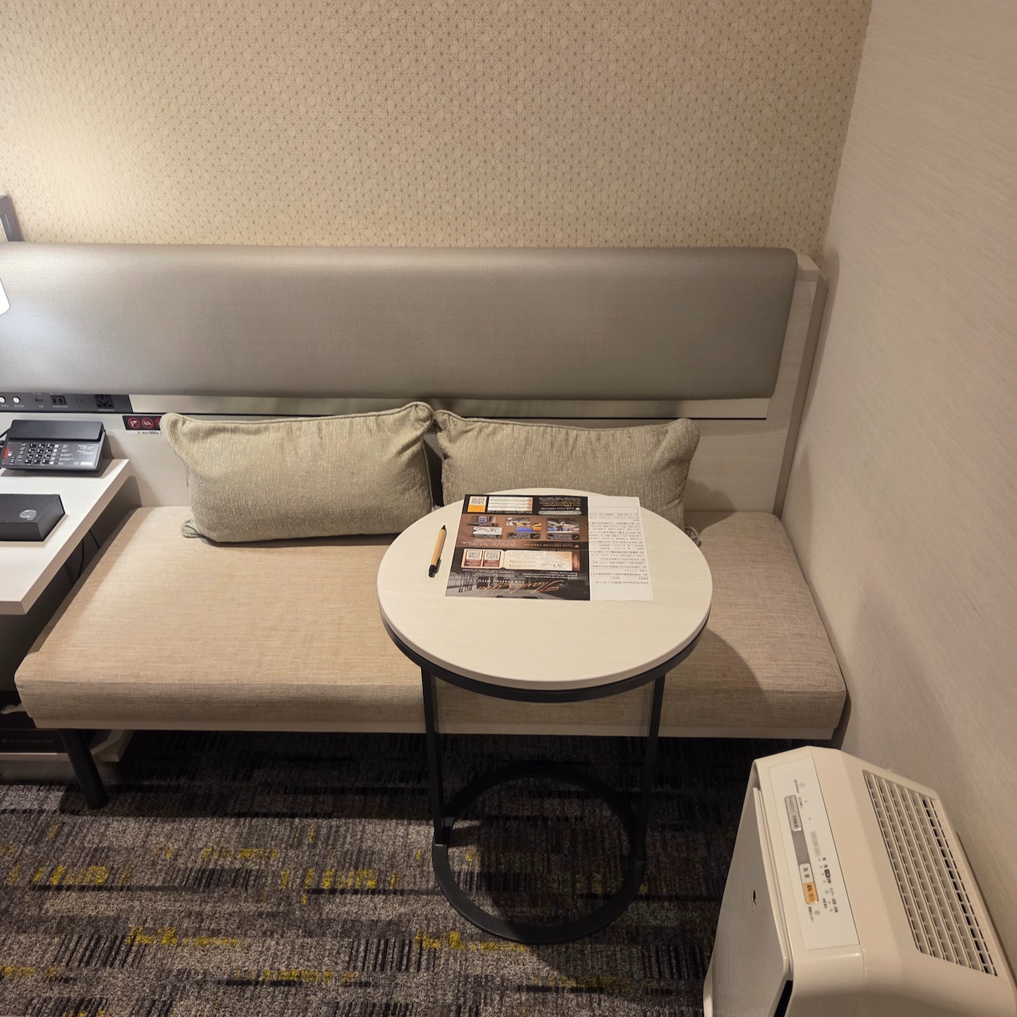 호텔 빌라 폰테누 그랜드 하네다 공항 Moderate 퀸 룸 소파와 사이드 테이블 제가 이용한 방은 Moderate 퀸 룸으로 방 넓이가 18 제곱미터인 작은 방이기에 방이 한눈에 들어옵니다. 방 안에는 퀸 사이즈 침대와 두 병이 앉을 수 있는 작은 소파가 사이드 테이블이 있습니다.