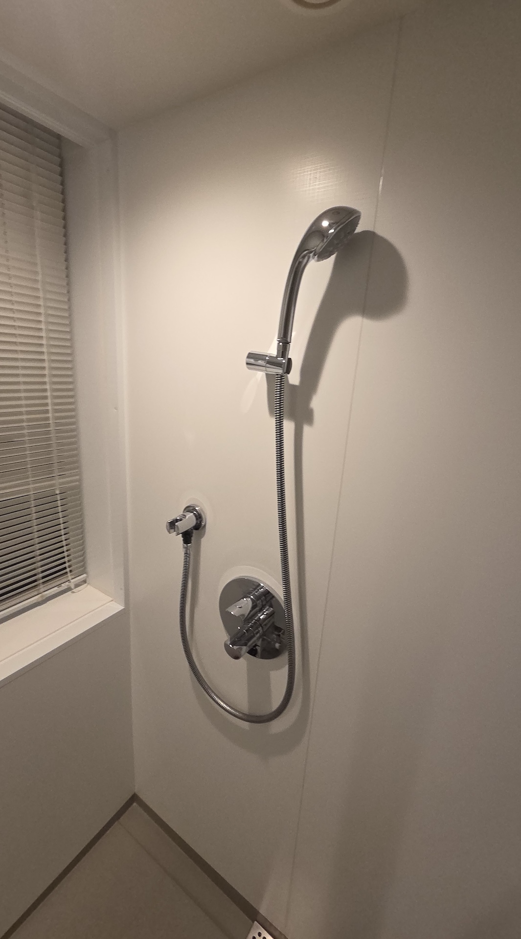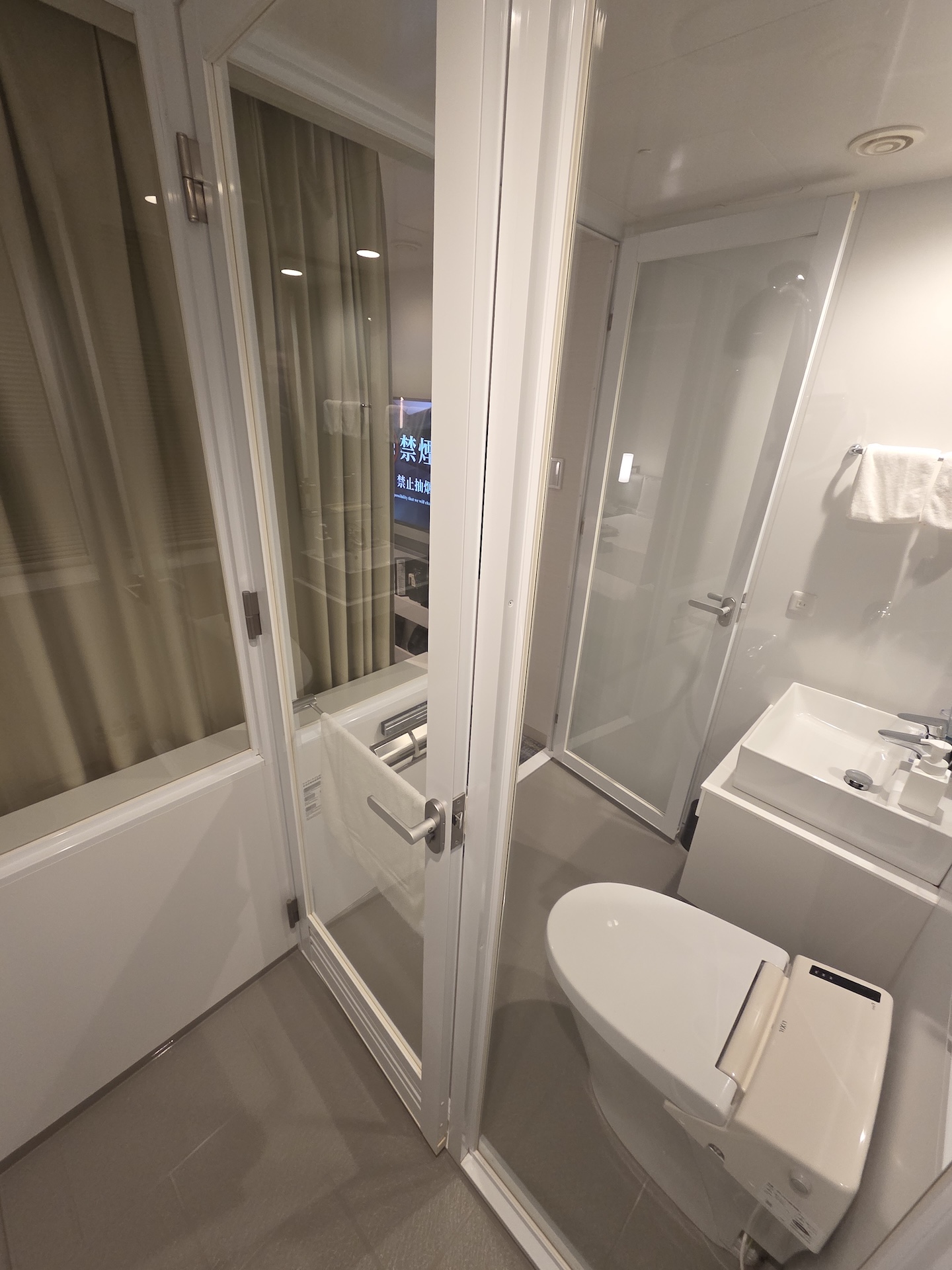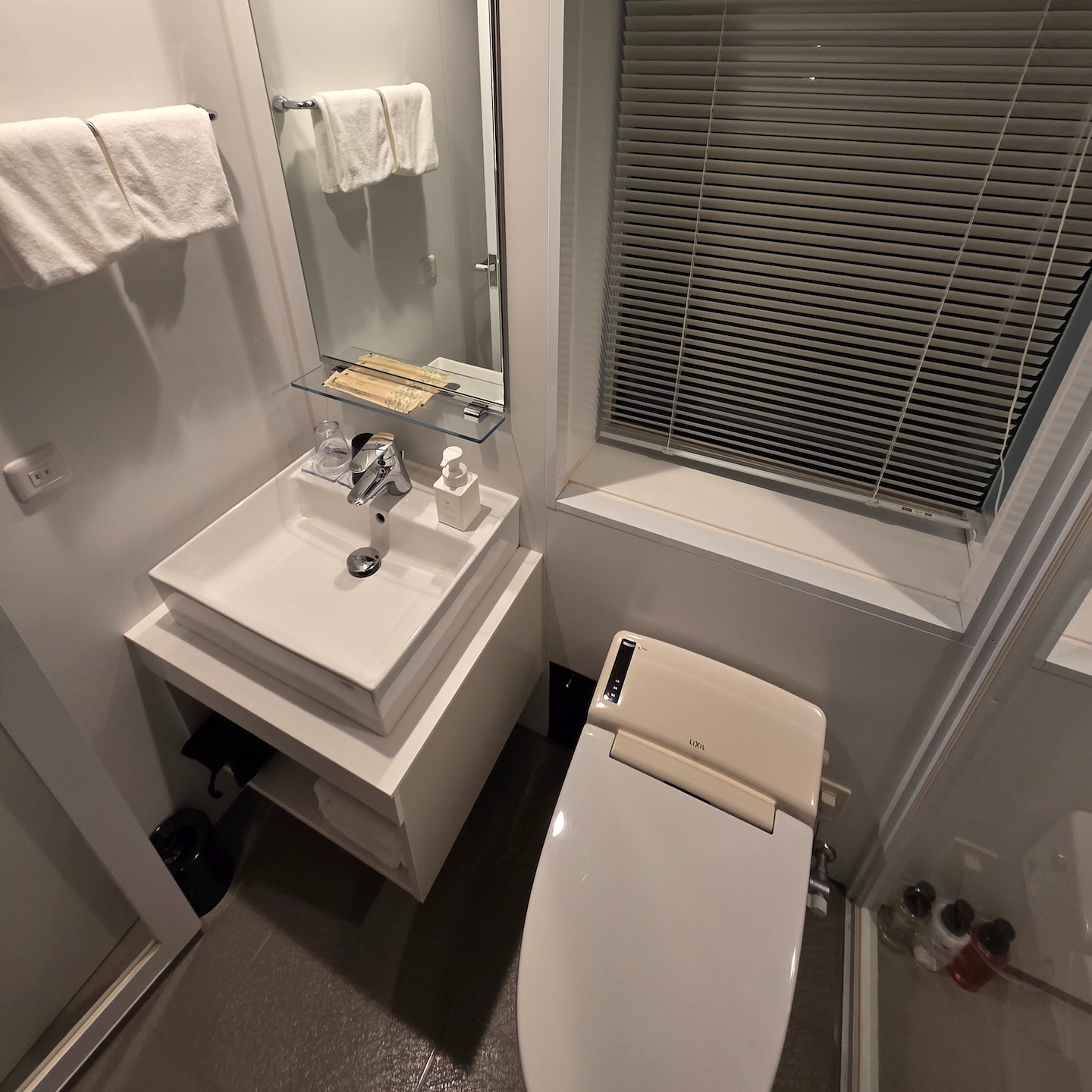 호텔 빌라 폰테누 그랜드 하네다 공항 Moderate 퀸 룸 샤워실 화장실은 세면대와 변기가 있는 공간과 샤워실로 나뉘어 있습니다. 세면대 공간은 넓지 않아서 개인 물품을 놓기 위한 공간으로는 세면대 대신 세면대 아래에 있는 공간이나 변기 뒤 창문 앞 공간을 활용해야 합니다. 화장실에는 헤어드라이어를 이용할 수 있는 110v 전원 포트 1구가 세면대 옆으로 있었고, 일본인만큼 변기에는 비데가 설치되어 있었습니다. 샤워실의 경우 정말 밀폐되는 샤워실이었고 샤워기와 더불어 천장에서 물이 떨어지는 해바라기형 샤워실도 설치되어 있었습니다.