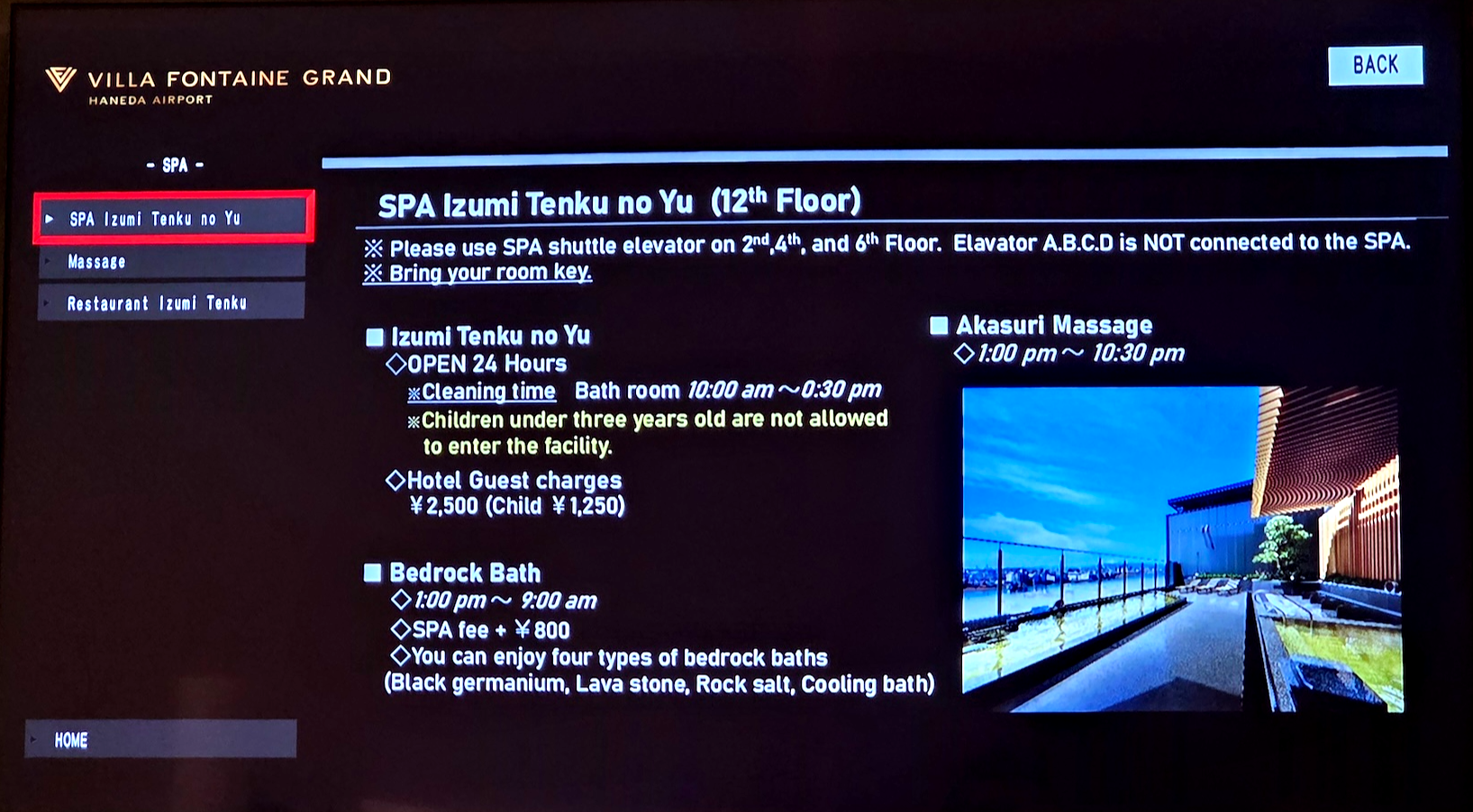 호텔 빌라 폰테누 그랜드 하네다 공항 온천 안내문