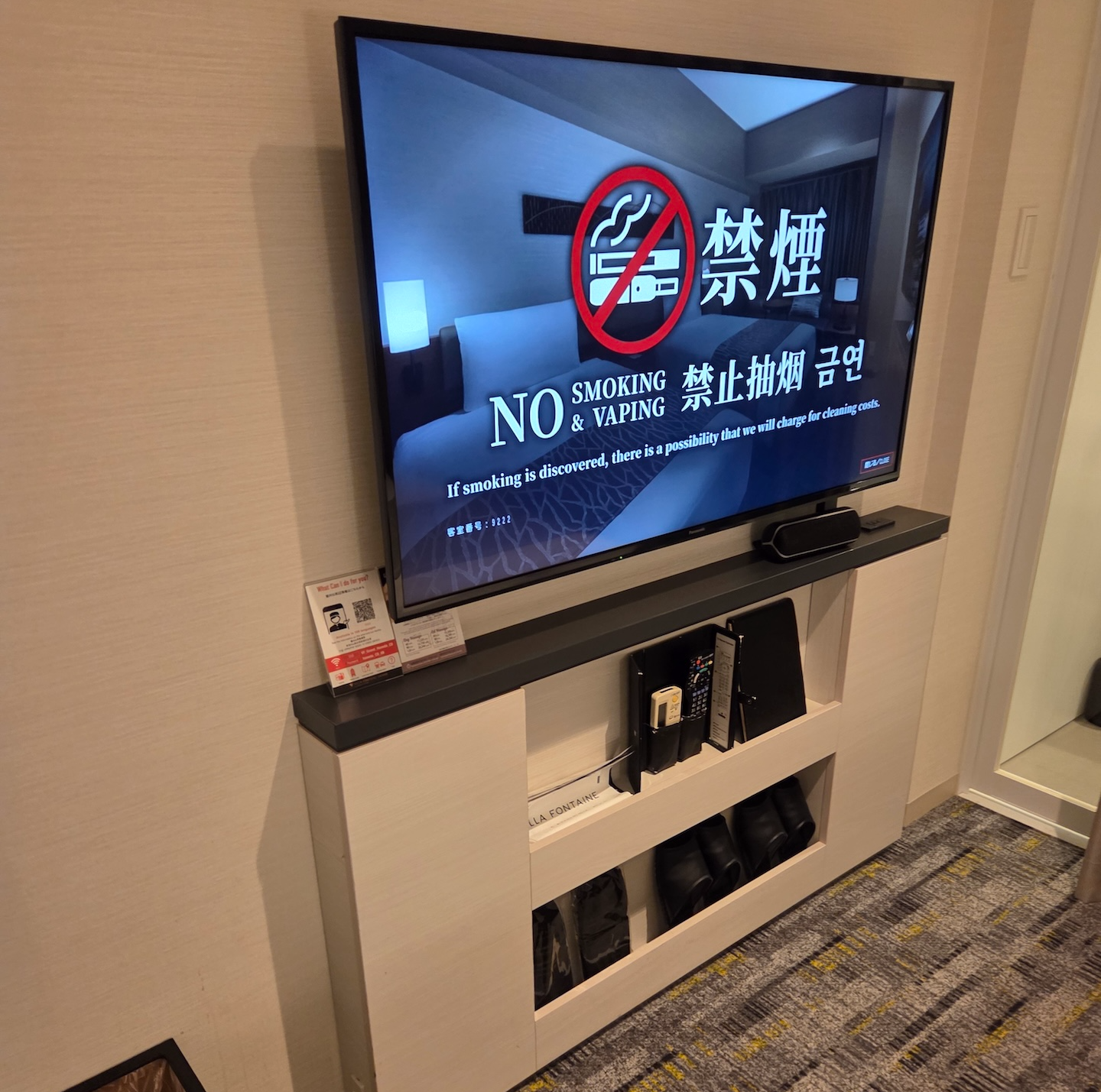 호텔 빌라 폰테누 그랜드 하네다 공항 Moderate 퀸 룸 TV 침대 앞으로는 TV와 더불어 블루투스 스피커, 리모컨, 호텔 안내 책자, 슬리퍼 등이 놓여있는 수납공간이 마련되어 있었습니다.