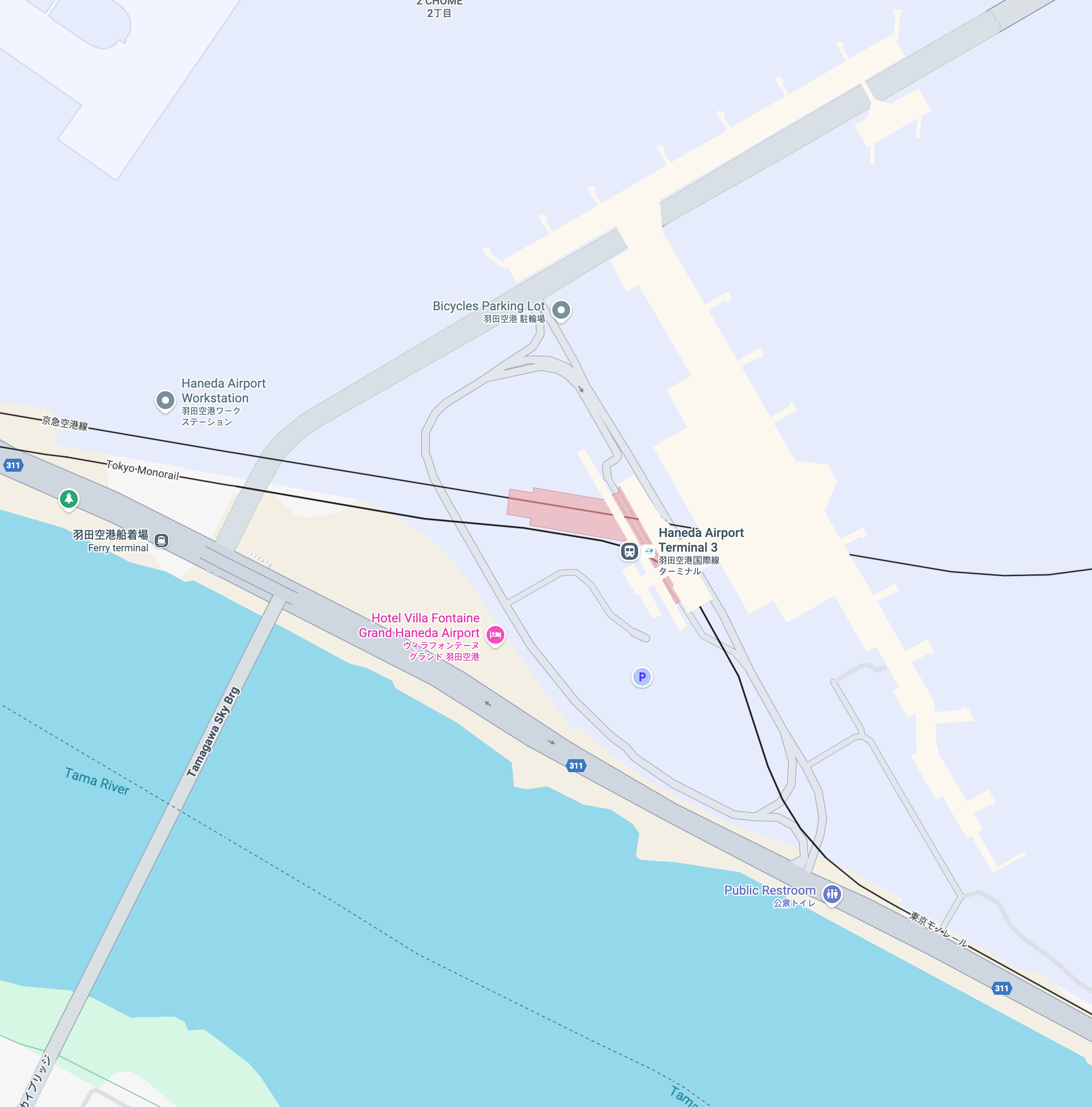 호텔 빌라 폰테누 그랜드 하네다 공항 위치 (c) google.com/maps 호텔 빌라 폰테누 그랜드 하네다 공항은 도쿄 하네다 국제공항 내부에 위치해 있습니다. 하네다 공항의 국제선 전용 터미널인 제3터미널(T3)과 연결된 쇼핑몰 '하네다 에어포트 가든' 내에 자리 잡고 있어 최고의 접근성을 자랑합니다. 터미널 3에서 도보로 10분 정도면 이동이 가능한 데다, 실내 연결통로로 이어져 있어 날씨와 상관없이 쾌적하게 이동할 수 있습니다. 특히 수하물 카트를 끌고 객실 근처까지 갈 수 있다는 점은 큰 장점입니다. 따라서 오버나잇 환승객이나 이른 아침 항공편을 이용하는 여행객에게 최적의 선택지입니다.