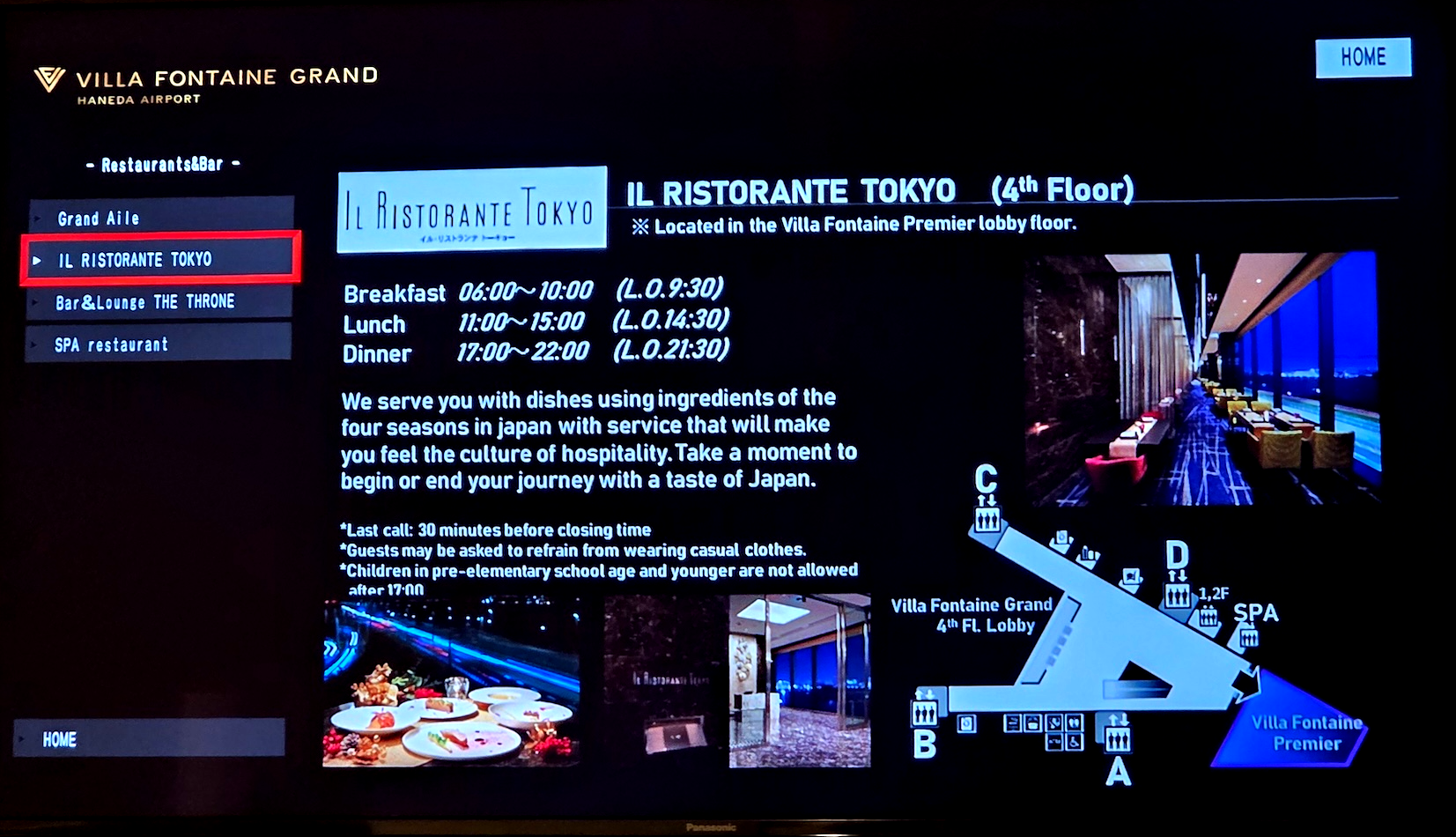 호텔 빌라 폰테누 그랜드 하네다 공항 조식 저는 다음날 아침 일찍 호텔을 떠날 예정이라 조식을 이용하지는 않았습니다. 호텔 빌라 폰테누 그랜드 하네다 공항의 조식은 1층에 위치한 식당인 All Day Dining Grand Aile에서 제공이 됩니다. 조식은 오전 6시부터 오전 10시까지 제공되며 마지막 입장은 오전 9시 30분입니다. 가격은 성인 3,500엔, 소인은 1,750엔이며 뷔페 형식으로 제공됩니다.