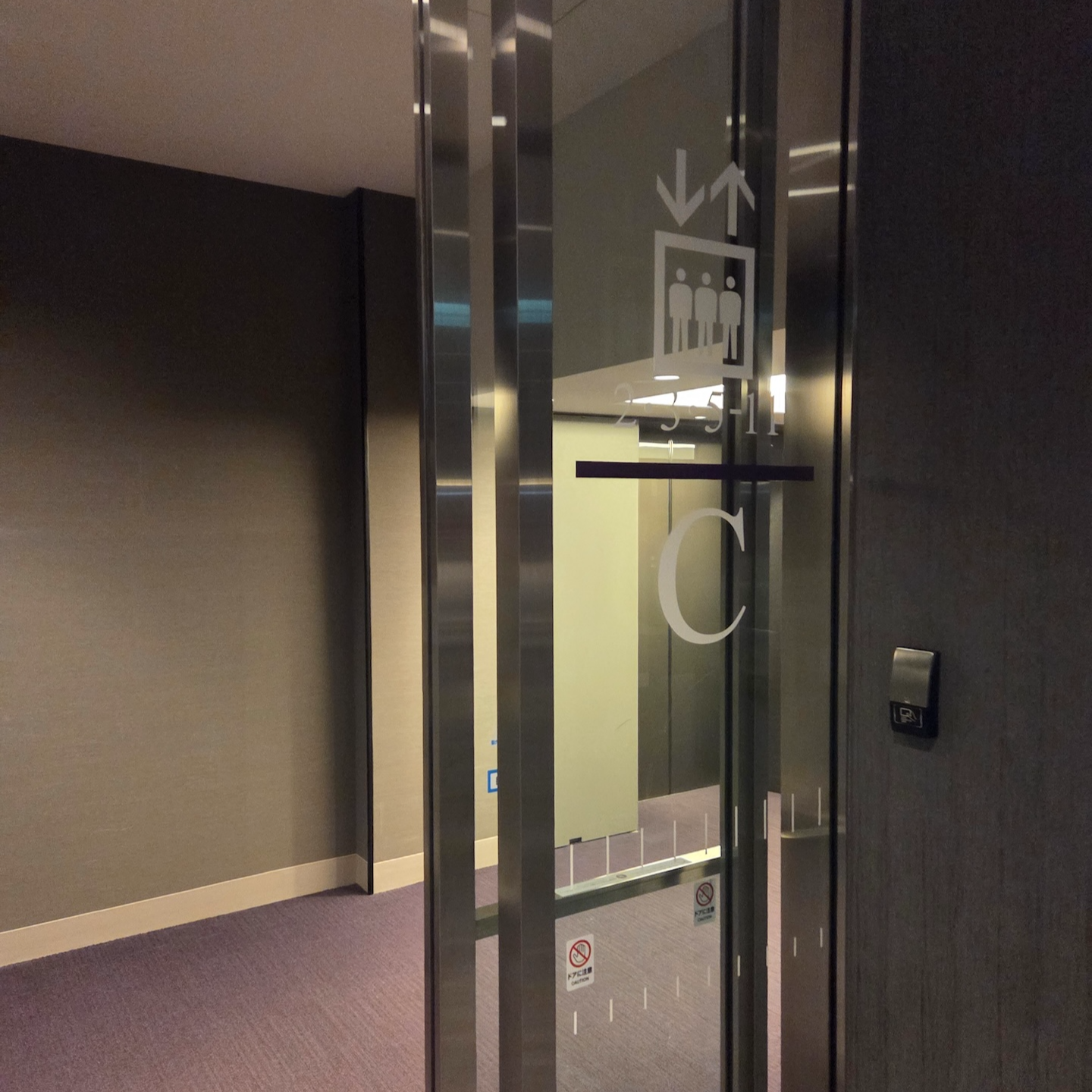 호텔 빌라 폰테누 그랜드 하네다 공항 네 개의 엘리베이터 체크인은 보통 키오스크를 통해 이루어집니다. 약 10대의 키오스크가 마련되어 있고 상주하는 직원분들도 계셔서 긴 기다림 없이 수월하게 진행할 수 있었습니다. 모든 숙박객의 여권을 스캔하면 카드 키와 함께 룸 정보가 적힌 종이가 나옵니다. 이 종이에는 객실 번호, 인원, 체크아웃 시간과 더불어 가장 중요한 엘리베이터 번호가 쓰여 있습니다. 1,500실이 넘는 대형 호텔이라 엘리베이터가 여러 구역으로 나뉘어 있어, 지정된 번호의 엘리베이터를 타지 않으면 배정받은 방으로 가기가 매우 어렵기 때문입니다. 엘리베이터 로비 진입과 엘리베이터 작동 모두 카드 키가 필요합니다.