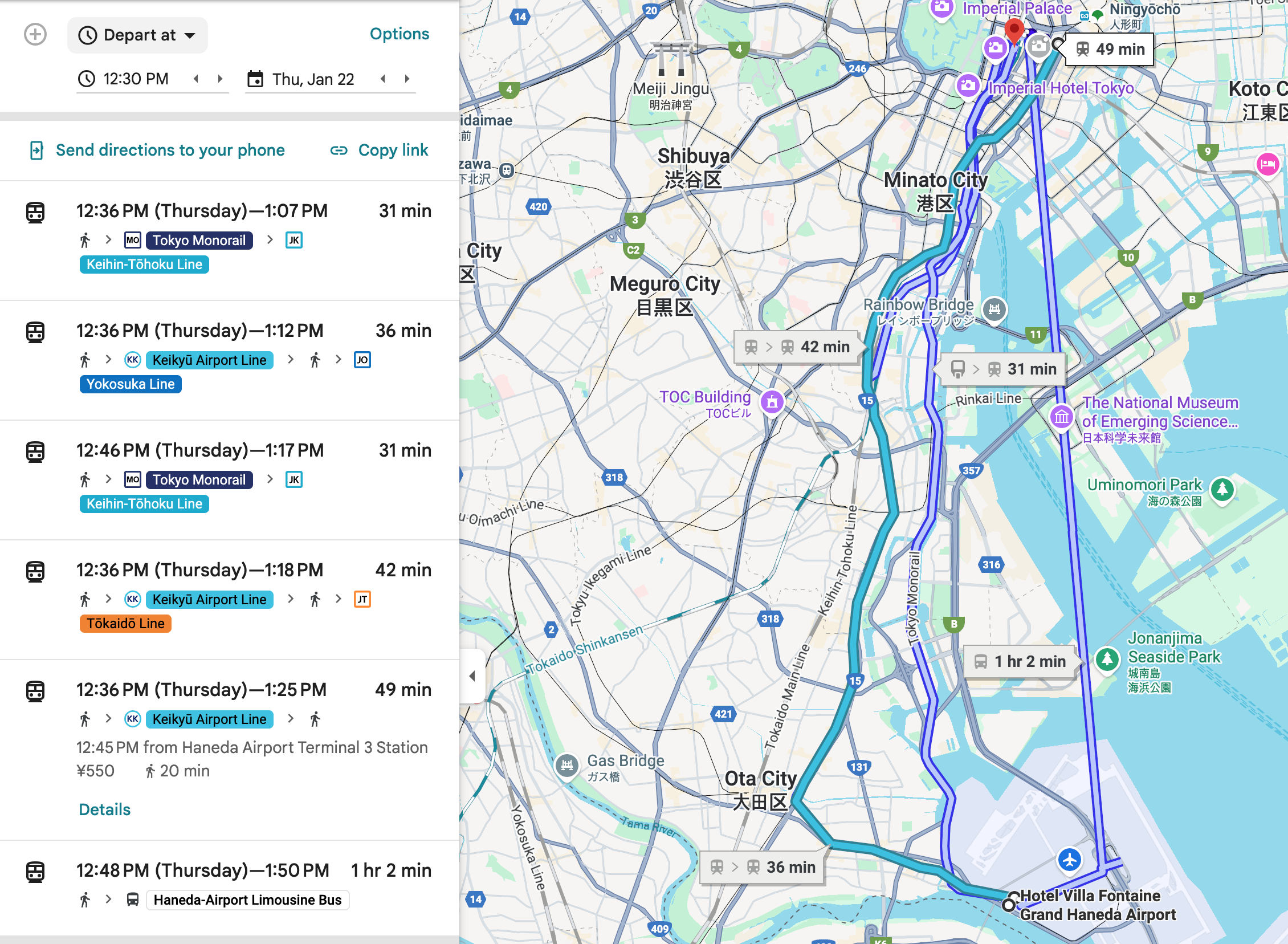 호텔 빌라 폰테누 그랜드 하네다 공항에서 도쿄역까지 가는 대중교통 (c) google.com/maps 도심과의 접근성도 뛰어납니다. 호텔에서 도쿄역까지는 약 30분, 우에노역은 약 40분, 신주쿠역은 약 50분 정도면 이동할 수 있습니다. 무거운 짐을 들고 리무진 버스나 지하철로 시내까지 이동하는 번거로움을 피하고 싶은 분들이라면, 이곳을 베이스캠프로 삼아 도쿄 여행을 즐기는 것도 좋은 전략입니다.