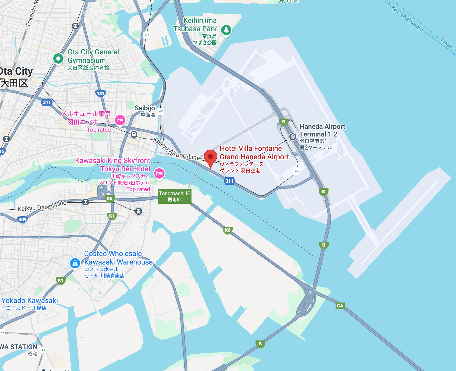 도쿄 하네다 국제 공항 내부의 다른 호텔들 (c) google.com/maps 참고로 터미널 1이나 2를 이용하신다면 각 터미널에 위치한 '퍼스트 캐빈'이나 '엑셀 호텔 도큐'가 더 편리할 수 있습니다. 또한 터미널 3 인근에는 고급 브랜드인 '빌라 폰테누 프리미어'와 '더 로얄 파크 호텔 도쿄 하네다'도 있습니다. 다만, 빌라 폰테누 프리미어는 가격이 2배 정도 높고, 더 로얄 파크 호텔 도쿄 하네다는 오픈한 지 10년이 넘어 룸 컨디션이 다소 노후화되었다는 점을 고려하셔서 머무실 곳을 정하시는 걸 추천드립니다.
