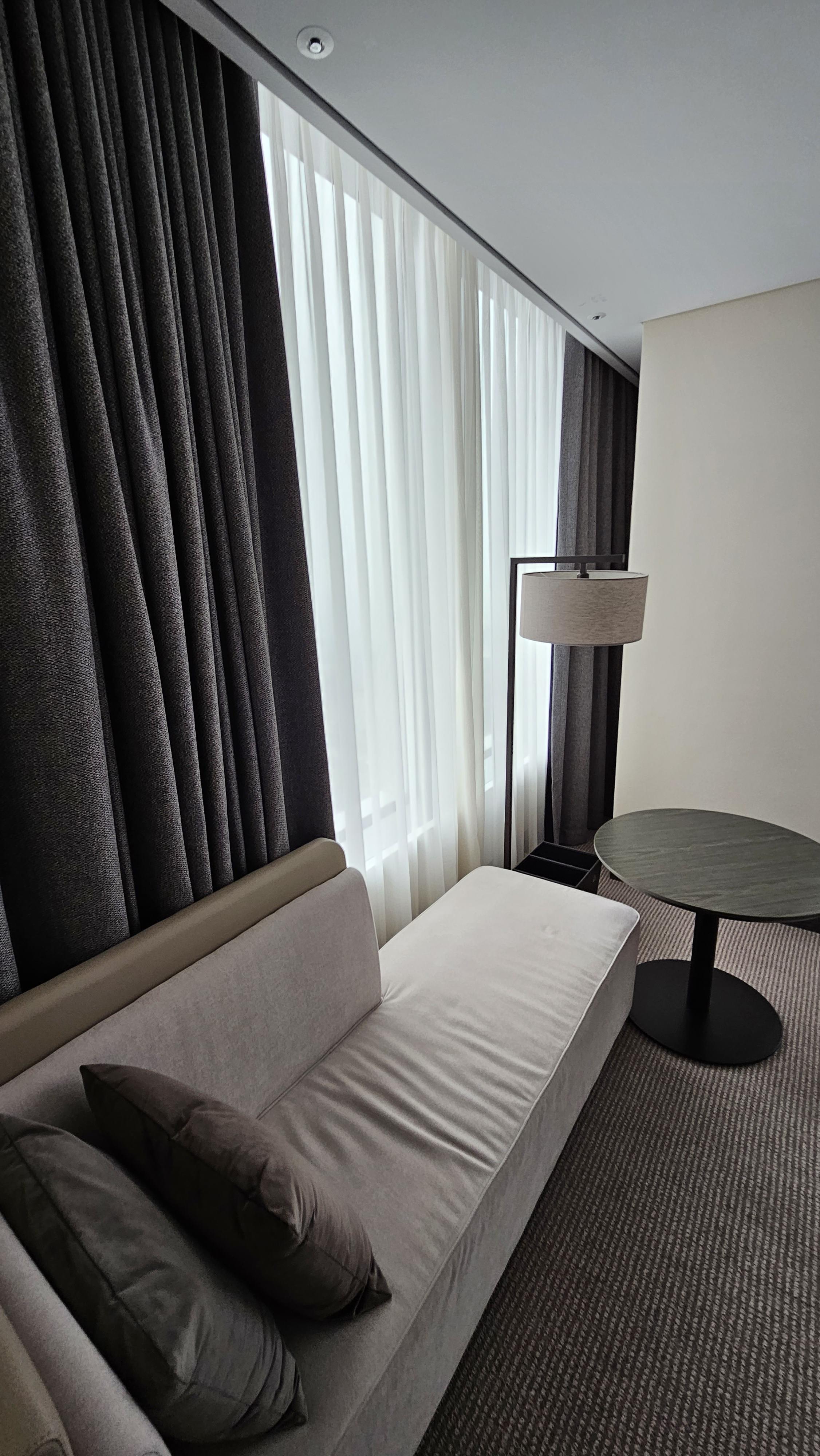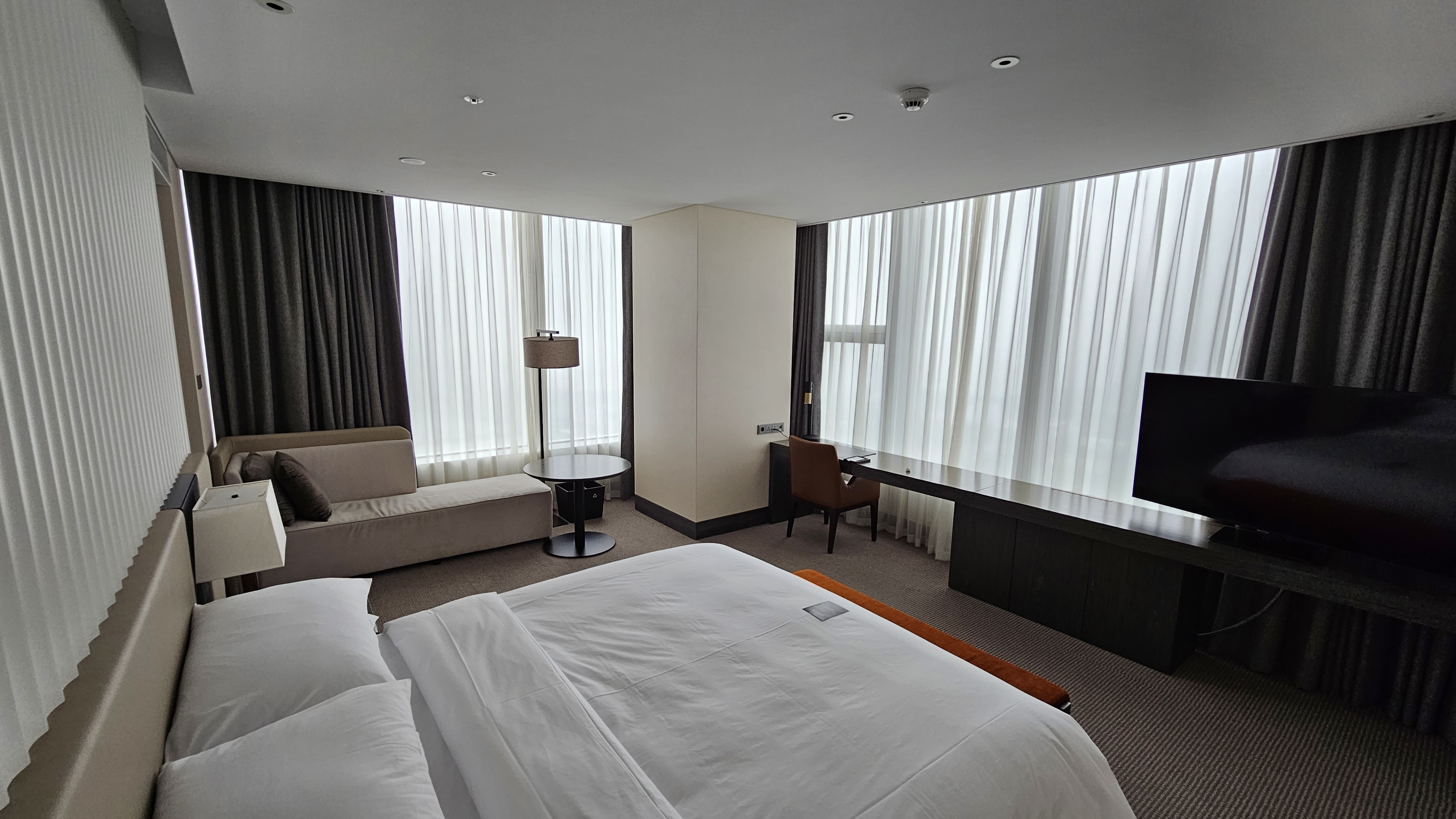 (c) Haedie's Doodles 2021년에 새로 개관한 호텔 답게 방과 침구 모두 깔끔하게 관리된 상태였습니다. 프리미어 코너룸의 경우 객실 한쪽에 거대한 기둥이 자리잡고 있는데 객실이 15평 정도로 넓은 만큼 크게 거슬리지는 않았습니다. 현관 바로 앞에는 옷장, 캐리어를 놓을 수 있는 선반이 자리잡고 있고 옷장 반대편으로는 화장실과 미니바가 자리잡고 있습니다. 입구의 짧은 복도를 지나면 오른쪽에 킹 사이즈 침대가 놓여있고 왼편에는 편하게 않으면 두명, 최대 세명까지 않을 수 있어 보이는 쇼파가 자리잡고 있습니다.