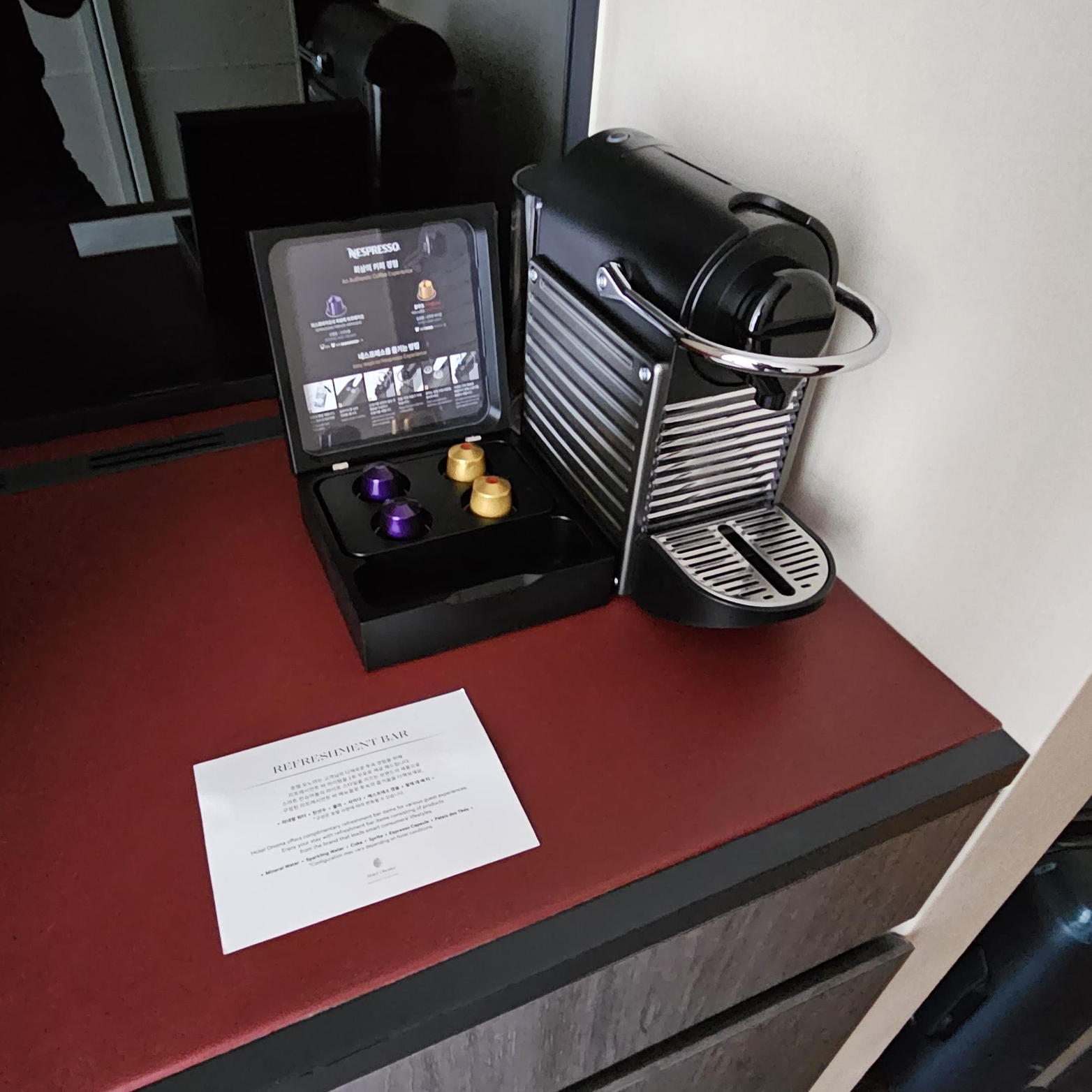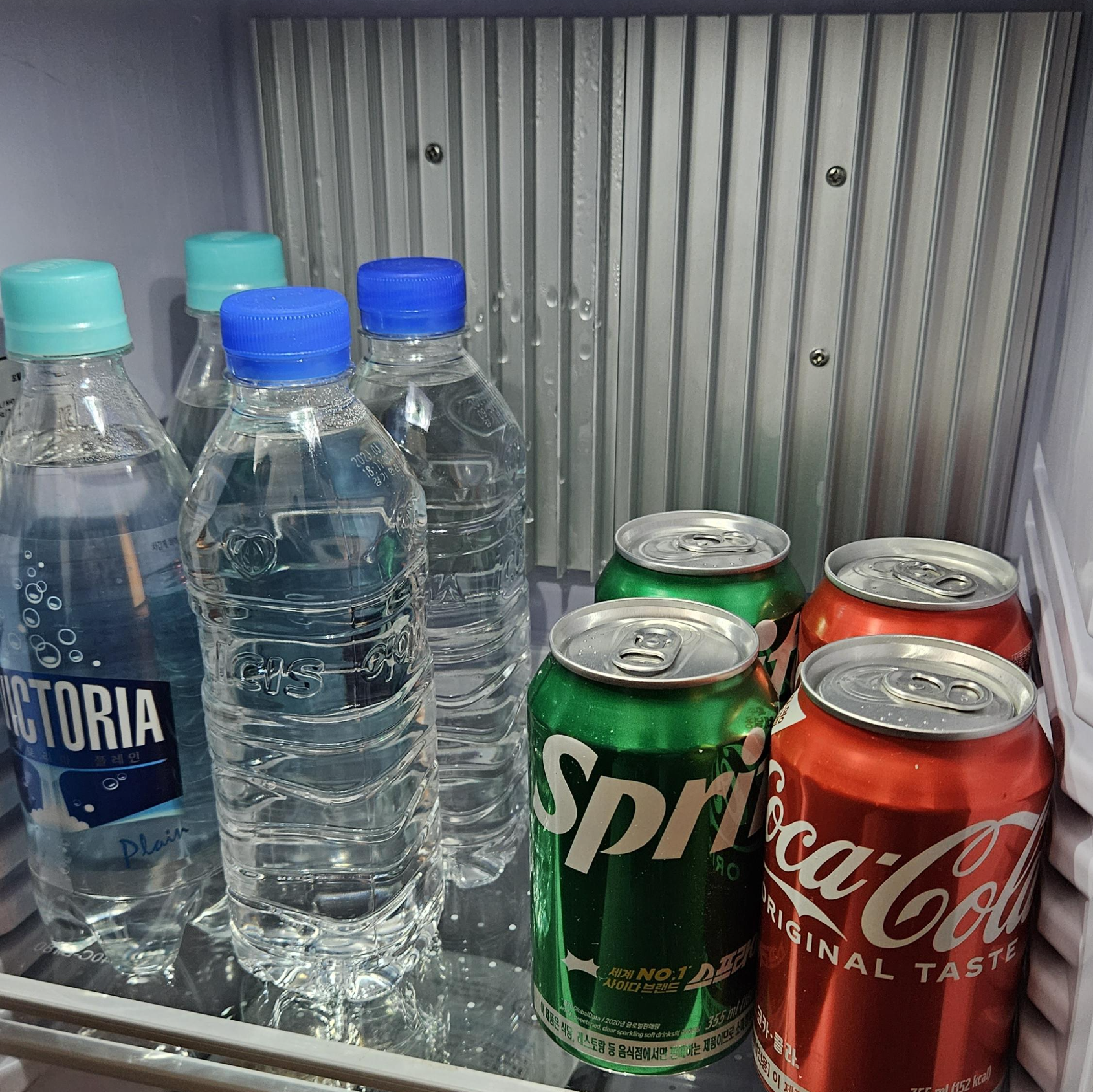 (c) Haedie's Doodles 호텔 오노마의 미니바는 물 2병, 탄산수 2병, 코카콜라 2캔, 스프라이트 2캔으로 채워져있고, 투숙기간내 1번에 한해 무료로 이용할 수 있다는 장점이 있습니다. 즉, 다시 미니바를 채워주지는 않는다는 말입니다. 하지만 생수는 요청하면 추가적으로 제공해주었습니다. 호텔 오픈 직후 같은 신세계 계열의 이마트의 PB상품인 노브랜드 콜라와 사이다를 제공해 이런 저런 말이 많았던 것에 비하면 좋은 변화입니다. 네스프레소 캡슐도 2종류가 각각 4개씩 제공됩니다. ▲ 목차로 돌아가기