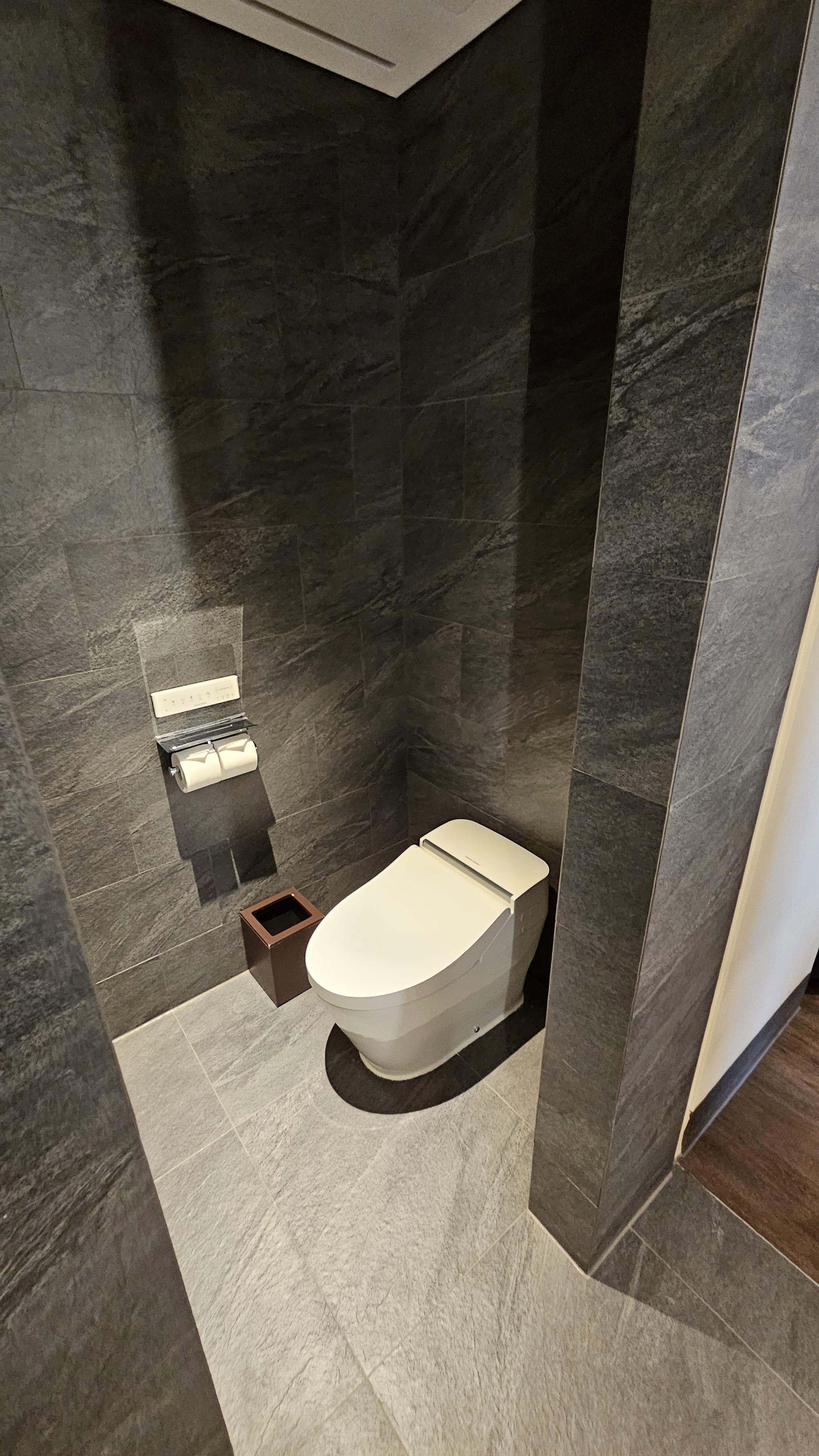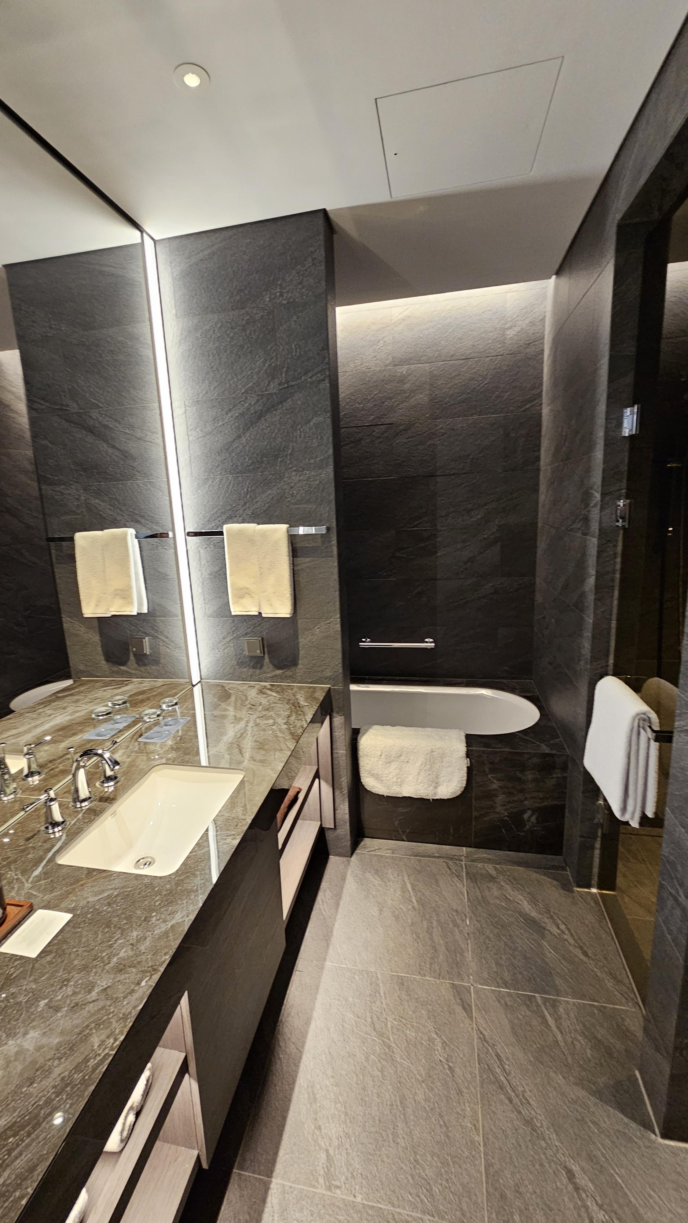 (c) Haedie's Doodles 화장실은 욕조와 샤워부스, 변기가 각각 독립된 공간에 위치해 있습니다. 크지는 않았지만 전체적으로 효율적으로 배치되어 있었고, 객실과 반대로 검은색 계열의 석재로 마감해 차분한 느낌을 줍니다. 세면대는 하나였지만, 충분히 넓어서 여러 사람이 챙겨온 세면도구를 놓아도 부족하지 않았습니다. 다만, 샤워부스의 문이 설계가 잘못되었는지 샤워부스의 문을 타고 흐르는 물이 샤워 부스 안으로 떨어지는게 아닌 샤워 부스 바깥, 세면대 앞으로 흘러나와 조금 아쉬웠습니다.▲ 목차로 돌아가기