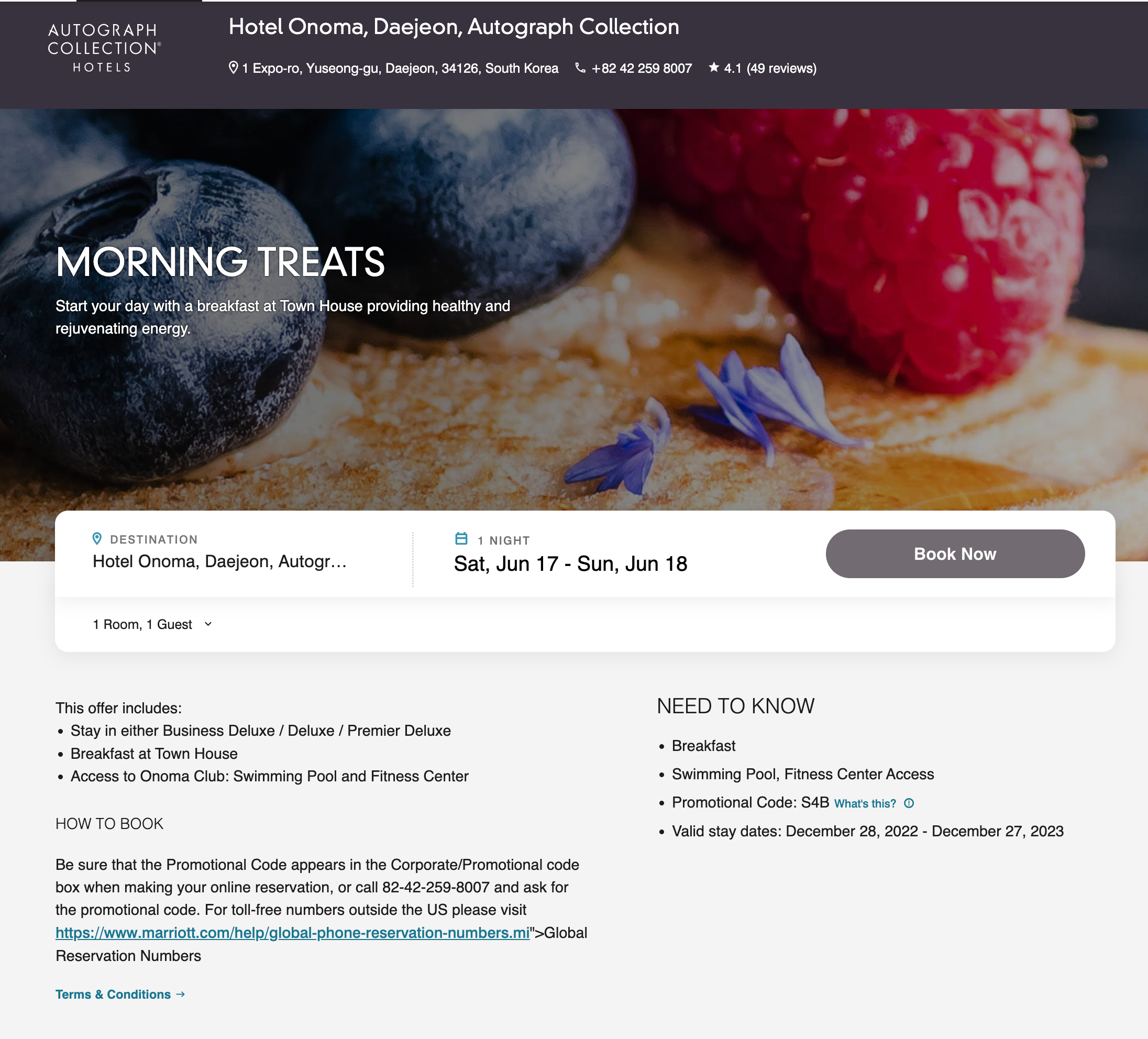 텔 오노마 대전 오토그래프 컬렉션의 모닝 트릿츠 패키지 (c) marriott.com 메리어트 공식 홈페이지에서는 아침 식사가 포함된 패키지를 판매합니다. 다만, 메리어트 본보이 프로그램을 이용하시지 않고 1회성으로 투숙하려고 하시는 분들은 야놀자나, 부킹닷컴과 같은 3rd party 온라인 플랫폼에서 예약하시는게 더 저렴할 수 있습니다. ▲ 목차로 돌아가기