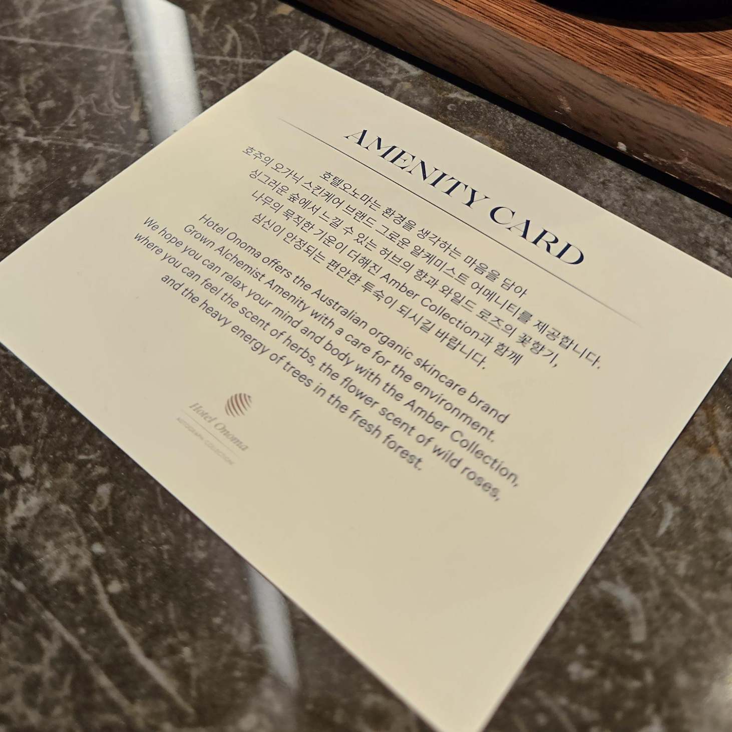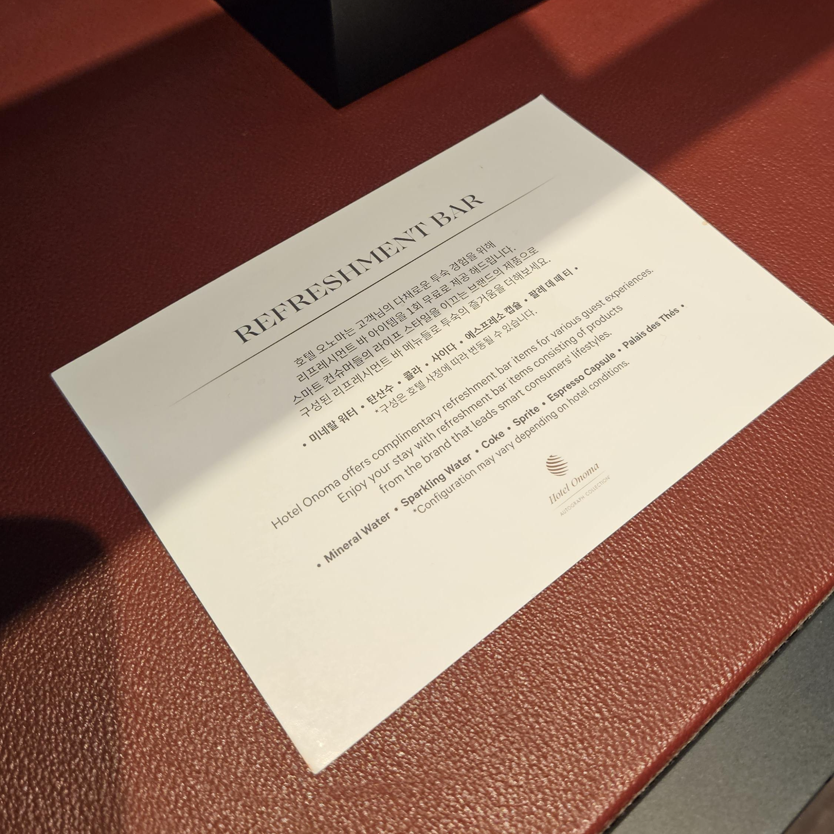 7층 체크인 로비는 크지 않은 공간에 체크인 카운터 2개와 컨시어지 카운터 1개가 위치해 있습니다. 호텔 오노마는 171개의 객실이 있다고 하는데, 객실 수에 비해 체크인 카운터가 넉넉치 않은 편입니다. 특히 특정 시간대에 체크인 고객이 몰리는 호텔 특성 상 성수기 체크인 시간 전후로는 줄이 꽤 길 것 길것으로 보입니다. 호텔 오노마와 관련된 많은 분들의 후기 중에 체크인 줄이 길었다는 후기가 꽤 많기도 하구요. 평일 낮시간이었던 4시 기준으로는 체크인 줄은 없었습니다. 제가 도착했을 때는 저 뿐이었고, 그 이후로 2팀 정도가 도착했습니다. 그래서 체크인 자체는 수월하게 진행되었습니다. 오픈한지 이제 2년 정도가 되어가다보니 직원들도 꽤 능수능란했습니다. 엘리트 멤버 베네핏도 잘 인지하고 있었습니다. ▲ 목차로 돌아가기