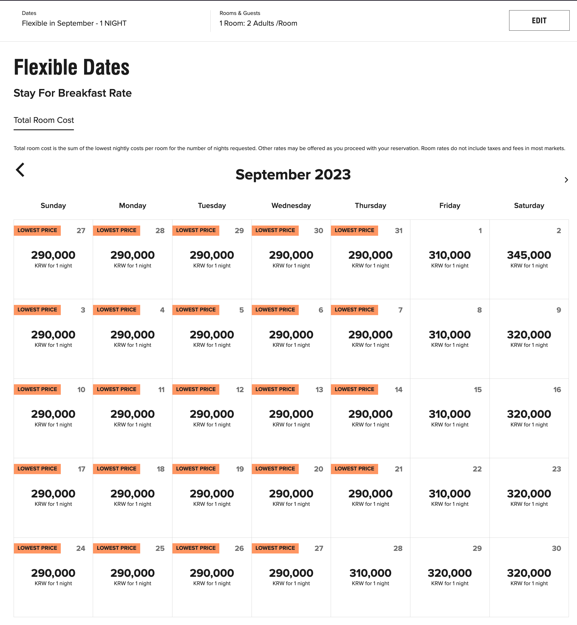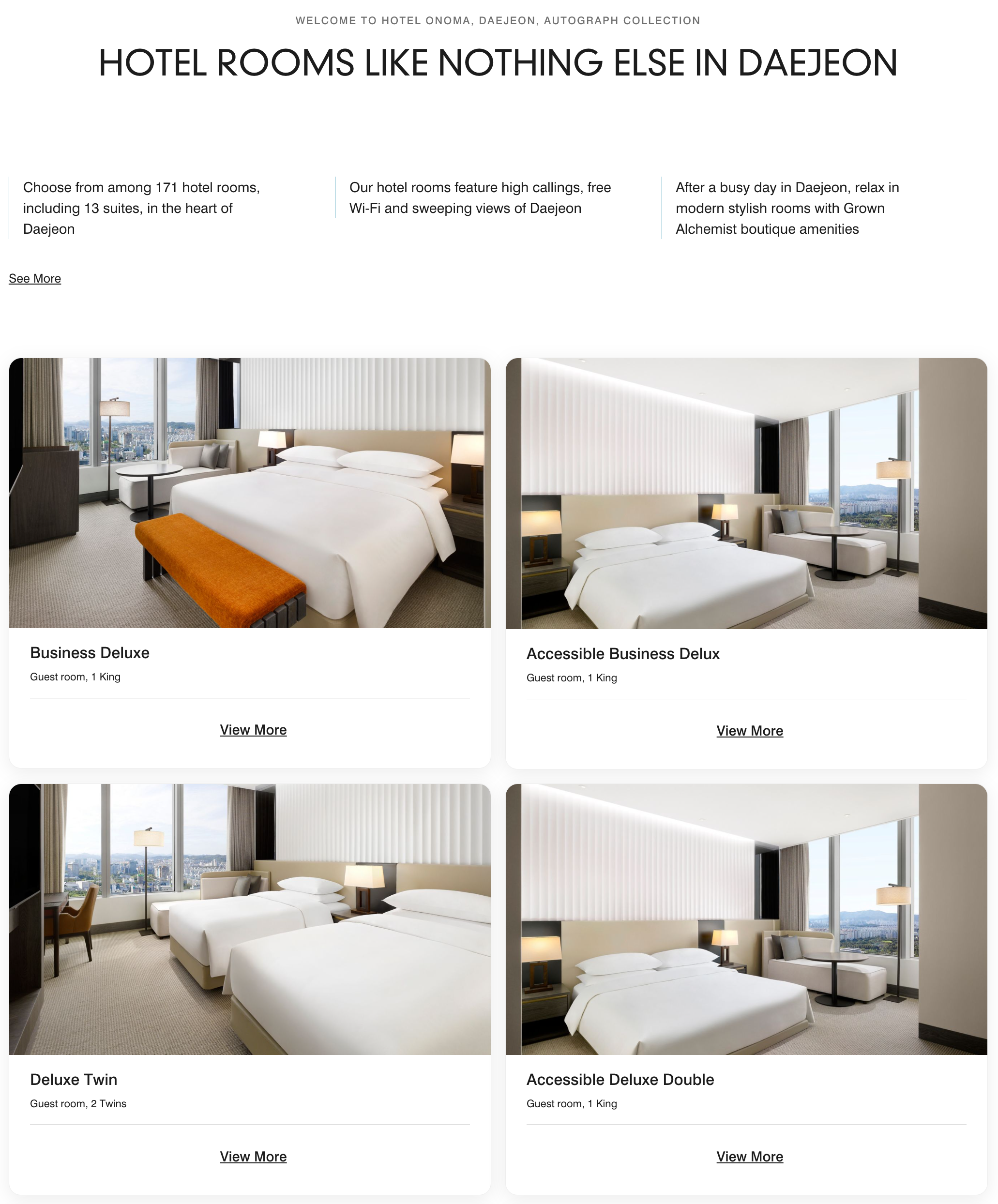 호텔 오노마 대전 오토그래프 컬렉션의 2023년 9월 유상숙박/포인트숙박 룸 레이트 (c) marriott.com 호텔 오노마 대전 오토그래프 컬렉션은 2021년에 개관한 호텔이며 2022년, 대전 충청 지역 최초로 5성급 자격을 획득한 호텔입니다. 하지만 위치나 지역 특성 때문인지, 다른 대도시에 위치한 5성급 호텔들보다는 저렴한 가격대를 형성하고 있습니다. 호텔 오노마의 가장 기본방인 비즈니스 디럭스 타입의 객실은 20만원 초반대에 형성되어 있습니다. 주말에도 20만원 초중반대에 가격이 형성되어 있어 주중과 주말의 룸 레이트 차이가 많이 나지 않기도 합니다. 또한 명절 연휴와 같은 성수기의 경우에도 숙박 3~4달 전에 예약만 하면 비수기에 비해 크게 비싸지 않은 가격인 20만원 중반대부터 예약을 할 수 있지만, 예약 시기나 수요에 따라 최고 40만원 후반대까지 룸 레이트가 올라가기도 합니다. (모두 비즈니스 디럭스 타입 객실 기준입니다). 위의 스크린 샷에서 9월 28, 29, 30일 같은 경우는 명절 연휴임에도 3달 전인 지금 룸 레이트가 23만원대부터 시작하는 것을 볼 수 있습니다.