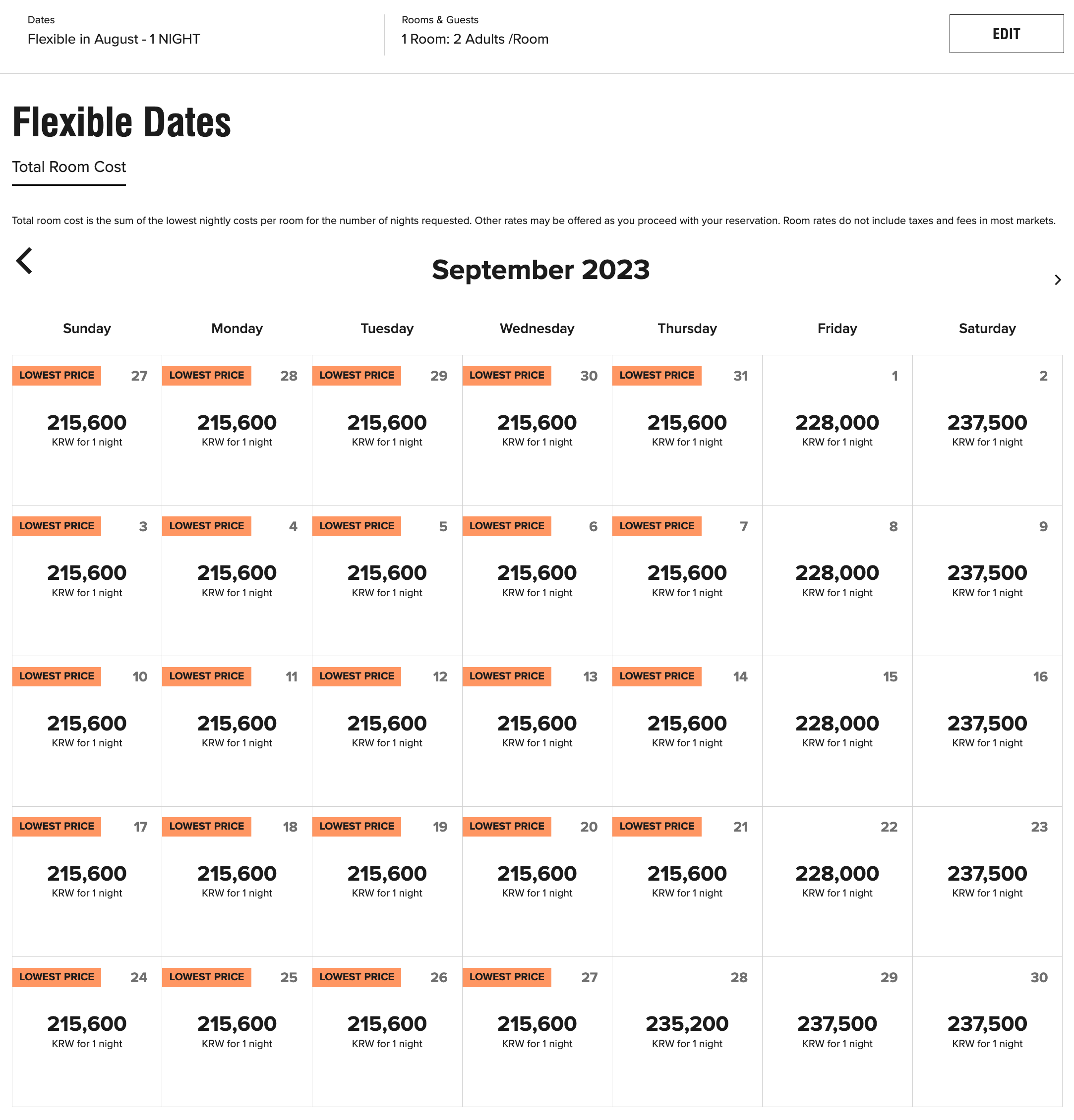 호텔 오노마 대전 오토그래프 컬렉션의 2023년 9월 유상숙박/포인트숙박 룸 레이트 (c) marriott.com 호텔 오노마 대전 오토그래프 컬렉션은 2021년에 개관한 호텔이며 2022년, 대전 충청 지역 최초로 5성급 자격을 획득한 호텔입니다. 하지만 위치나 지역 특성 때문인지, 다른 대도시에 위치한 5성급 호텔들보다는 저렴한 가격대를 형성하고 있습니다. 호텔 오노마의 가장 기본방인 비즈니스 디럭스 타입의 객실은 20만원 초반대에 형성되어 있습니다. 주말에도 20만원 초중반대에 가격이 형성되어 있어 주중과 주말의 룸 레이트 차이가 많이 나지 않기도 합니다. 또한 명절 연휴와 같은 성수기의 경우에도 숙박 3~4달 전에 예약만 하면 비수기에 비해 크게 비싸지 않은 가격인 20만원 중반대부터 예약을 할 수 있지만, 예약 시기나 수요에 따라 최고 40만원 후반대까지 룸 레이트가 올라가기도 합니다. (모두 비즈니스 디럭스 타입 객실 기준입니다). 위의 스크린 샷에서 9월 28, 29, 30일 같은 경우는 명절 연휴임에도 3달 전인 지금 룸 레이트가 23만원대부터 시작하는 것을 볼 수 있습니다.