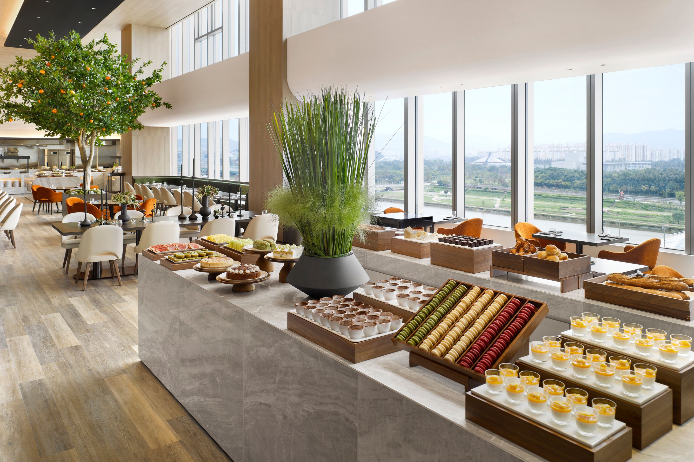 호텔 오노마 대전 오토그래프 컬렉션의 조식당, 타운하우스 (c) marriott.com 조식은 아침 6시 30분부터 10시까지 체크인 층인 7층에 위치한 타운하우스에서 이루어집니다. 조식 가격은 성인기준 38000원 입니다. 객실과 비교해 저층에 위치해서인지 건물 바로 앞에 있는 갑천을 조금더 현실감있는 높이에서 조망할 수 있습니다. 두개 층을 터서 만들었는지 천장이 꽤 높아서 기다란 형태의 식당이었음에도 의외로 공간감이 느껴졌습니다. 조식은 종류가 다양하지는 않았지만 메뉴 하나하나가 괜찮은 퀄리티를 보여주어 꽤나 만족스러웠습니다. 특히 순두부처럼 호텔 조식 뷔페에서 쉽게 보기 힘든 메뉴들도 있다는 점이 좋았습니다. 베이커리류도 종류별로 구색을 잘 갖추어 놓았고, 과일도 네다섯가지 종류가 제공되었습니다. 라이브 누들 바에서는 직접 선택한 재료로 만든 쌀국수를, 에그 스테이션에서는 원하는 방식으로 조리한 계란요리가 제공됩니다. 한식으로는 국과 명란젓, 나물류등이 제공되어 어른들과 오기에도 좋아 보였으며 햄과 훈제연어도 제공되었습니다.