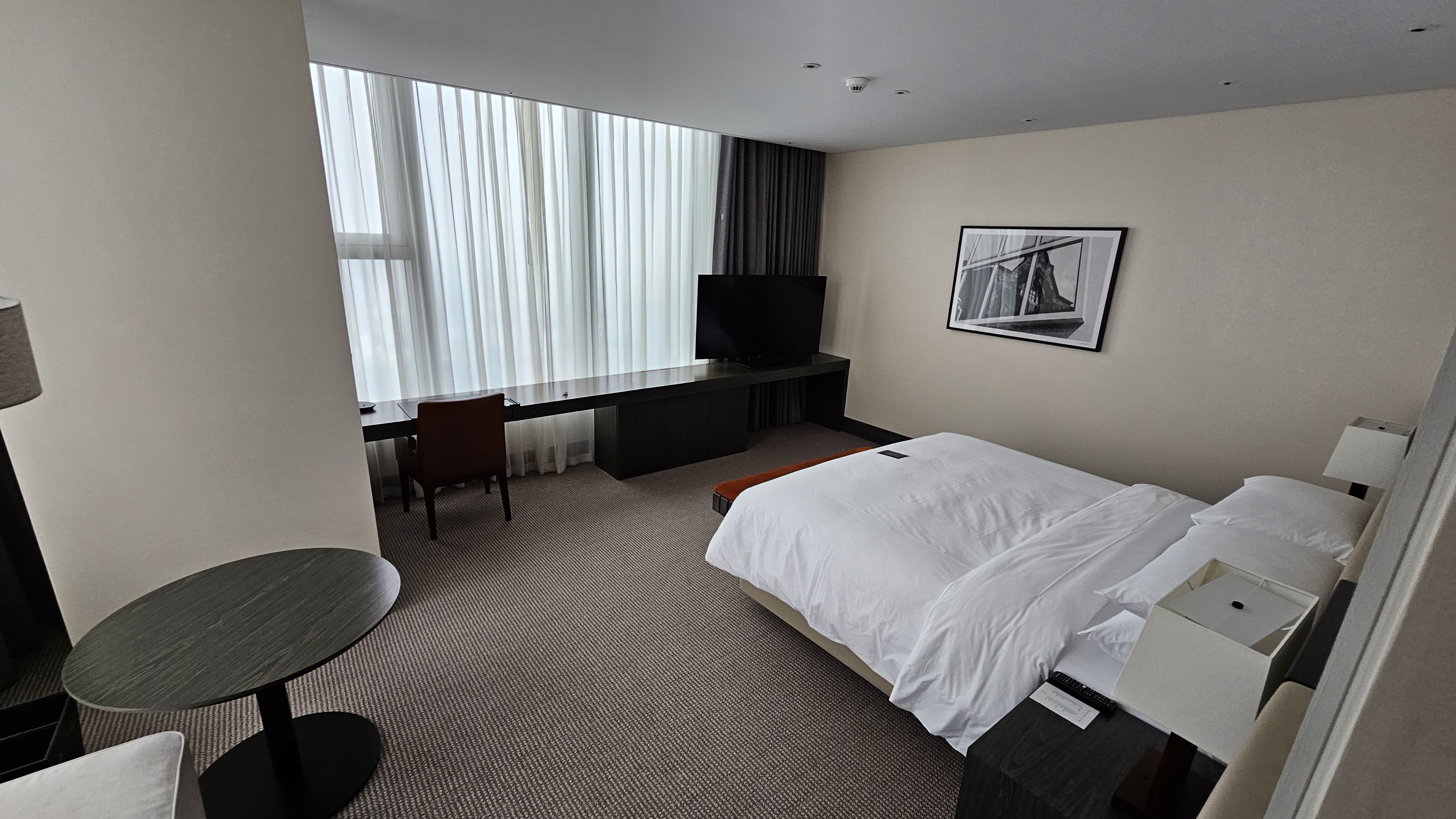 (c) Haedie's Doodles 2021년에 새로 개관한 호텔 답게 방과 침구 모두 깔끔하게 관리된 상태였습니다. 프리미어 코너룸의 경우 객실 한쪽에 거대한 기둥이 자리잡고 있는데 객실이 15평 정도로 넓은 만큼 크게 거슬리지는 않았습니다. 현관 바로 앞에는 옷장, 캐리어를 놓을 수 있는 선반이 자리잡고 있고 옷장 반대편으로는 화장실과 미니바가 자리잡고 있습니다. 입구의 짧은 복도를 지나면 오른쪽에 킹 사이즈 침대가 놓여있고 왼편에는 편하게 않으면 두명, 최대 세명까지 않을 수 있어 보이는 쇼파가 자리잡고 있습니다.
