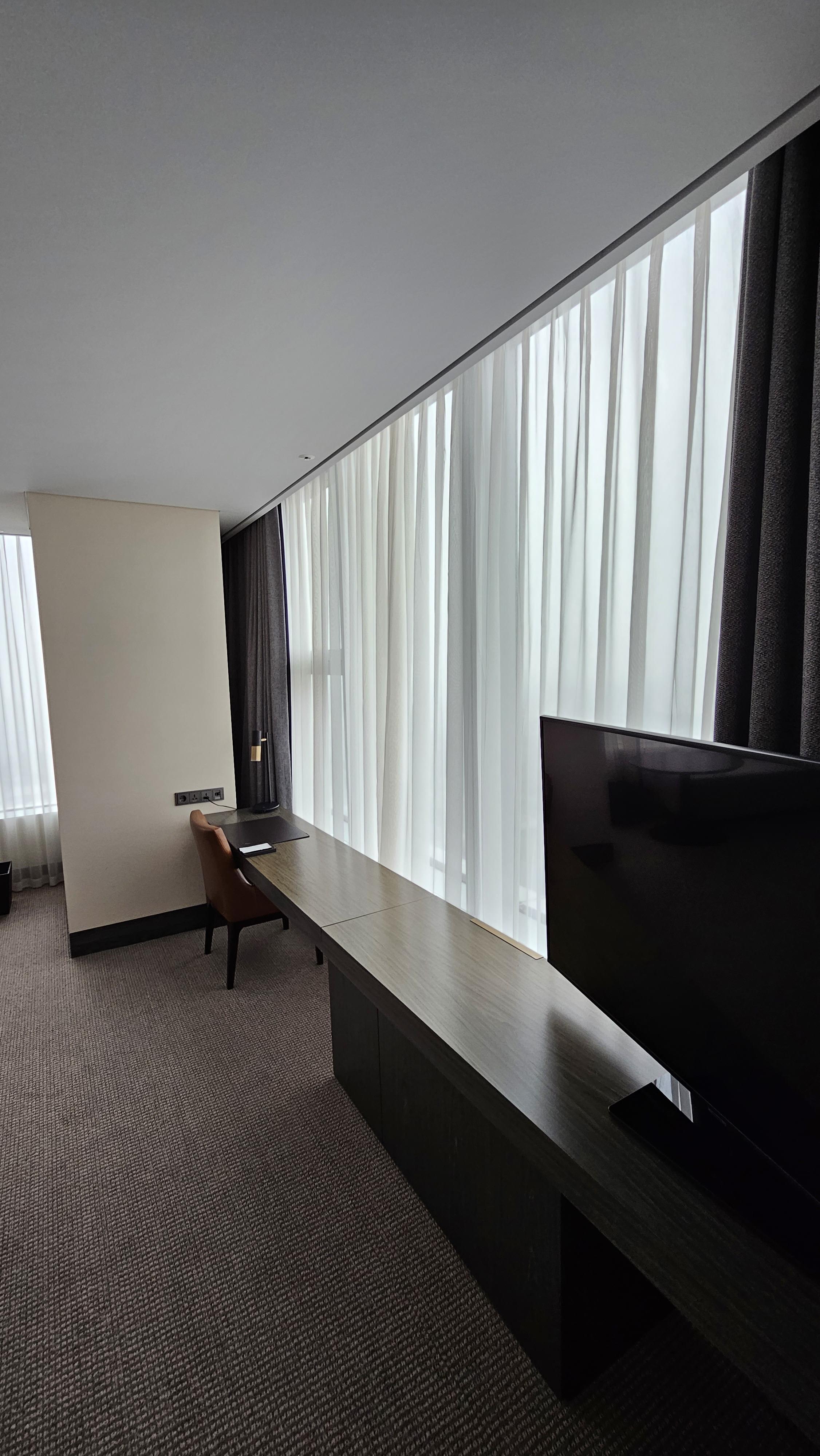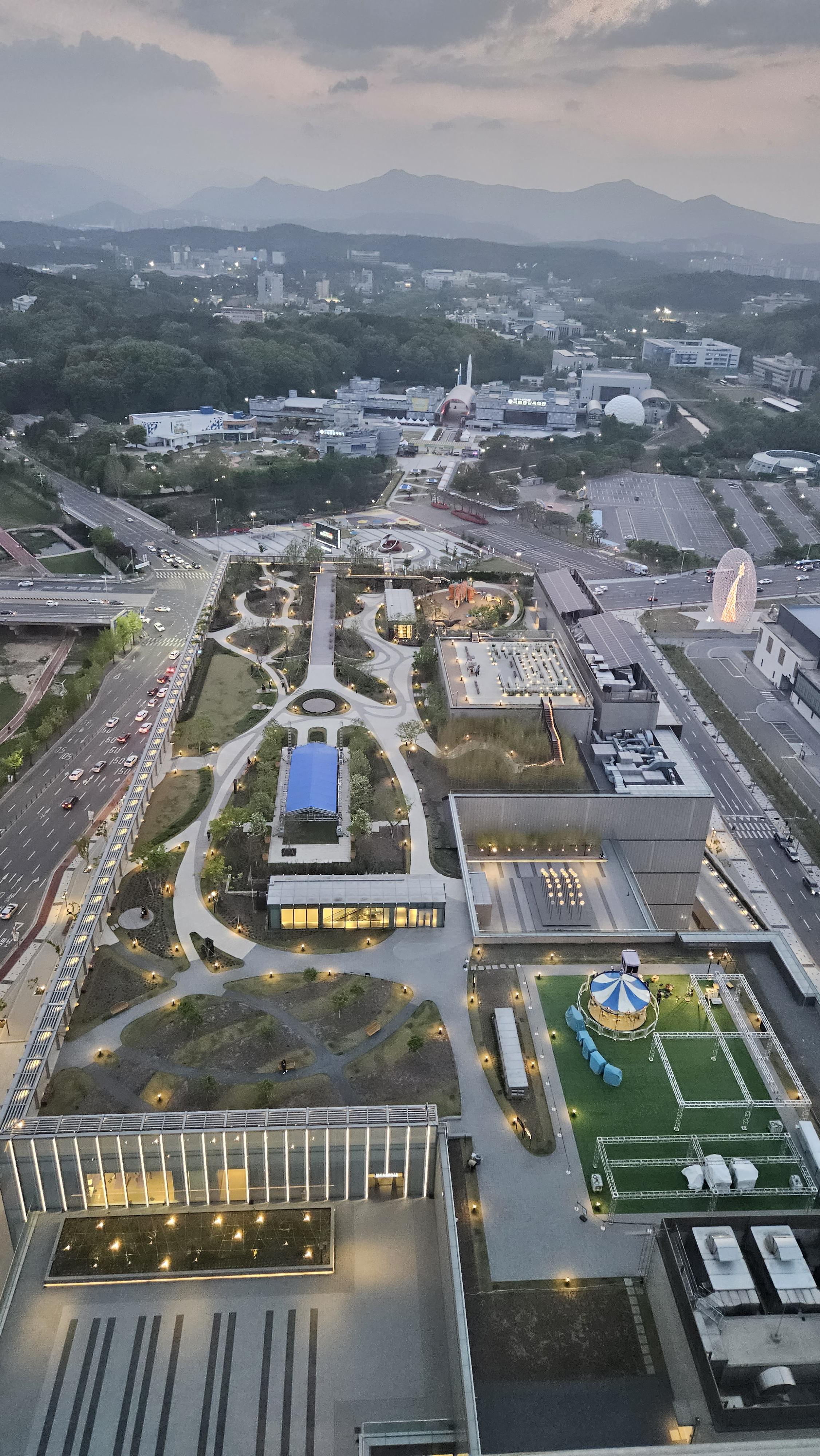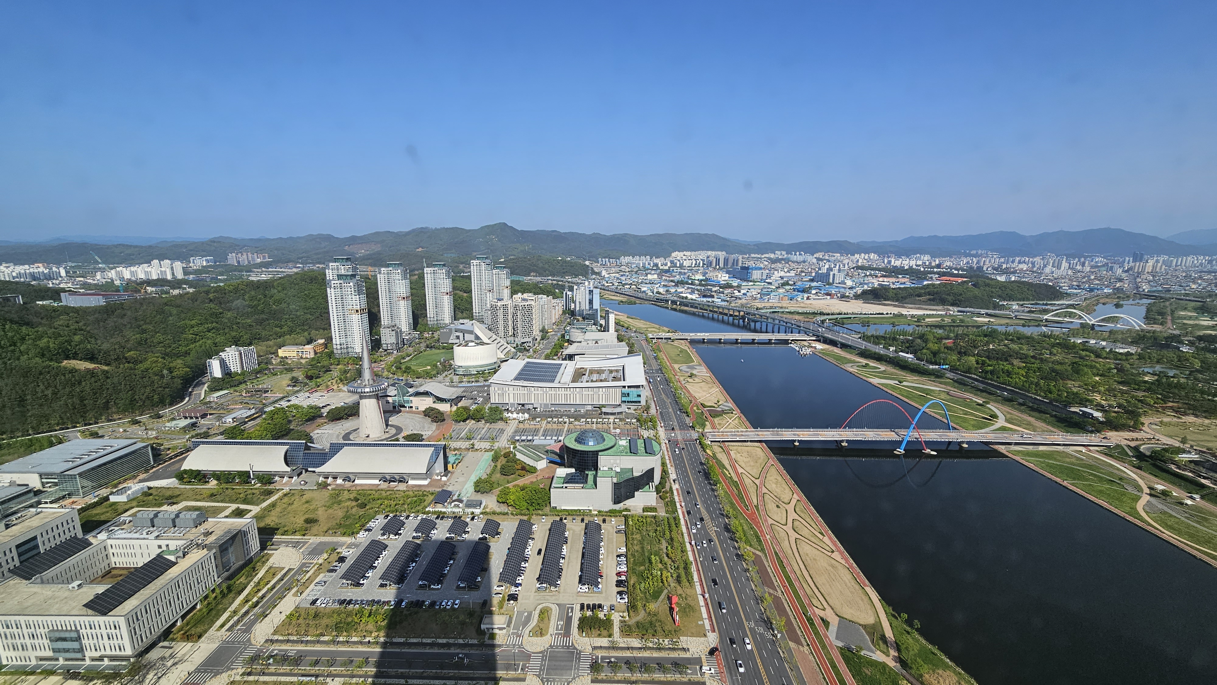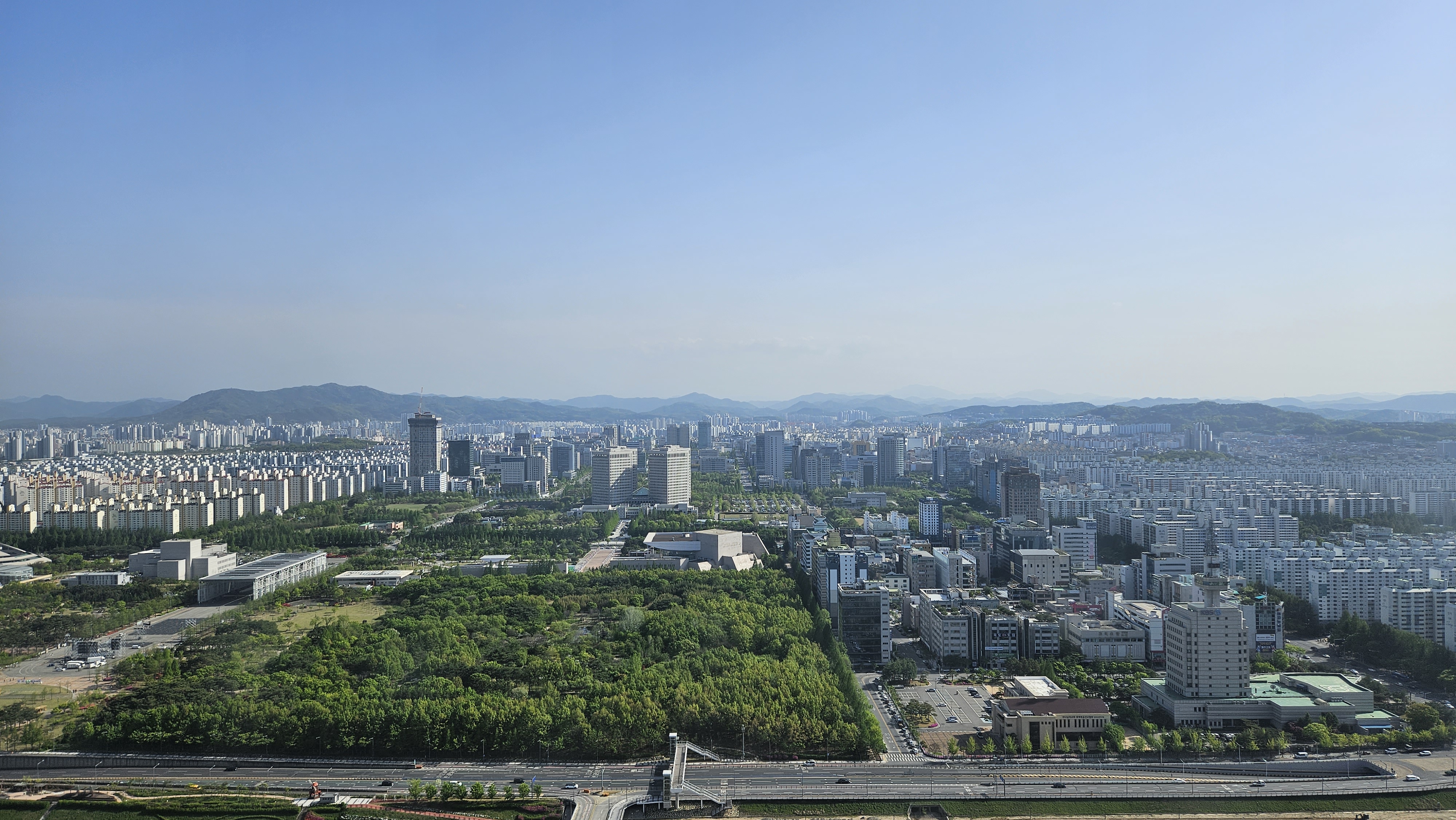 호텔 오노마의 동쪽(좌), 남쪽(우) 방향 뷰 (c) Haedie's Doodles 제가 묵은 프리미어 코너방은 최상층인 36층에 위치해 있었습니다. 타워동의 남동쪽 코너에 위치한 방으로 아침부터 저녁까지 하루종일 햇빛이 방으로 잘 들어온다는 장점이 있었습니다. 햇빛은 잘 들어오지만 커튼은 암막커튼이어서 커튼을 걷지 않는 이상 아침에 햇빛 때문에 깨는 일은 없었습니다. 고층에 위치해 있음에도 바람소리나 다른 거슬리는 소리와 더불어 소음이 아예 없었으며 객실간 방음도 잘 되어있어서 묵는 내내 쾌적했습니다. 남동쪽 코너 방에서는 동쪽으로는 엑스포 과학공원과 엑스포 다리, 스마트시티와 계족산이 보였고, 남쪽으로는 바로 앞의 한밭수목원과 대전예술의전당과 더불어, 대전시청, 둔산동 일대가 보이는 전망이었습니다. 아무래도 북쪽은 남쪽에 비해 산이 더 가깝게 있어 북쪽보다는 동, 서, 남쪽 방향의 객실에서의 전망이 더 좋을 것 같습니다.