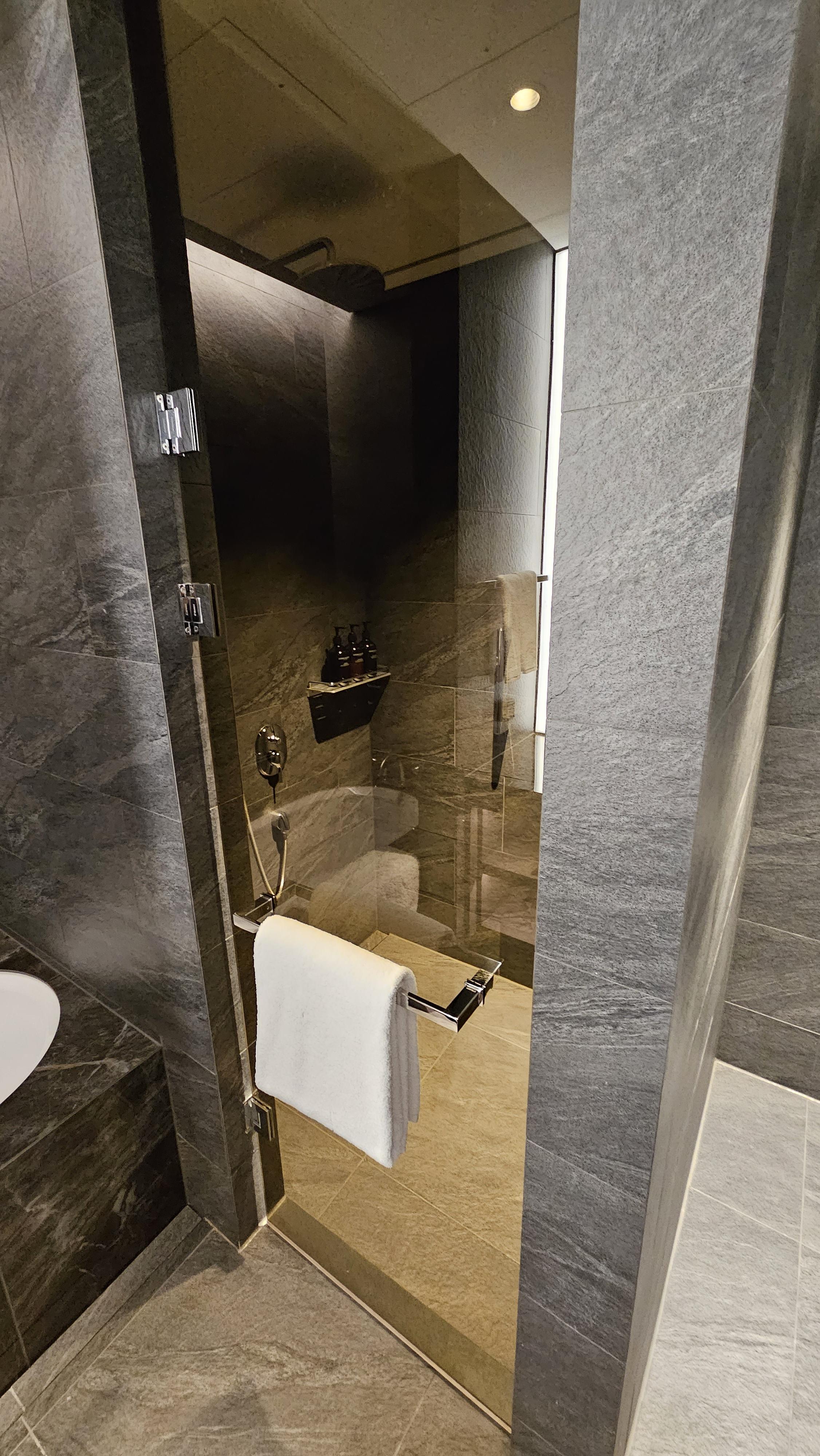 (c) Haedie's Doodles 화장실은 욕조와 샤워부스, 변기가 각각 독립된 공간에 위치해 있습니다. 크지는 않았지만 전체적으로 효율적으로 배치되어 있었고, 객실과 반대로 검은색 계열의 석재로 마감해 차분한 느낌을 줍니다. 세면대는 하나였지만, 충분히 넓어서 여러 사람이 챙겨온 세면도구를 놓아도 부족하지 않았습니다. 다만, 샤워부스의 문이 설계가 잘못되었는지 샤워부스의 문을 타고 흐르는 물이 샤워 부스 안으로 떨어지는게 아닌 샤워 부스 바깥, 세면대 앞으로 흘러나와 조금 아쉬웠습니다.▲ 목차로 돌아가기