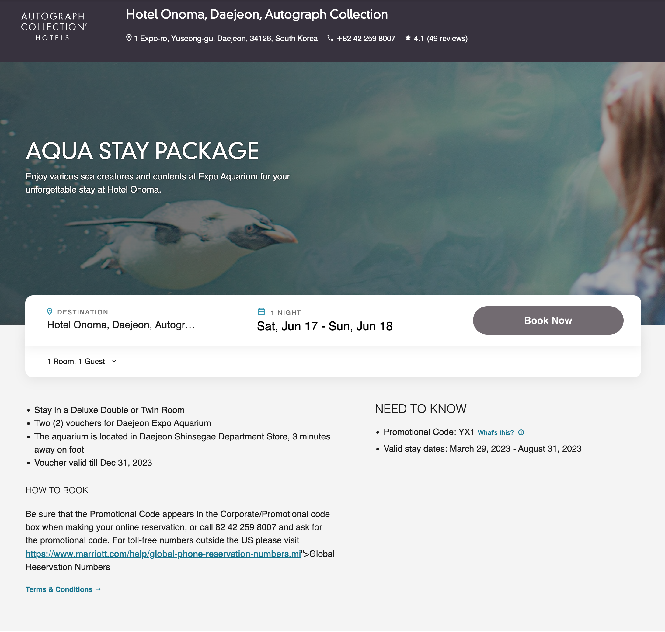 텔 오노마 대전 오토그래프 컬렉션의 모닝 트릿츠 패키지 (c) marriott.com 메리어트 공식 홈페이지에서는 아침 식사가 포함된 패키지를 판매합니다. 다만, 메리어트 본보이 프로그램을 이용하시지 않고 1회성으로 투숙하려고 하시는 분들은 야놀자나, 부킹닷컴과 같은 3rd party 온라인 플랫폼에서 예약하시는게 더 저렴할 수 있습니다. ▲ 목차로 돌아가기