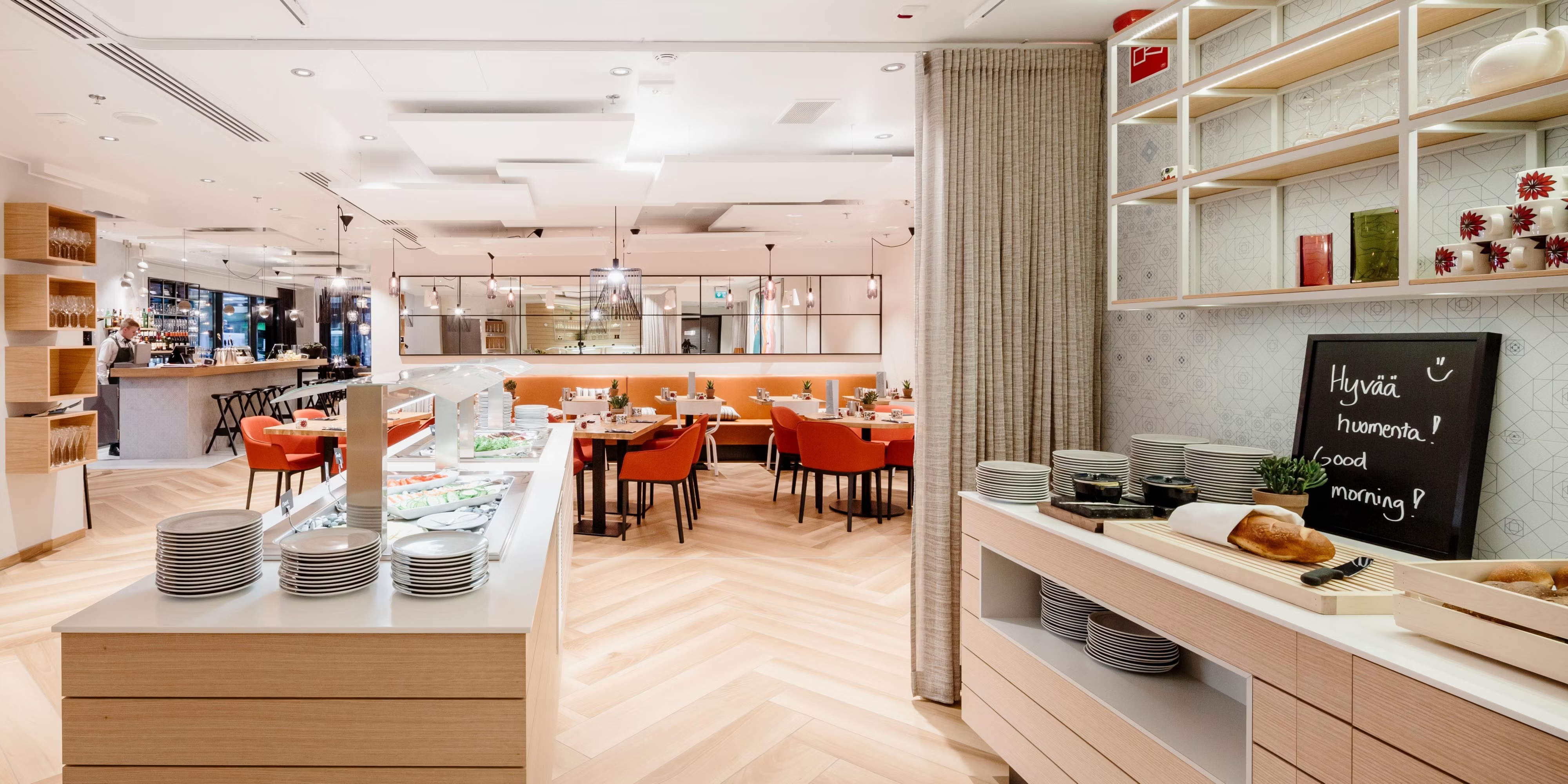 호텔 인디고 헬싱키 조식당, image courtesy of Hotel Indigo Helsinki 저는 호텔 인디고 헬싱키에서 머무는 동안 조식은 이용하지 않았지만, 이 호텔의 조식은 1층에 위치한 식당 Bröd에서 진행됩니다. 조식은 주중에는 오전 7시부터 오전 10시까지, 주말에는 오전 7시 30분에서 오전 11시까지 진행되고 그 이외의 시간에는 점심과 저녁을 서빙합니다. 조식은 뷔페식으로 제공된다고 합니다.