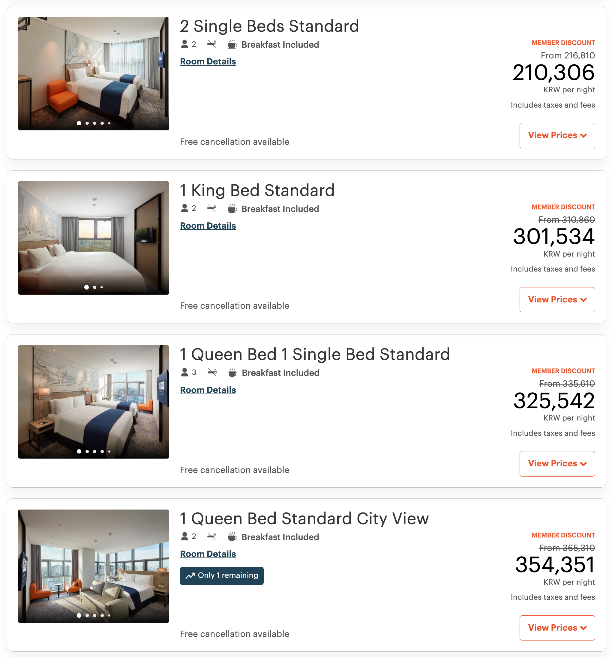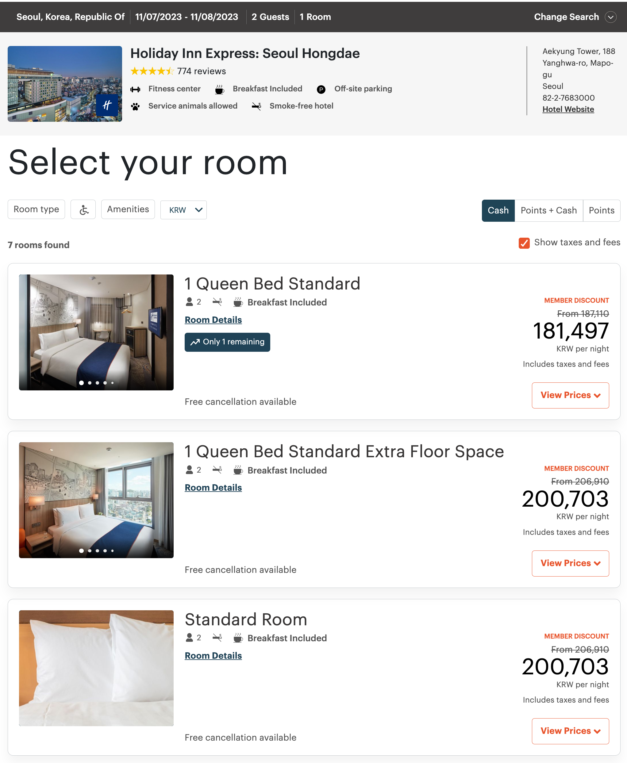 홀리데이 인 익스프레스 서울 홍대 어워드 스테이 룸 레이트 (c) ihg.com 이번 숙박은 51,000 포인트로 1 Queen Bed Standard 4박을 예약 했습니다. 체이스 IHG 리워드 프리미어 카드 (Chase IHG Rewards Premier Credit Card)의 베네핏인 포인트로 4연박 숙박 시 4박째는 무료 혜택이 적용되어 첫 3박이 51,000포인트 + 마지막 4박 무료였고, 첫 3박의 1박당 평균 가격은 17,000 포인트 였습니다. 포인트로 예약시 1 Queen Bed Standard 타입의 룸만 예약 가능하며 제가 예약했던 가격인 17,000 포인트가 포인트 숙박의 시작점이라고 할 수 있습니다. 성수기 주말에는 최고 2만 포인트 후반대까지도 올라가며 이마저도 예약이 빨리 차기 때문에 성수기 포인트 예약의 경우 서둘러서 숙박 2~3달 전에는 예약하시는걸 추천드립니다.
