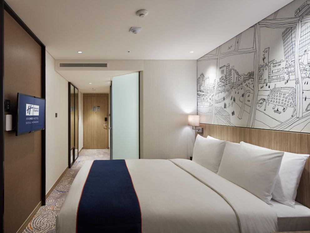 홀리데이 인 익스프레스 서울 홍대 1퀸 베드 스탠다드 엑스트라 플로어 스페이스 (c) ihg.com 홀리데이 인 익스프레스 서울 홍대의 1퀸 베드 스탠다드 엑스트라 플로어 스페이스룸은 2명이 쓰기에 아주 작다고도, 그렇다고 충분하다고 말하기도 애매한 크기입니다. 두명이서 캐리온 캐리어 1개씩 가져온다고 하면 부족하지는 않은 정도의 크기입니다. 다만 두명이서 27인치 캐리어 2개를 가져온다면 방이 작다고 느껴질 수 있습니다. 침대 옆으로는 작은 1인용 쇼파가 있고, 간의 테이블 정도라고 부를 만한 사이즈의 아주 작은 책상이 있습니다. 뷰는 서강대역 방향 뷰로 호텔 바로 앞에 고층건물이 위치하고 있지 않아 답답하지 않고 탁 트여있는 모습이었습니다. 화장실은 욕조 없이 샤워부스만 따로 있는 형태이고, 세면대와 변기가 나란히 붙어있는 형태입니다. 지어진지 오래 된 호텔은 아니라 전반적으로 깔끔하게 유지된 모습이었습니다. 각 방 사이의 방음은 잘 되어 있는 편이나 화장실에서는 간혹 옆 방의 대화소리가 들릴 때도 있었습니다. ▲ 목차로 돌아가기