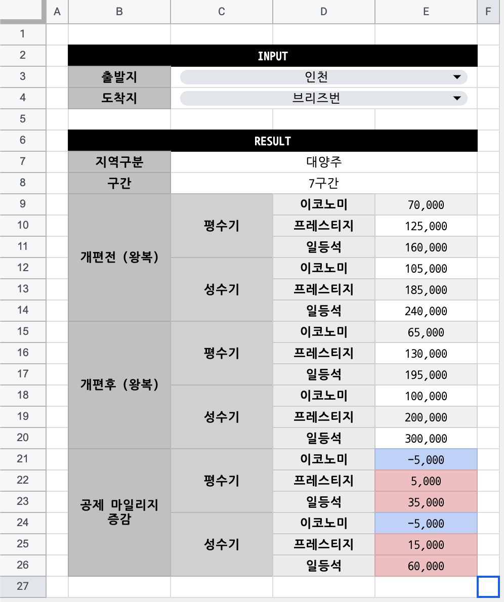 '노선선택비교' 탭 이 글을 작성하기 위해 만든 마일리지 차감차트를 공유합니다. 위에서도 언급했듯, 직접 손으로 복사해 붙여넣기 한 것이기 때문에 오탈차나 정확하지 않은 정보가 있을 수 있으니, 정확한 정보는 대한항공 웹사이트에서 확인하시길 바랍니다. 이 구글시트에는 2개의 탭이 있습니다. 하나는 '비교테이블'탭으로 위에서 보셨던 대한항공이 공개한 125개 구간에 대한 개편 전/후, 성수기/평수기, 이코노미/프레스티지/일등석의 공제 마일리지를 한 탭에서 보실 수 있습니다. 다른 하나는 '노선선택비교'입니다. 출발지와 도착지를 선택하시면 구간에 따른 공제 마일리지 변화를 간편히 보실 수 있습니다. 해당 구글시트는 여기를 눌러 확인하세요.