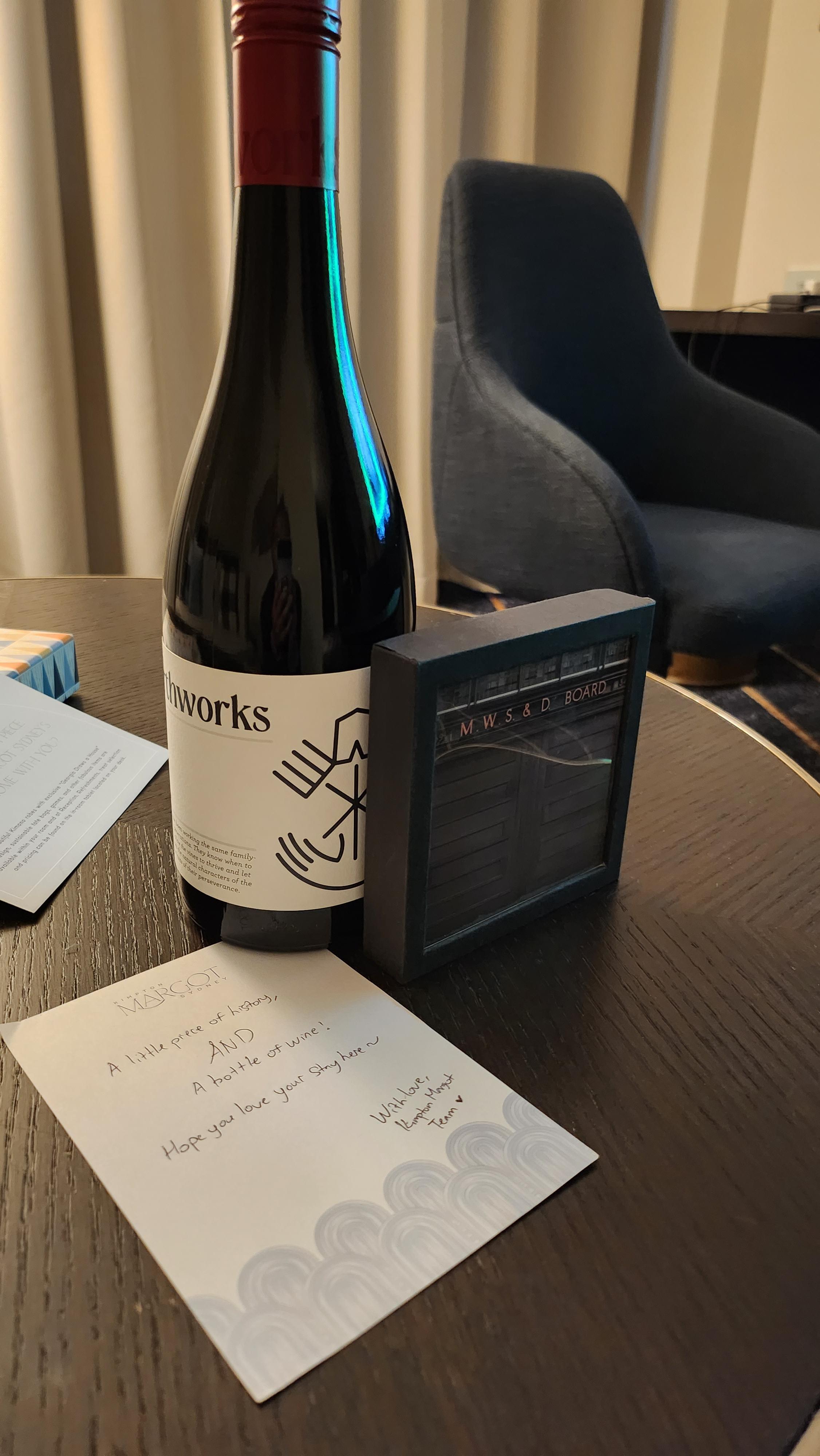 The Snuggle is Real를 외치고 받은 선물 체크인 과정은 깔끔합니다. 체크인을 하면서 올 겨울 킴튼의 시크릿 패스코드인 "The Snuggle is Real" 을 조용히 속삭여봅니다. 체크인 담당자가 그걸 알아듣고는 방으로 선물을 보내주겠다고 합니다. 패스코드의 뜻이 궁금해 구글링을 해보니 사랑하는 사람이나 좋아하는 담요에 싸여 느끼는 친밀감, 따뜻함, 편안함을 의미한다고 합니다. 아무래도 겨울이다 보니 킴튼에서 그러한 느낌을 받고 가라는 의미인 것 같습니다6. 물론 시드니는 여름이지만. 패스코드 기프트로 와인 한 병과 코스터를 받습니다. 이 코스터에는 과거 킴튼 마고 시드니 건물의 히스토리를 보여주는 사진들이 있는데, 코스터의 퀄리티가 꽤 좋을뿐더러, 역사적인 건물에서 숙박한다는 느낌도 주어 참 맘에 드는 선물입니다.