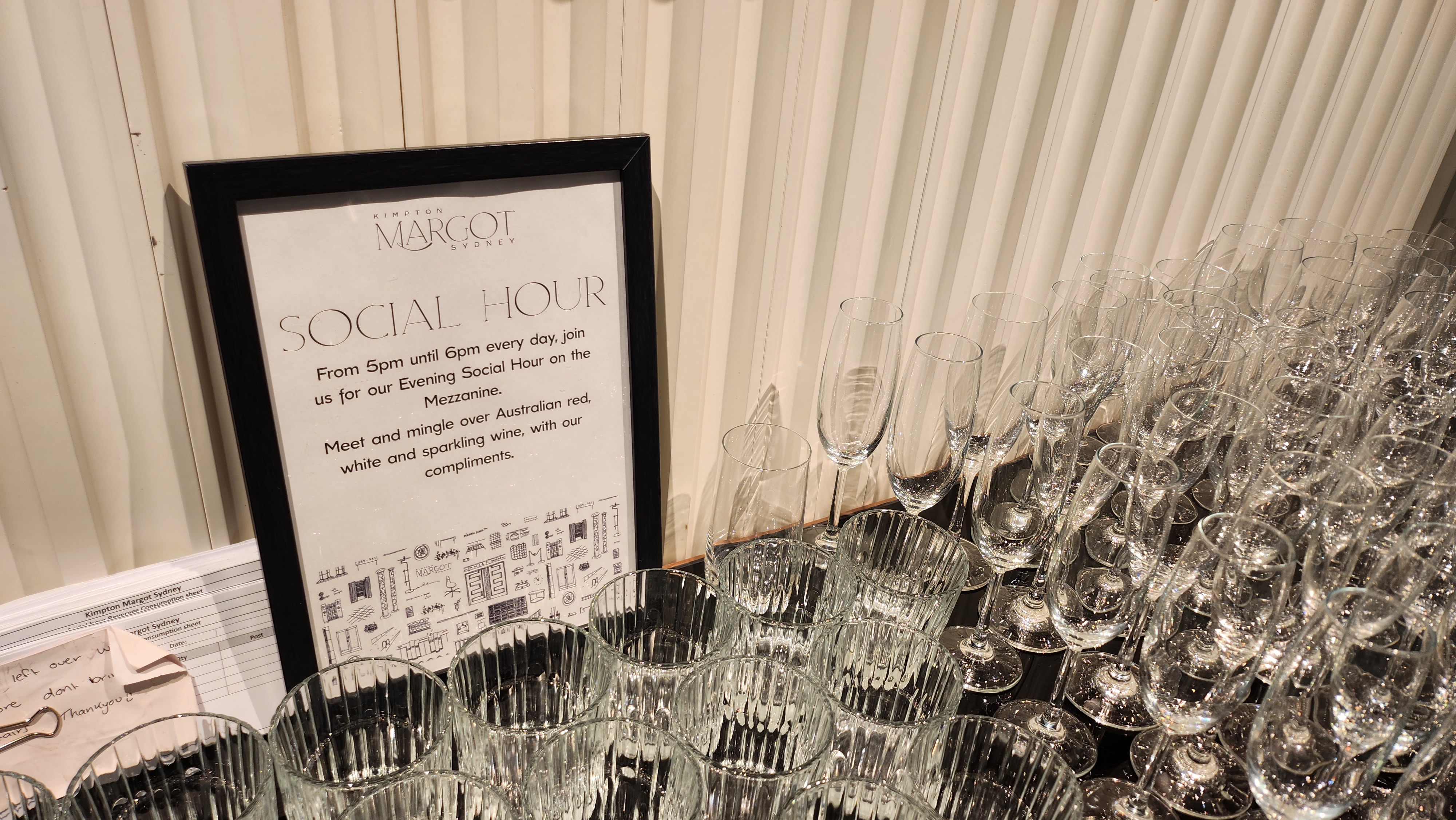 킴튼 호텔의 시그니처인 소셜 아워가 열리는 Mezzanine 층 킴튼 호텔의 시그니처 중 하나인 소셜아워는 그라운드층과 1층 사이에 있는 Mezzanine 층에서 열립니다. 킴튼 마고 시드니에서는 호주에서 생산된 와인을 소셜아워때 제공합니다. 웹사이트에서 봤던 Margot Cocktail(마고 칵테일)은 코빼기도 보이지 않았는데, 나중에 돌이켜보니 마고 칵테일은 왜 제공되지 않는지 한번 물어볼 껄 하는 생각이 들었습니다. 더불어 그렇게 목을 매던 스파도 결국 이 호텔에서는 이용하지 않고 지나갔습니다. 스파는 내년에 방콕에서 원없이 해야겠습니다.
